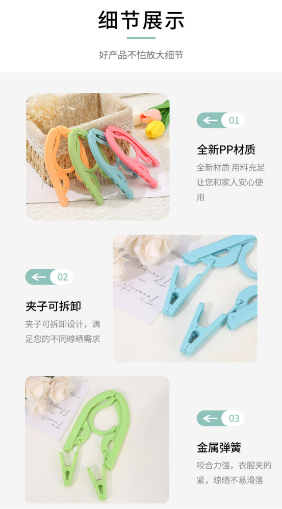 可以折三折的折叠衣架, 每支配备两个夹子,完美适用于各种晾晒需求 不仅满足成人出行晾晒需要 调整长度后儿童衣物也可自如挂上