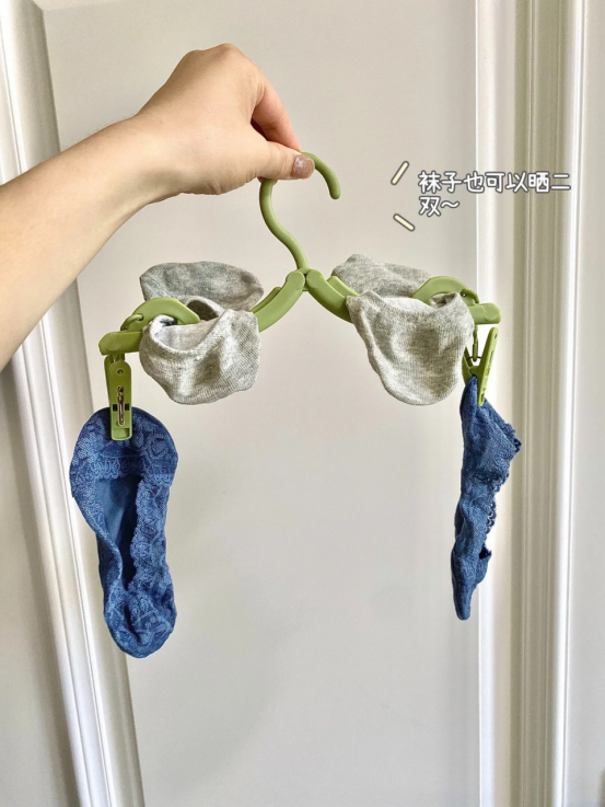 💥💥💥本人亲身使用心得: 折叠带夹子的设计既节省了收纳空间 也让袜子、内衣裤或者吊带、 背心这种平时在家晾晒都很容易滑落的衣物挂得更有安全感了 两边伸长的位置可回折 有一个凹槽 晒无袖衣物就有一重保险 大风对着吹也没那么轻易掉落 哪怕是鞋带! 也是可以挂在凹槽里或者夹在两个小夹子上 可使用范围真的超广 就没它没法挂、挂不住的