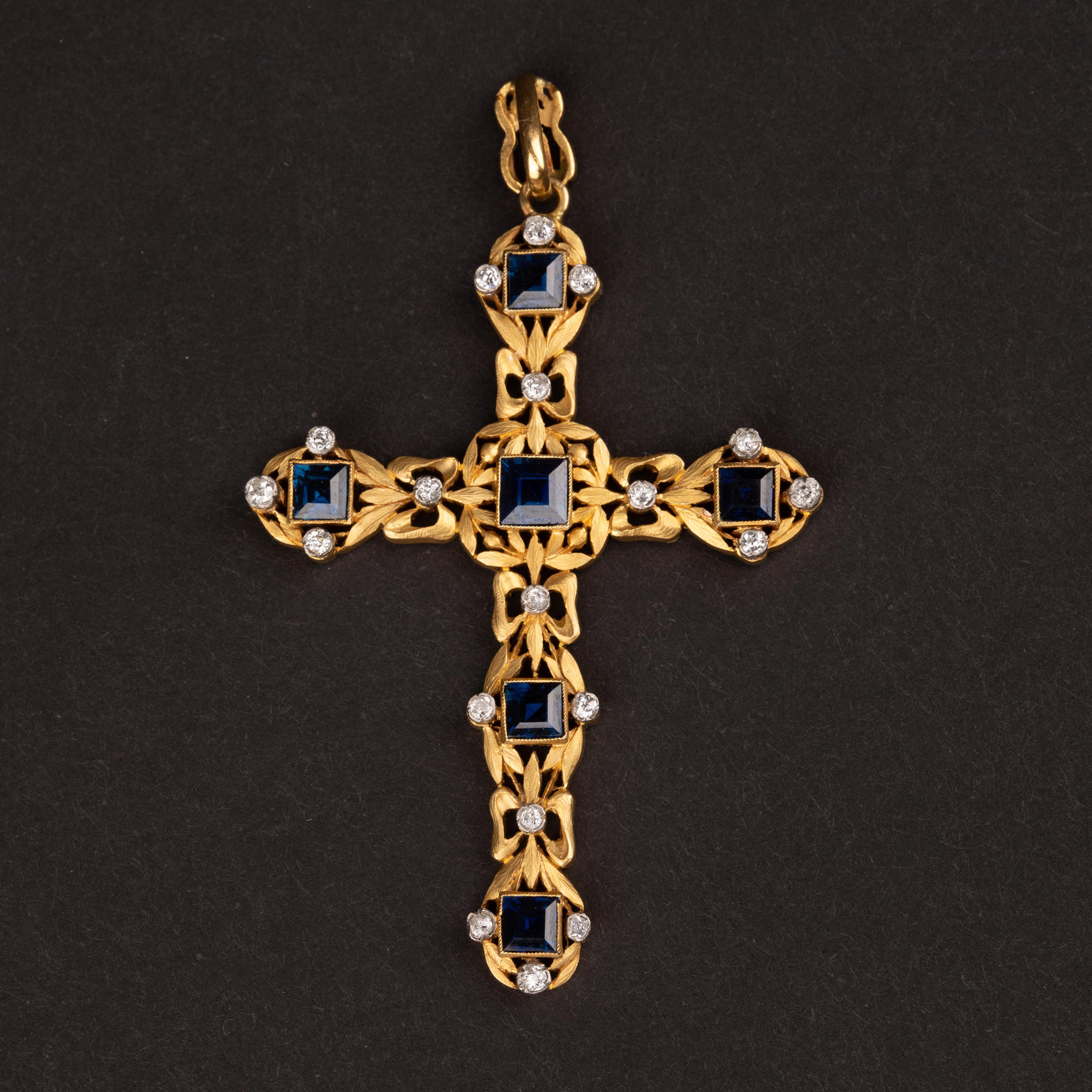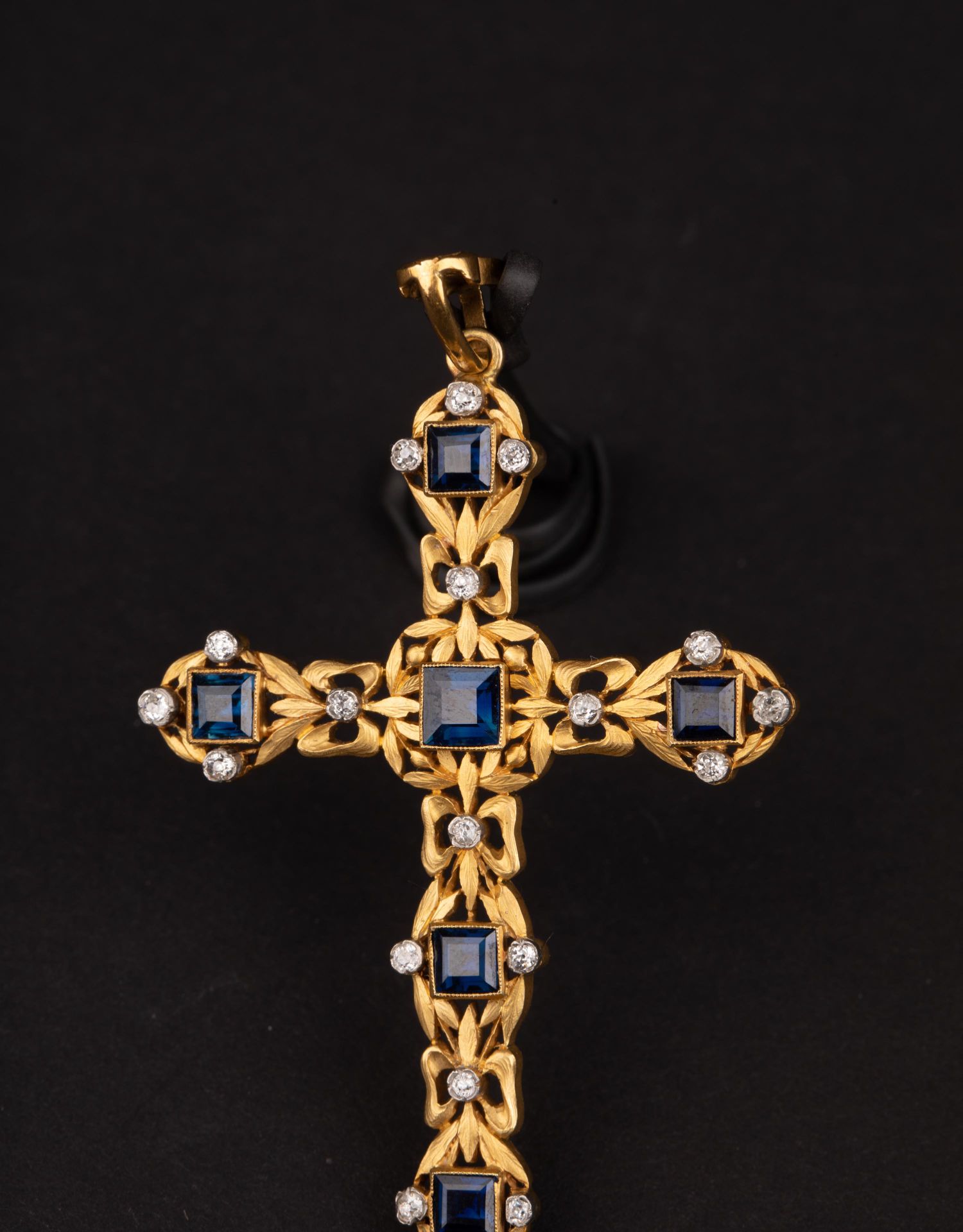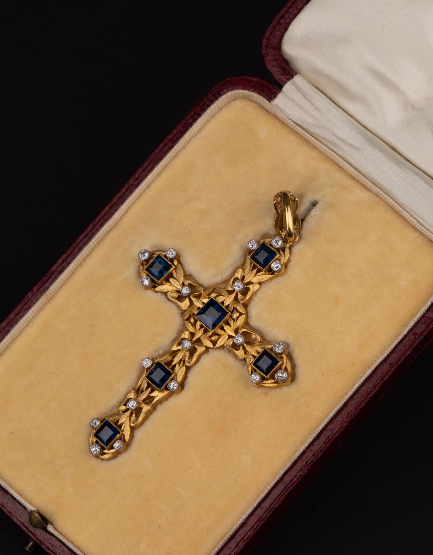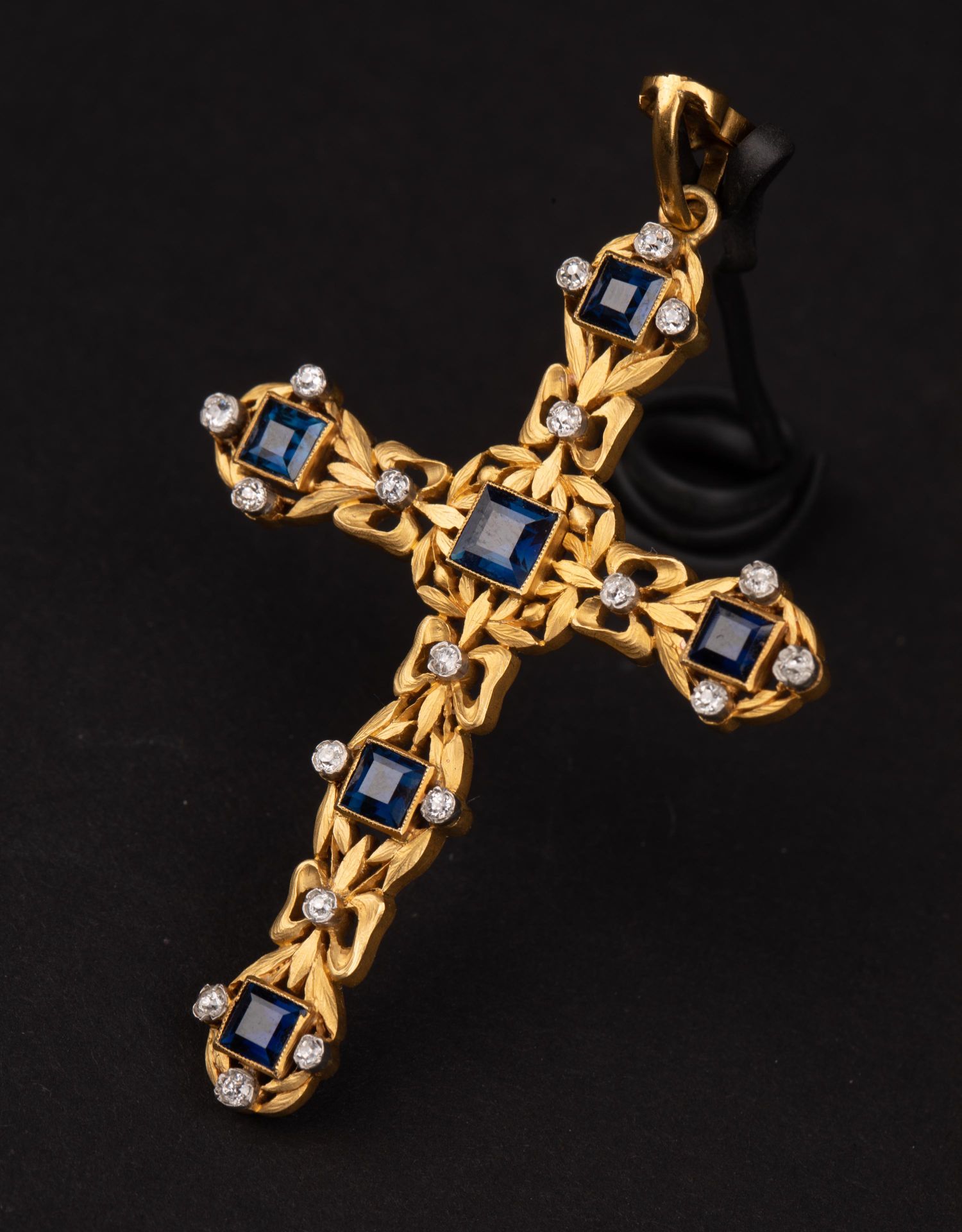 独角鹿西洋古董18K黄金镶蓝宝石老切钻石拉丝花卉镂空十字架吊坠