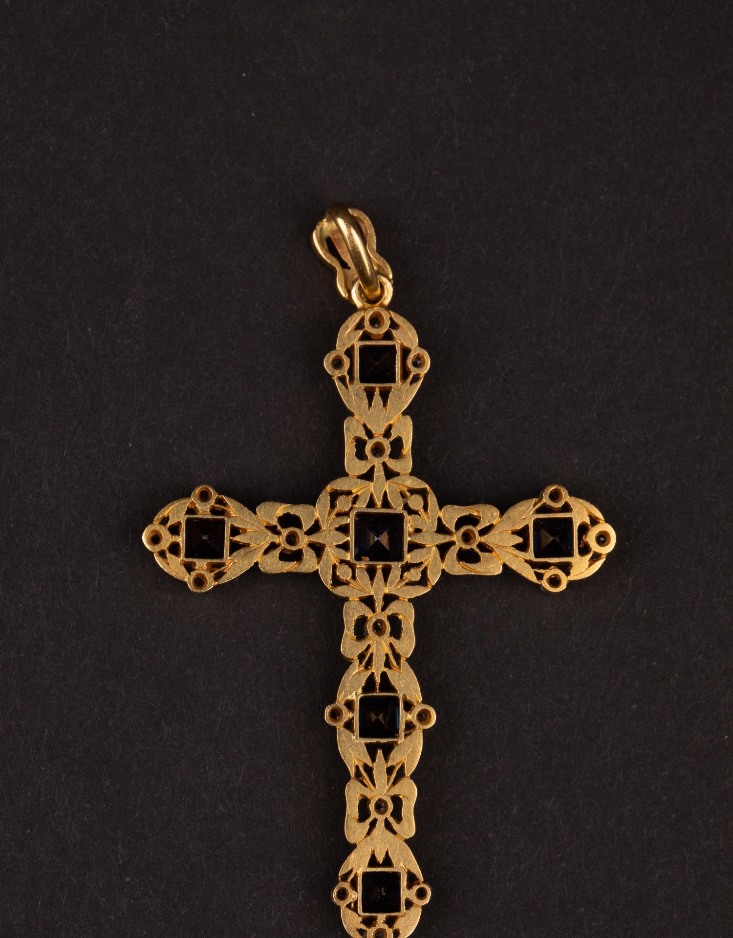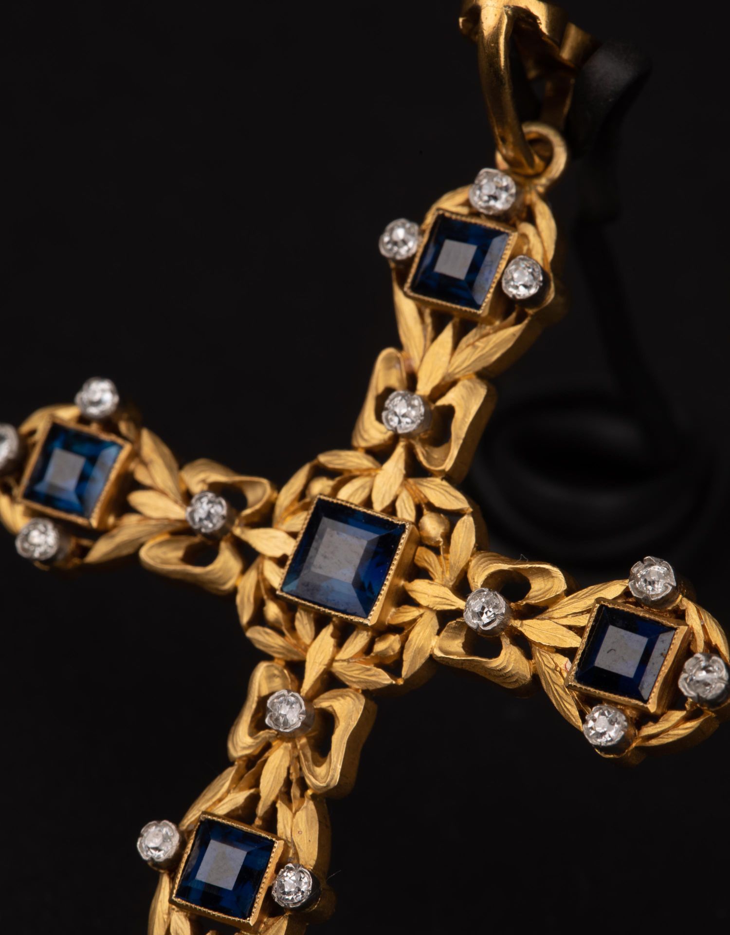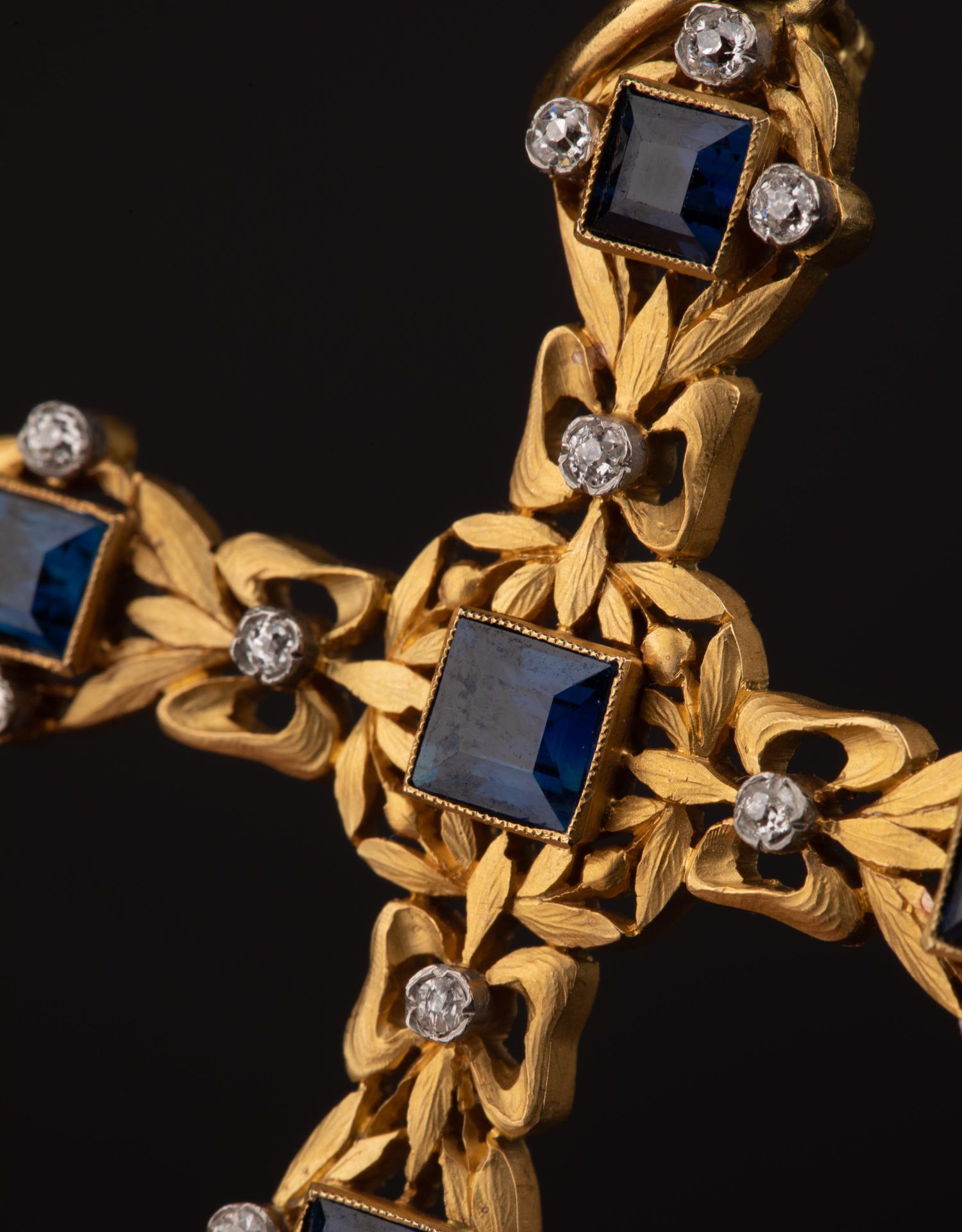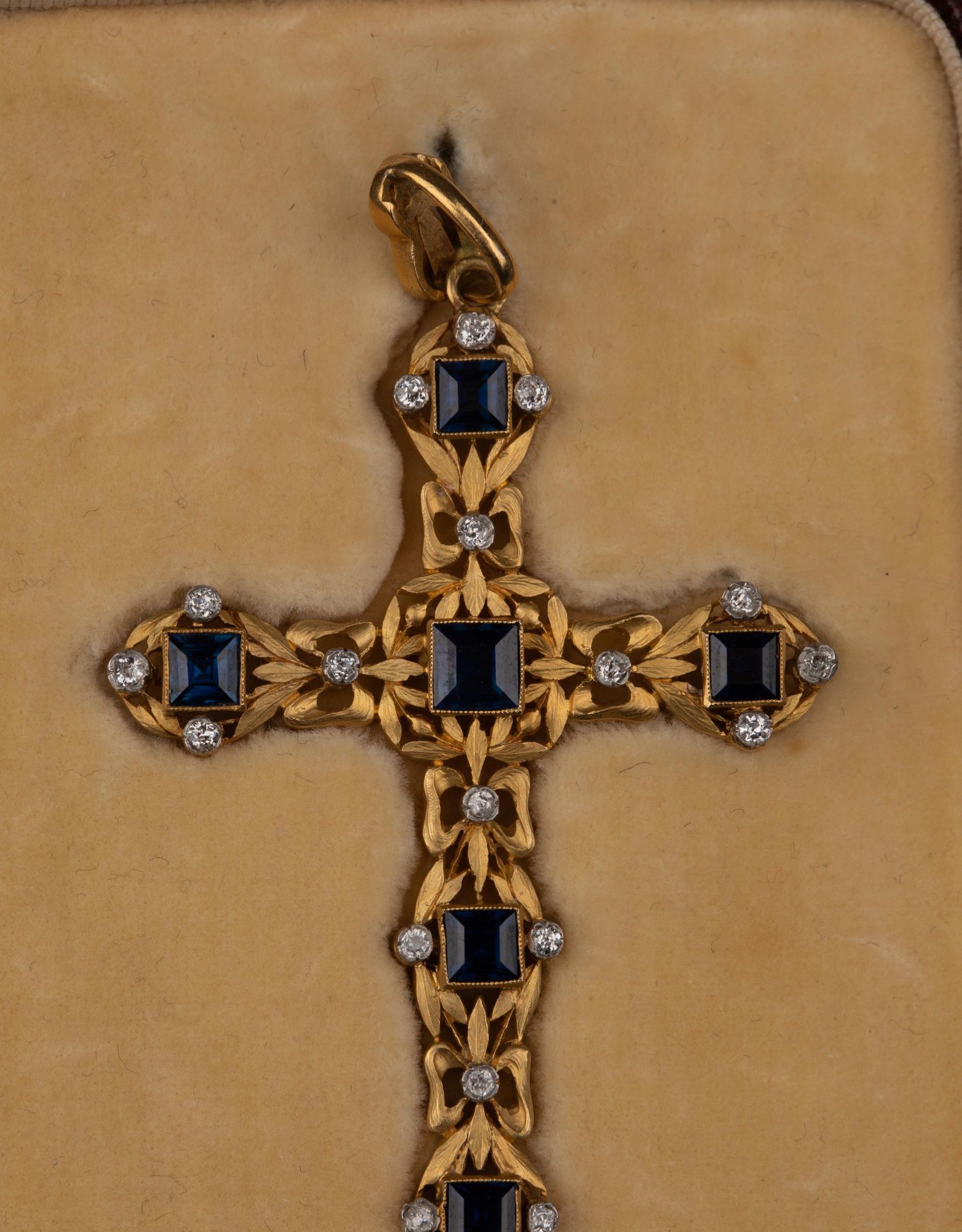 独角鹿西洋古董18K黄金镶蓝宝石老切钻石拉丝花卉镂空十字架吊坠