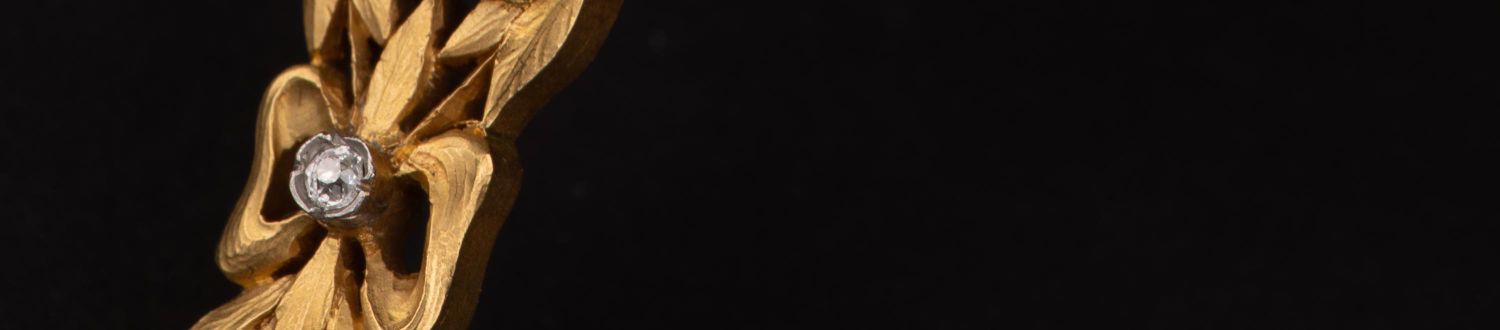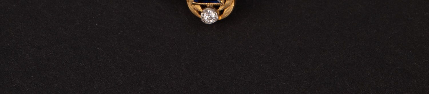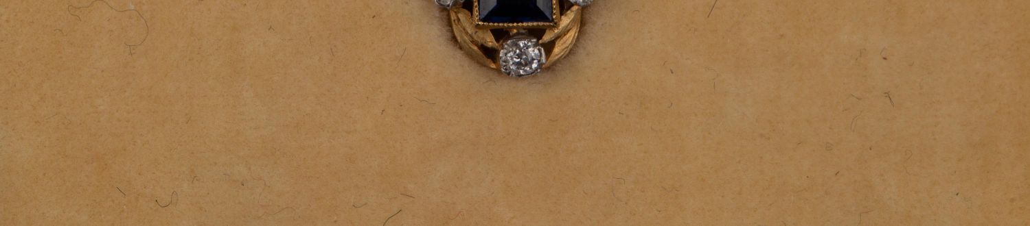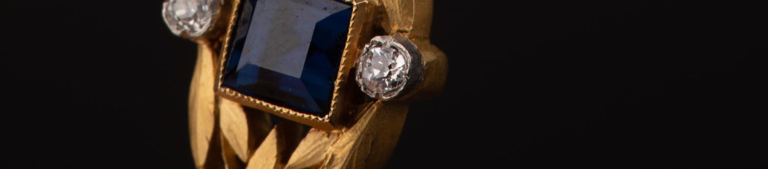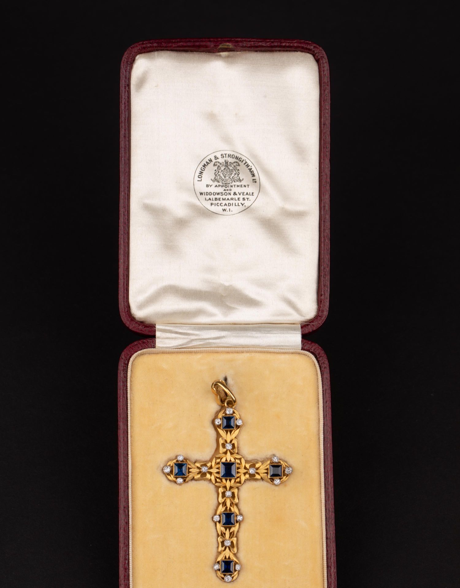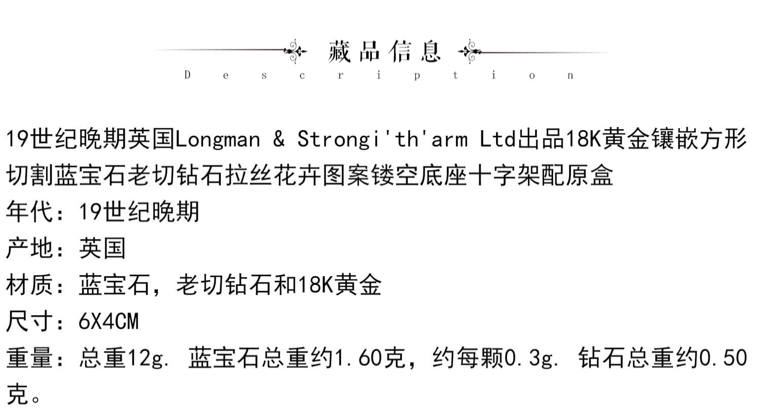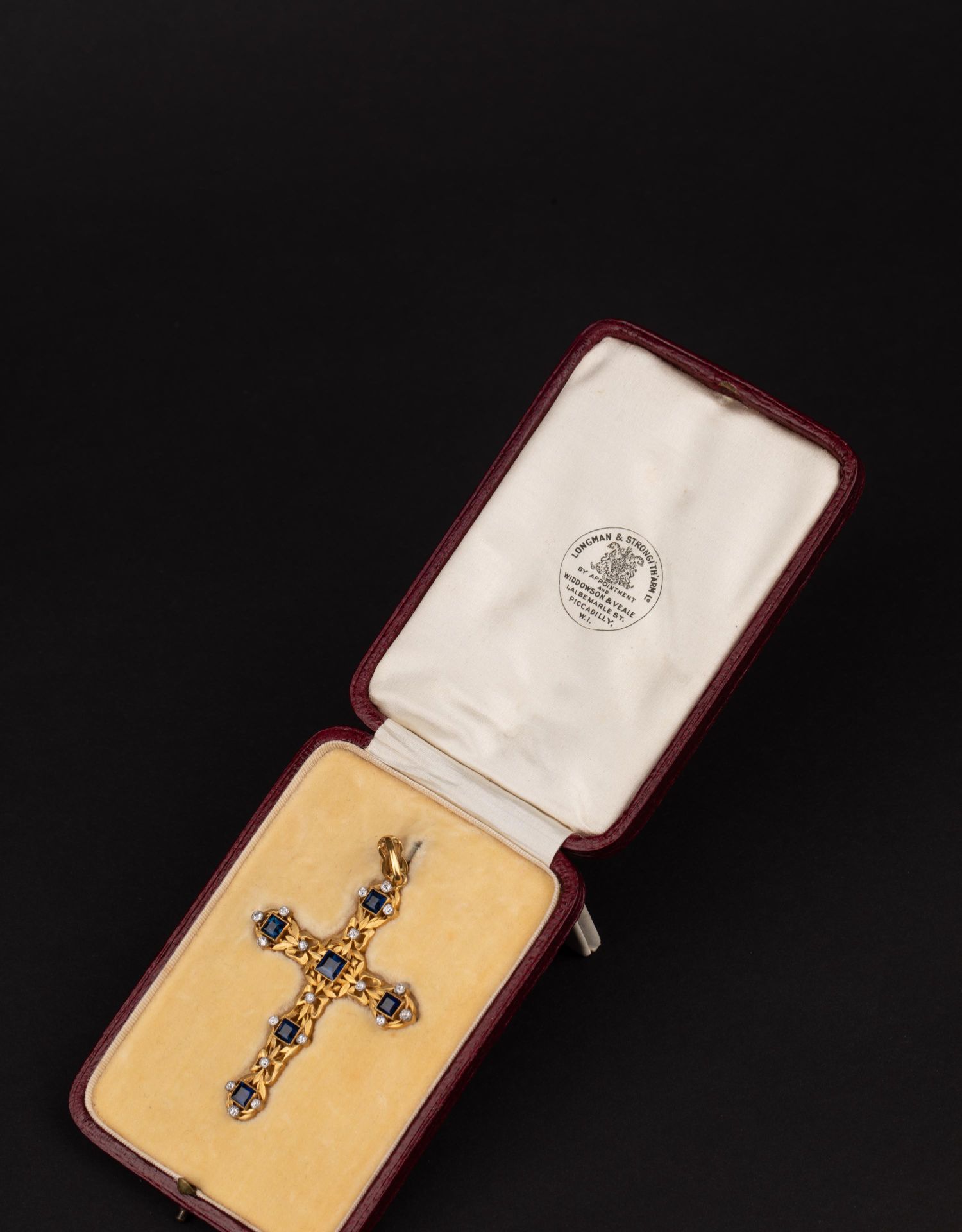 独角鹿西洋古董18K黄金镶蓝宝石老切钻石拉丝花卉镂空十字架吊坠