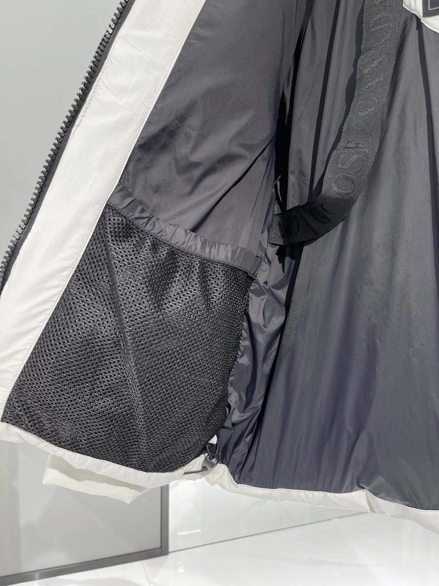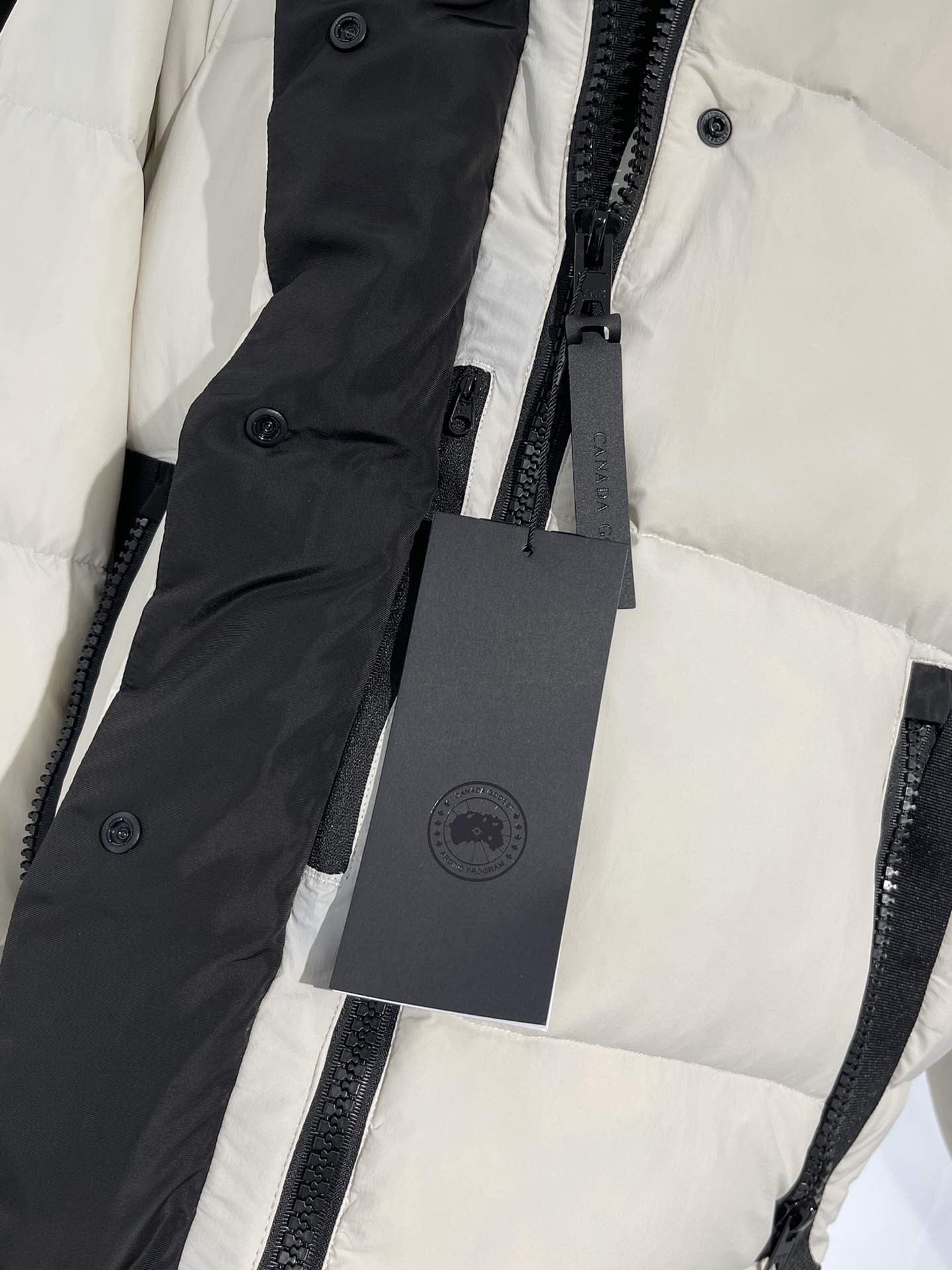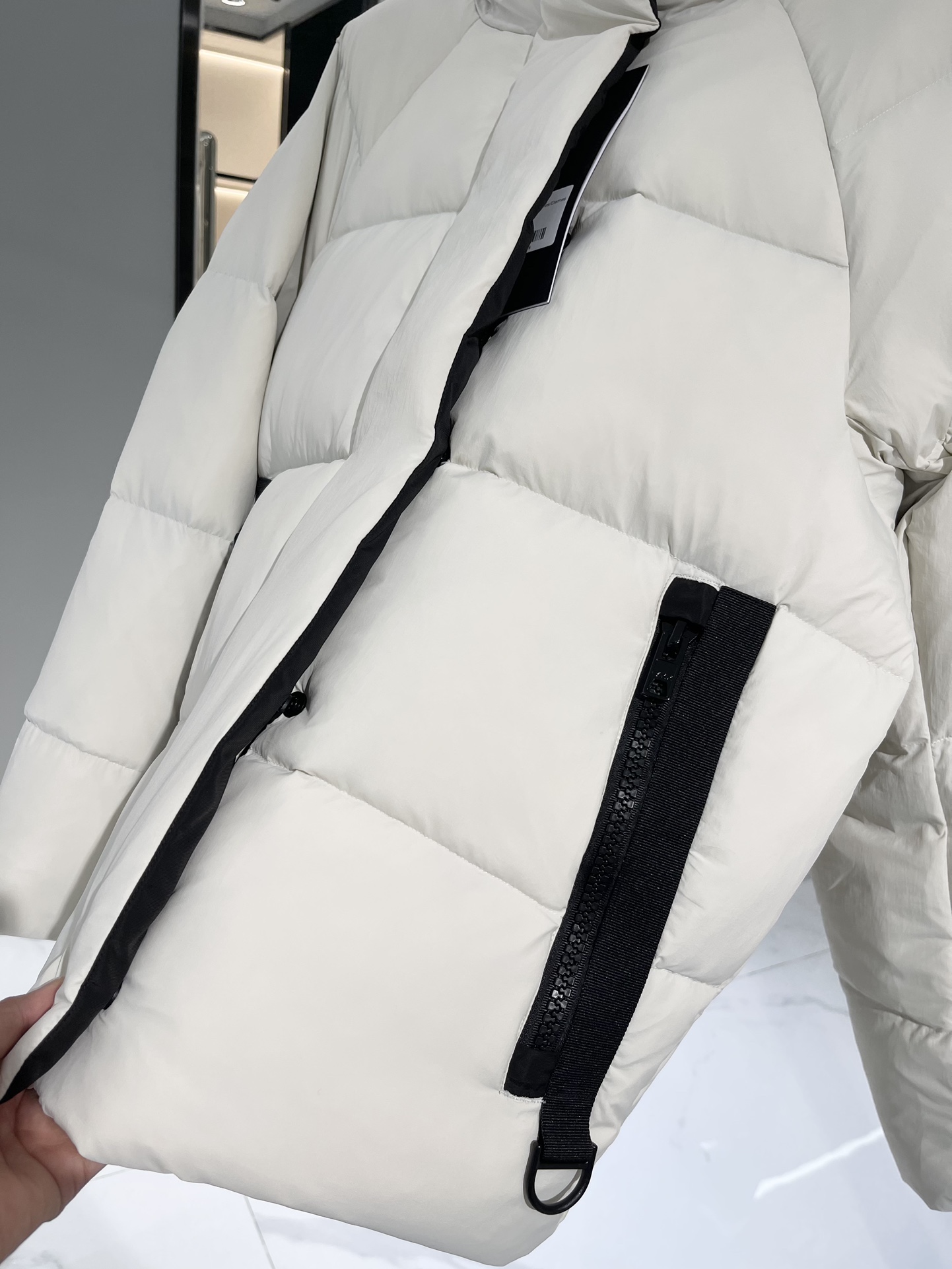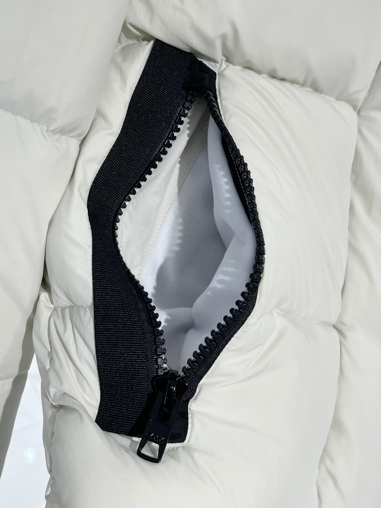 羽绒门襟在双向拉链上面设计有隐形按扣开合,防风保暖。从底部拉开拉链,可以增加活动幅度或提高透气性