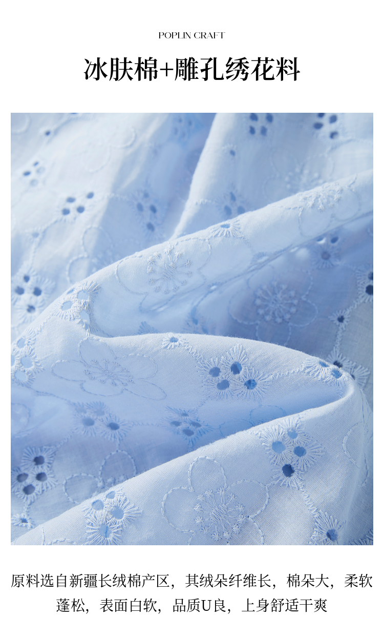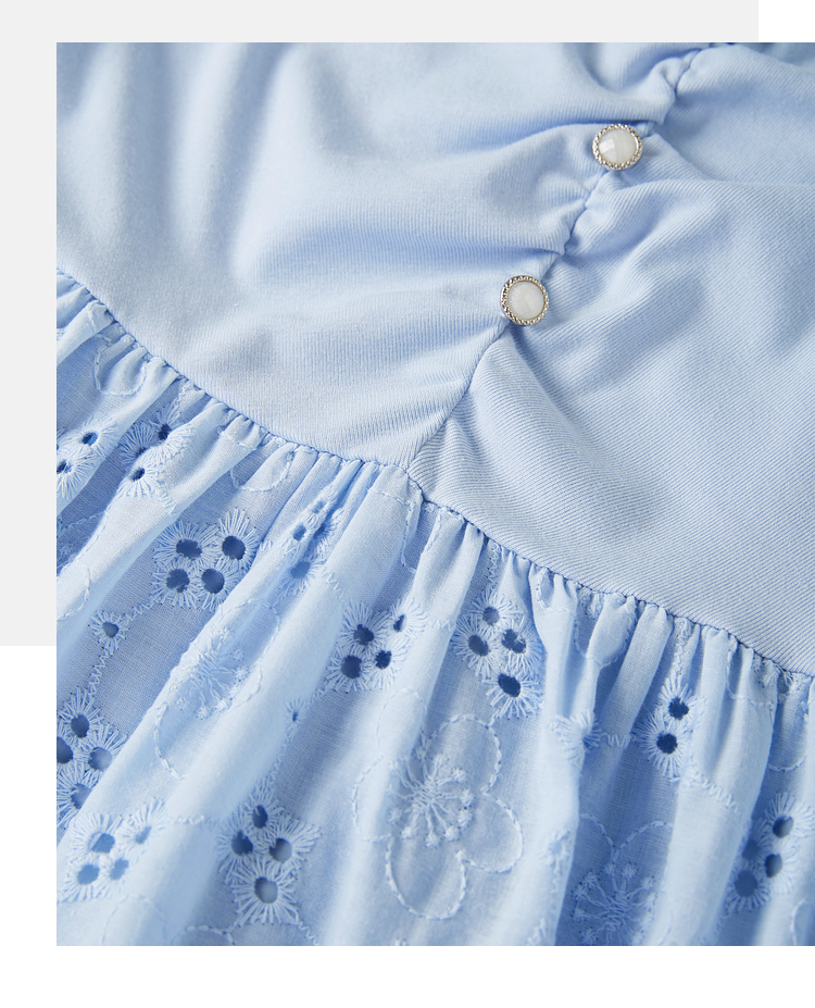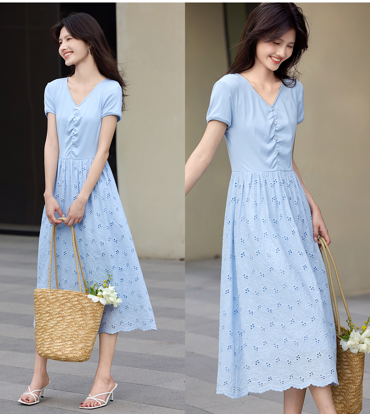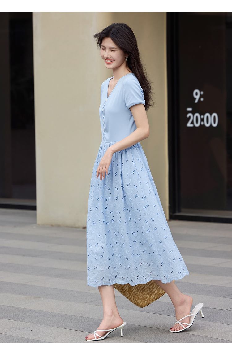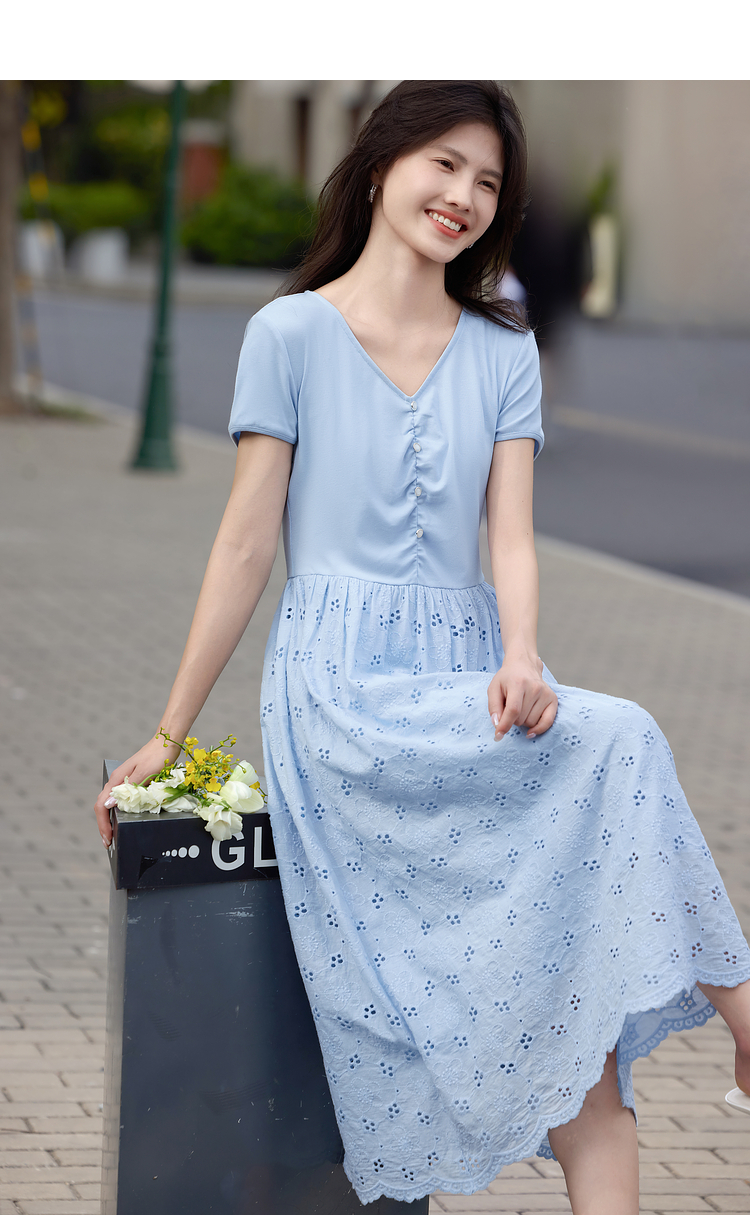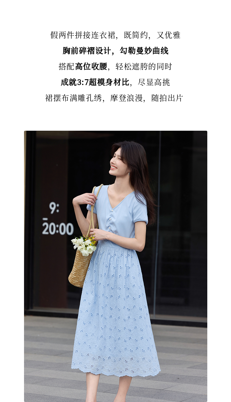 【专属特价】熙世界度假风镂空绣花V领连衣裙女夏季设计感短袖拼接假两件裙子