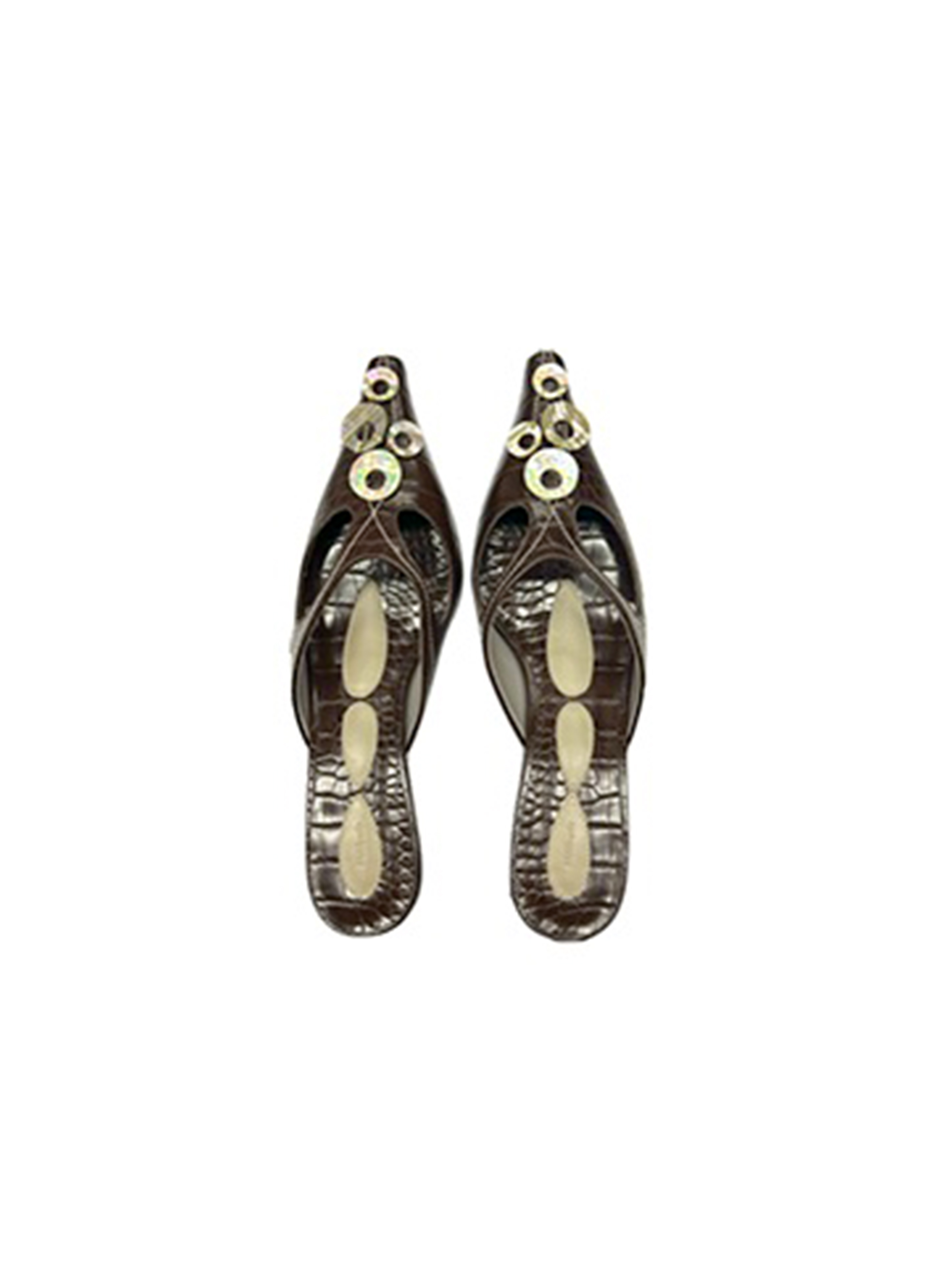 猫跟拖鞋,鞋尖点缀天然炫彩光泽的黄⾦鲍鱼贝壳环,丰富了整体的穿搭