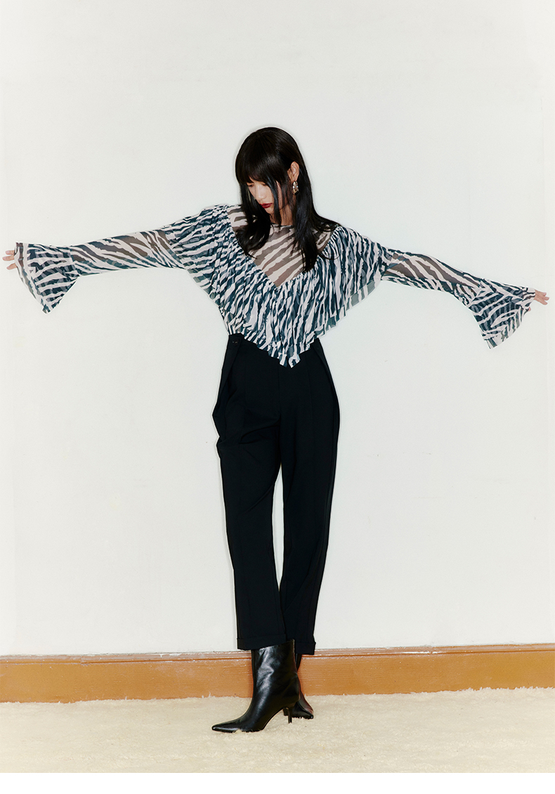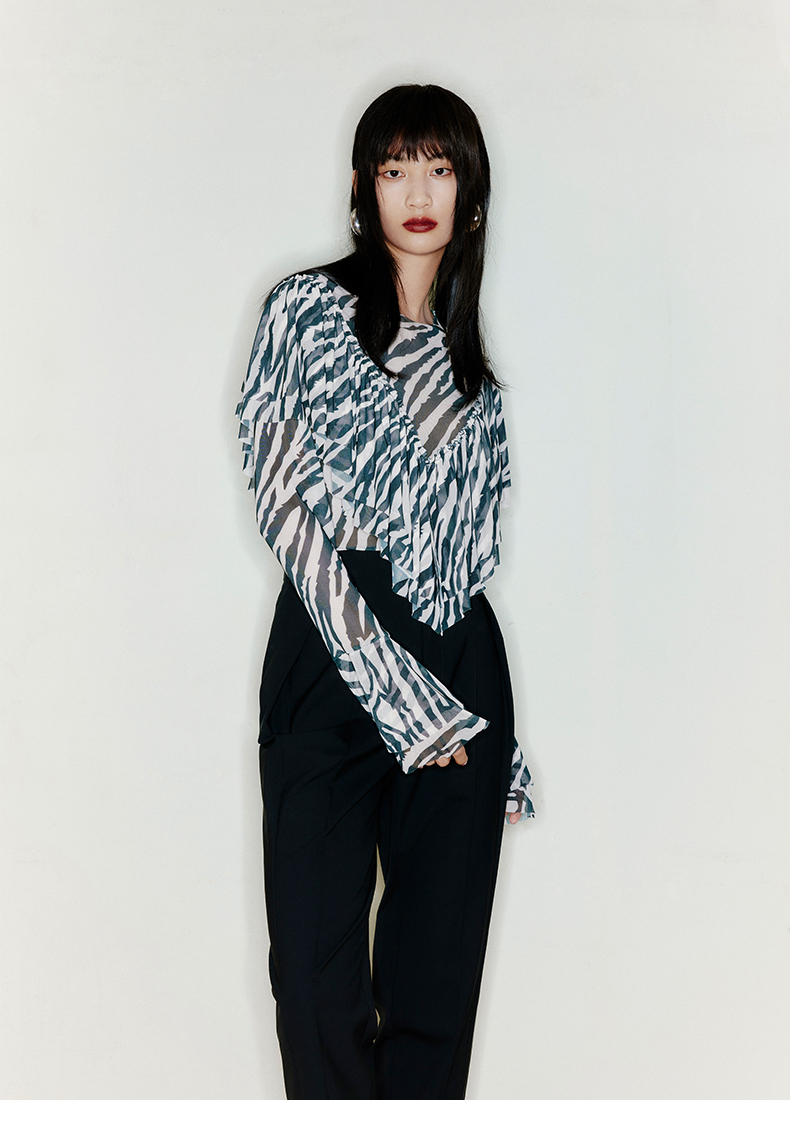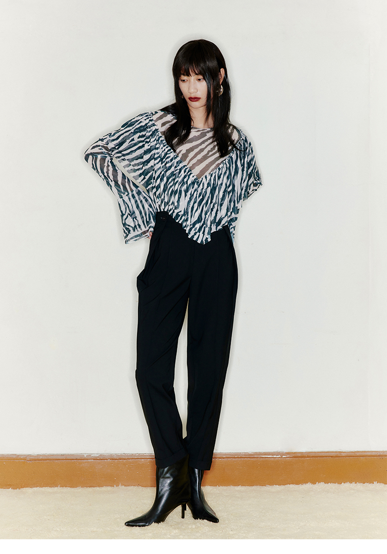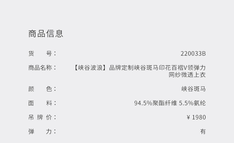 【峡谷波浪】品牌定制峡谷斑马印花百褶V领弹力网纱微透上衣/220033B