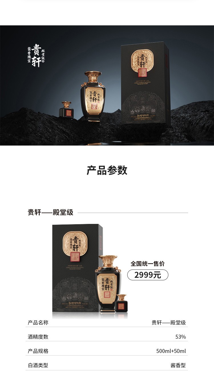 商品名称:贵轩 殿堂级 酱香型白酒53度 贵州国宝酒厂 500ml礼盒装