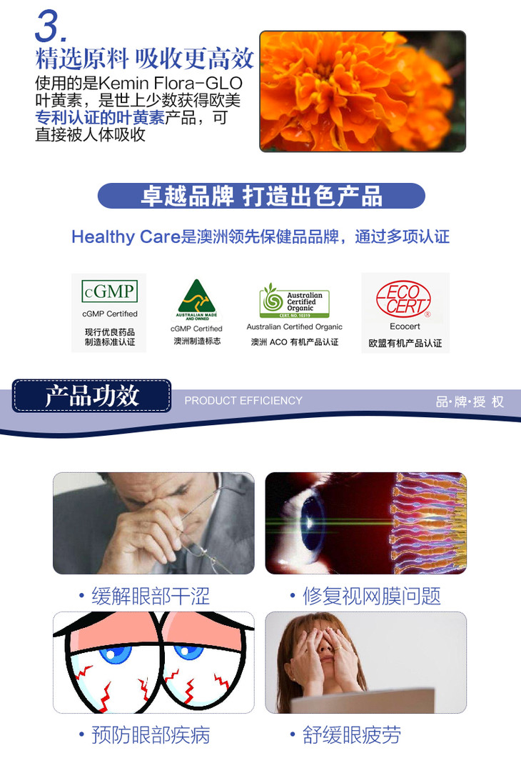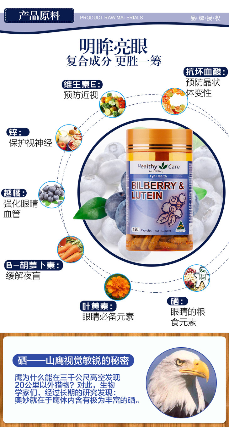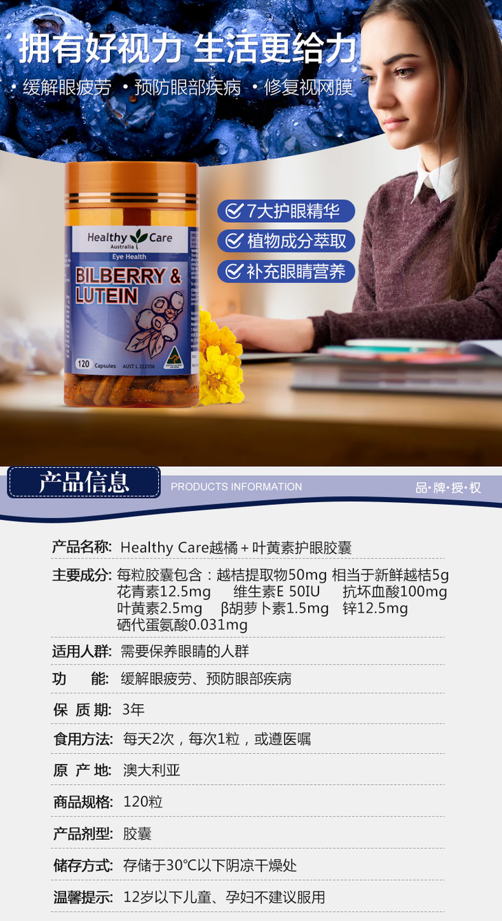 澳洲Healthy Care蓝莓越橘叶黄素精华HC护眼胶囊120粒