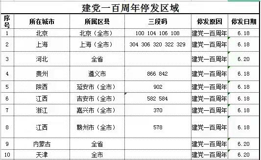 除部分因疫情或网点异常停发地区外,现因建党一百周年即日起以下地区快递将全部停发,恢复正常时间会另外通知,请知晓。