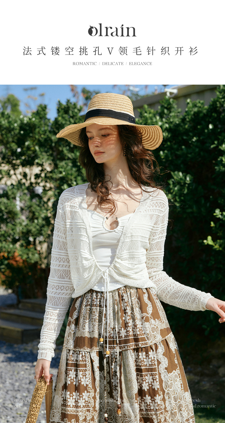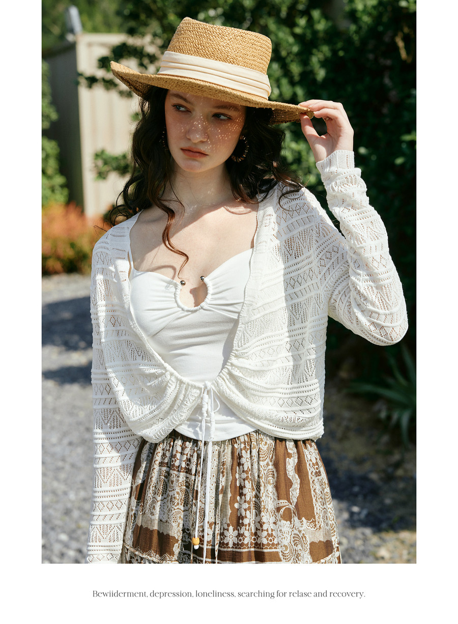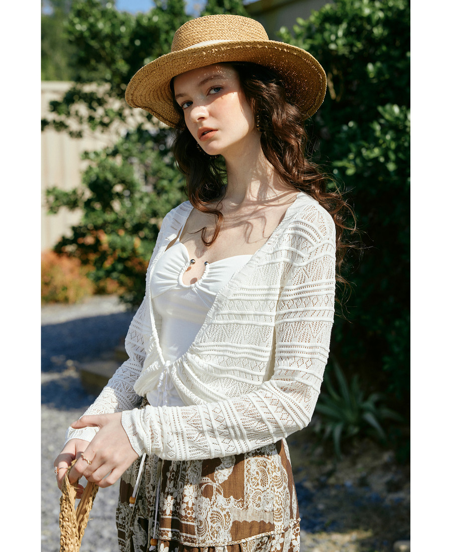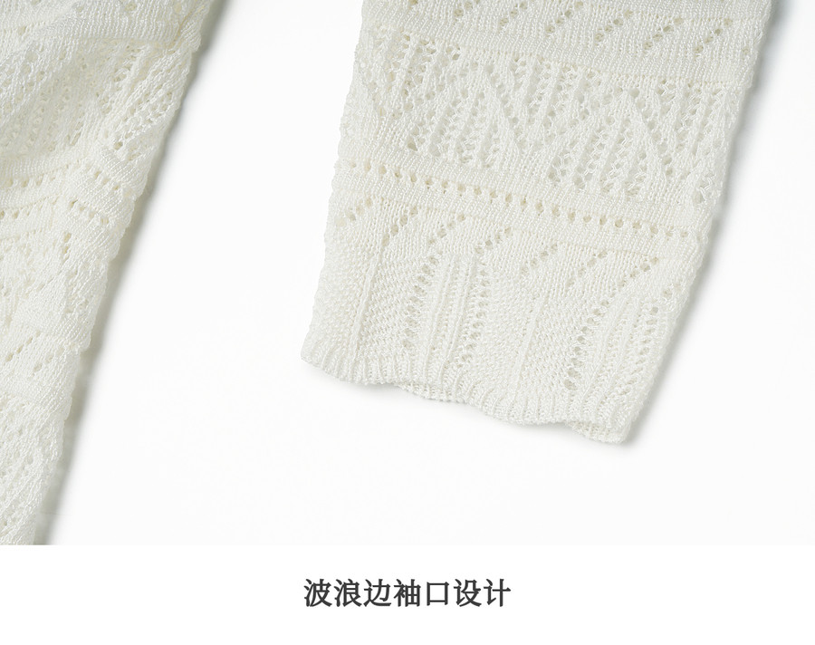 欧芮儿法式镂空挑孔V领毛针织开衫女夏季2026新款短款长袖上衣