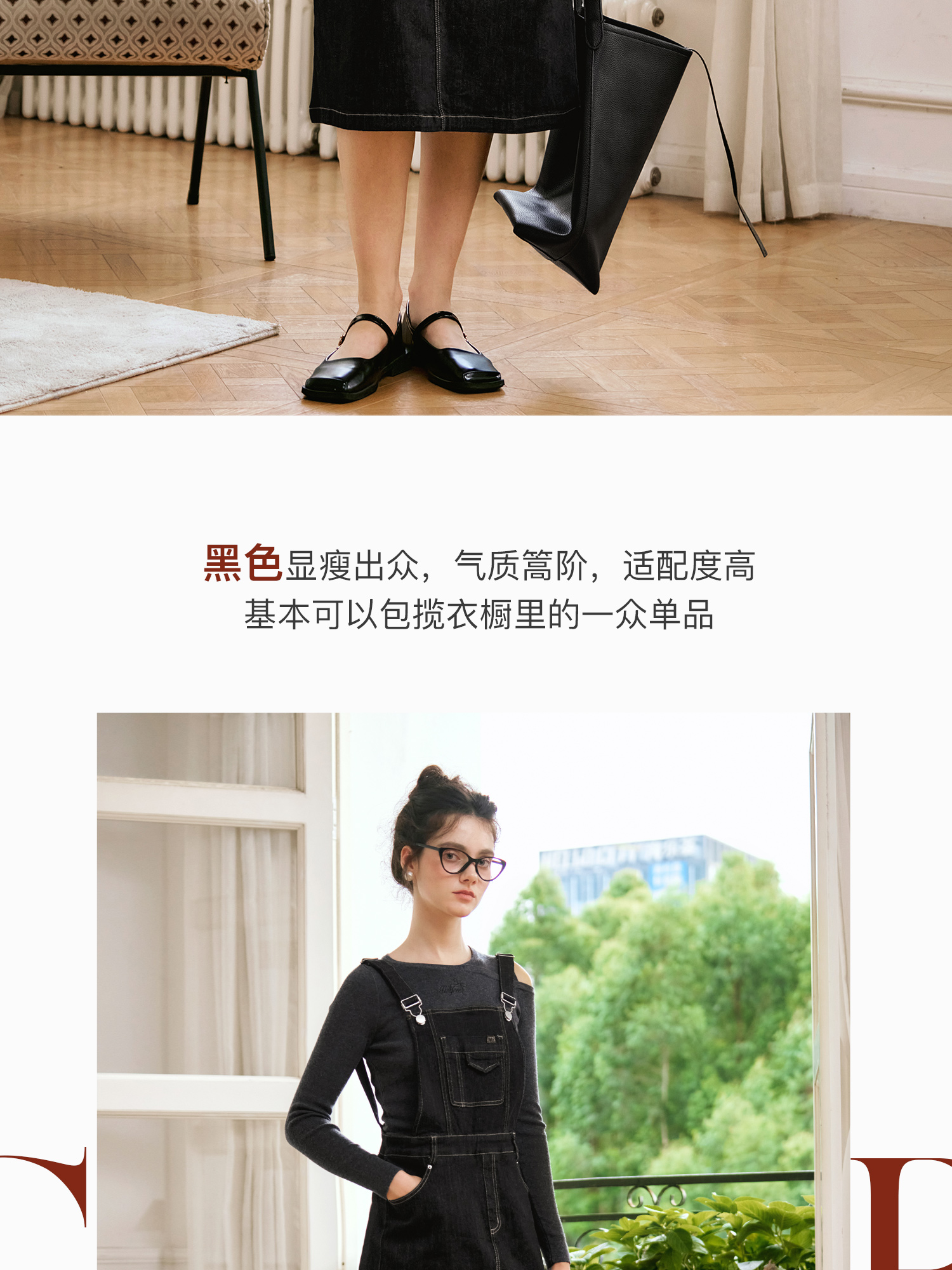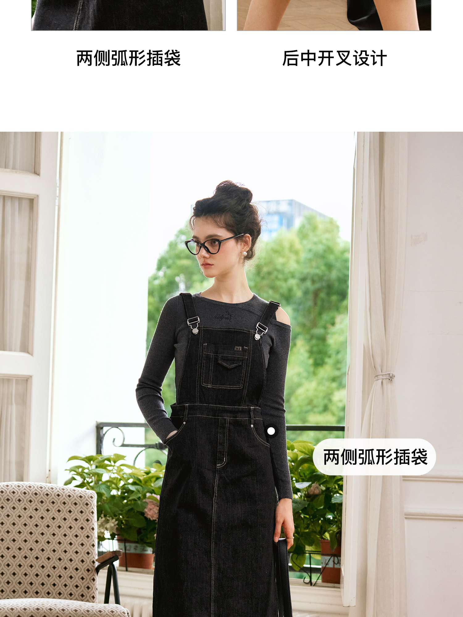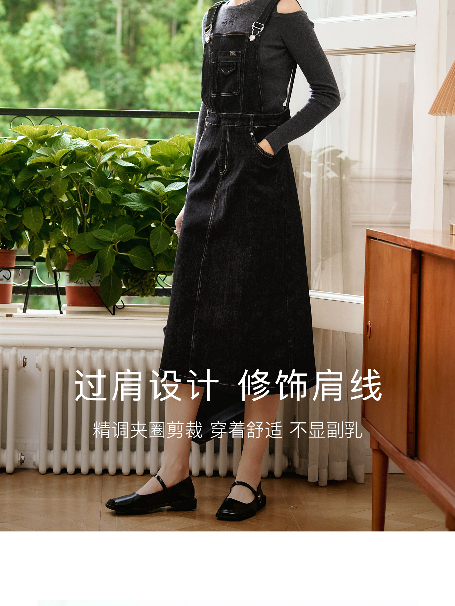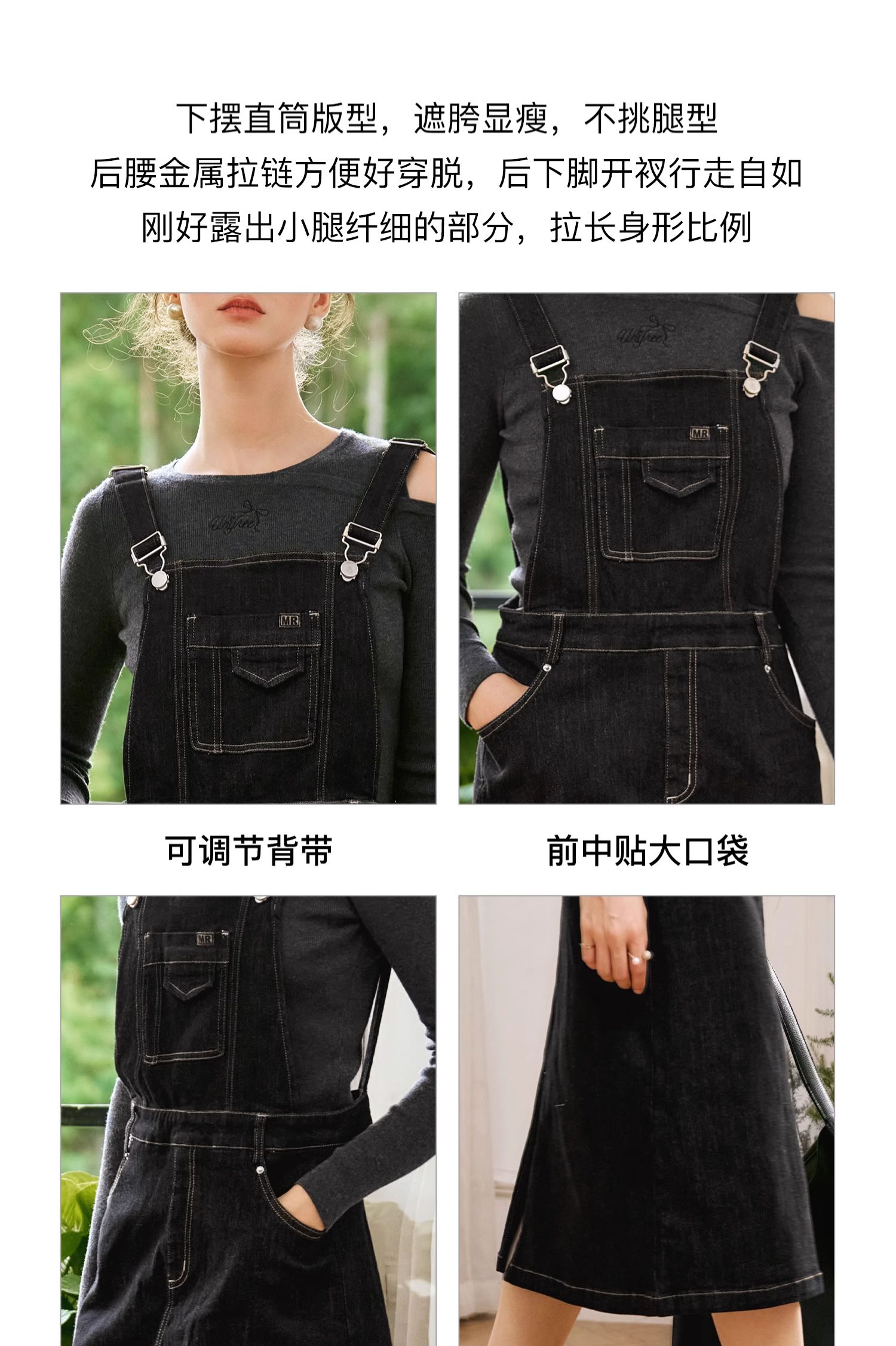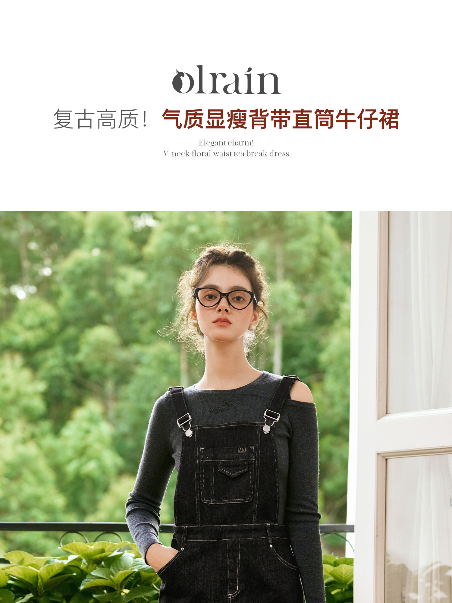 OLrain欧芮儿黑色背带连衣裙女秋季2024年新款复古百搭直筒牛仔裙