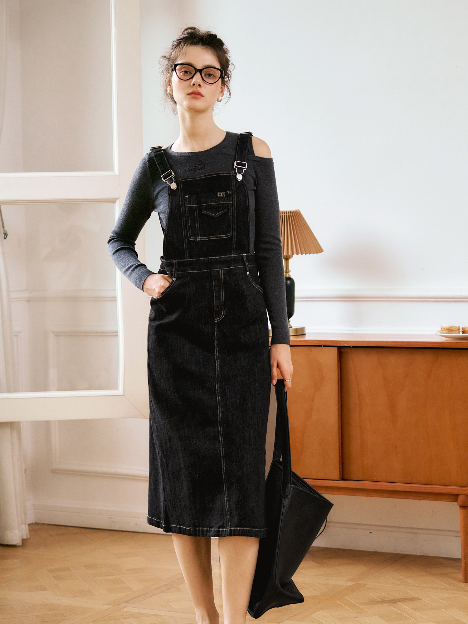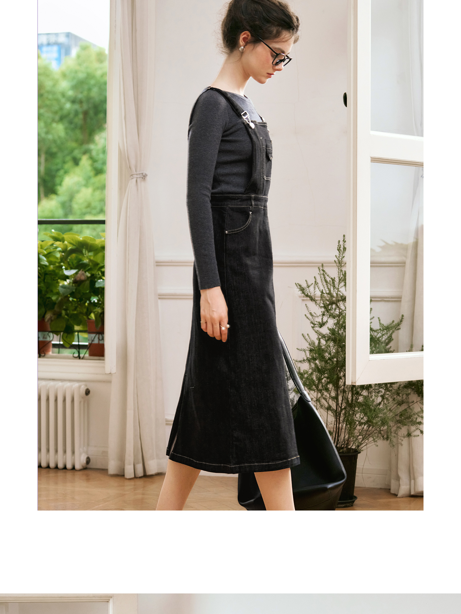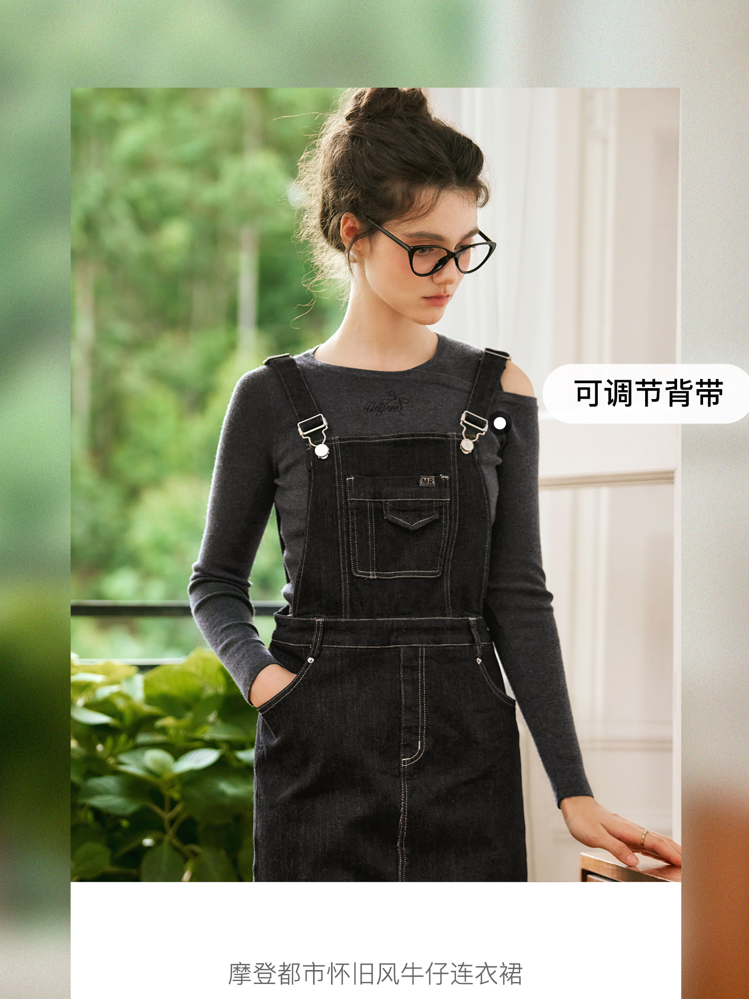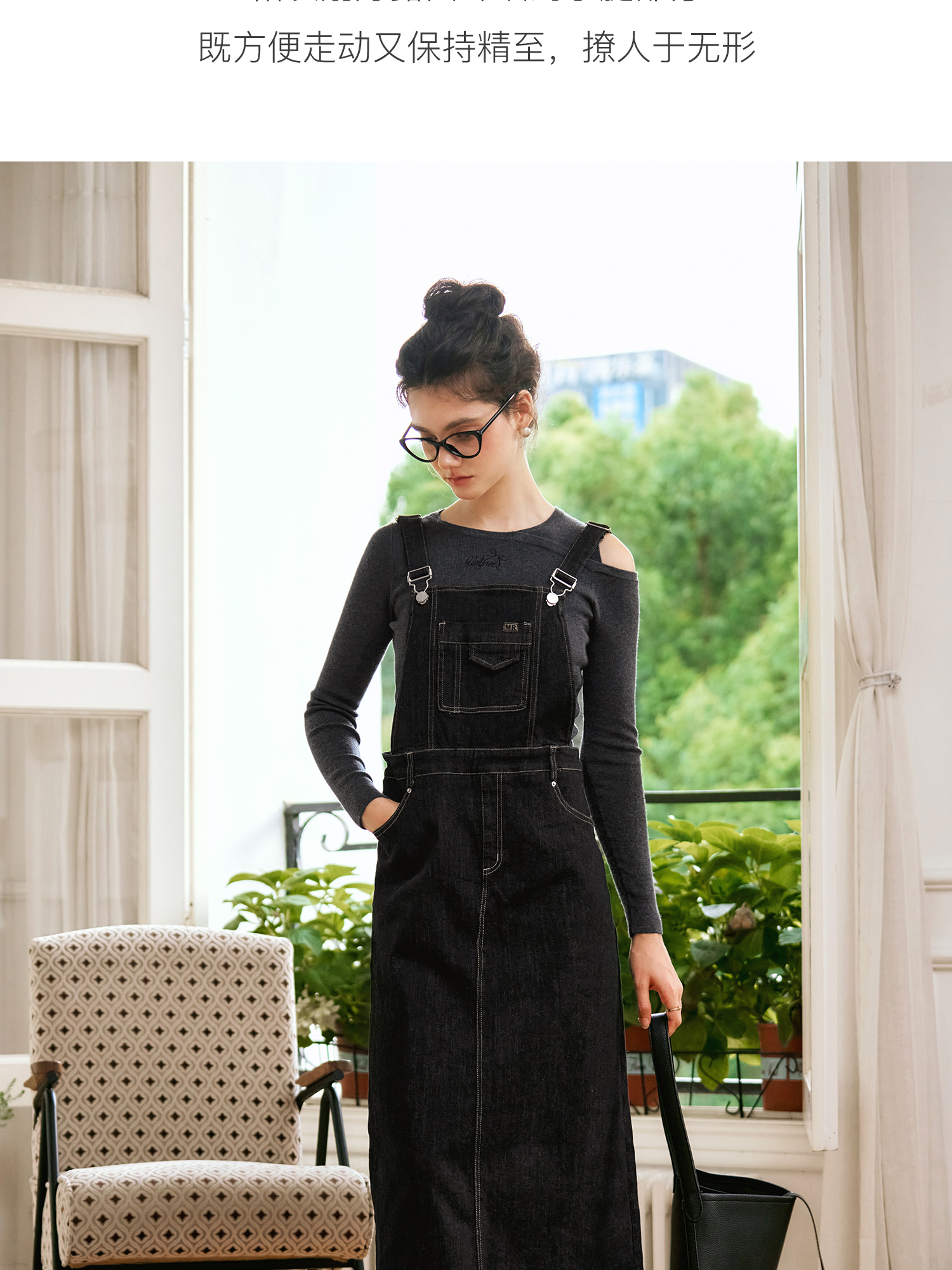 OLrain欧芮儿黑色背带连衣裙女秋季2024年新款复古百搭直筒牛仔裙