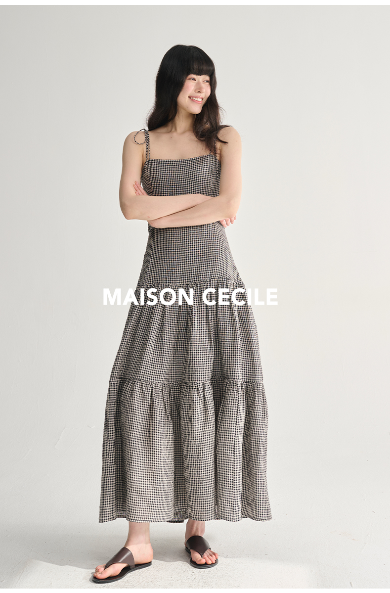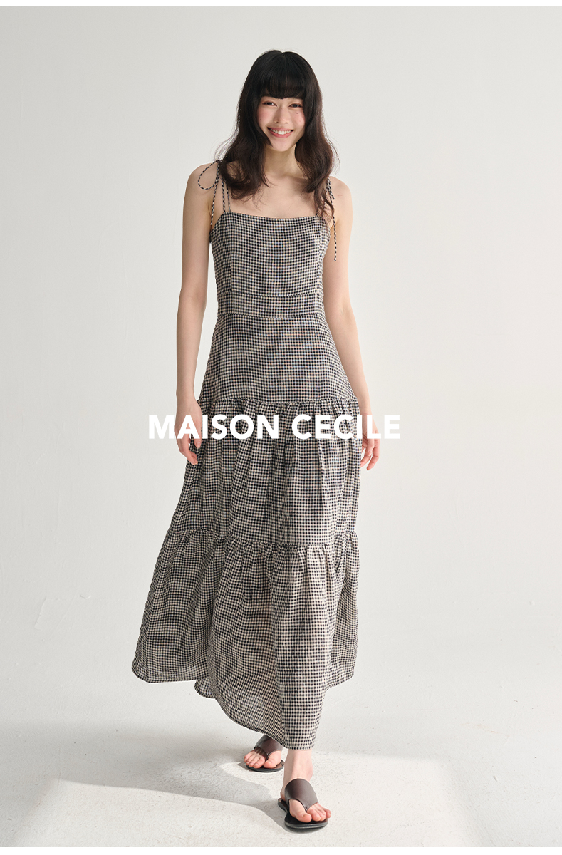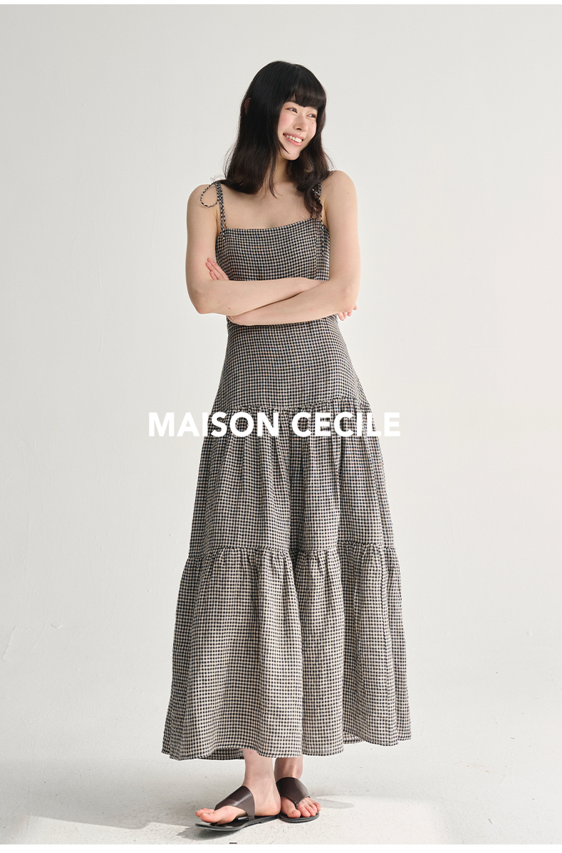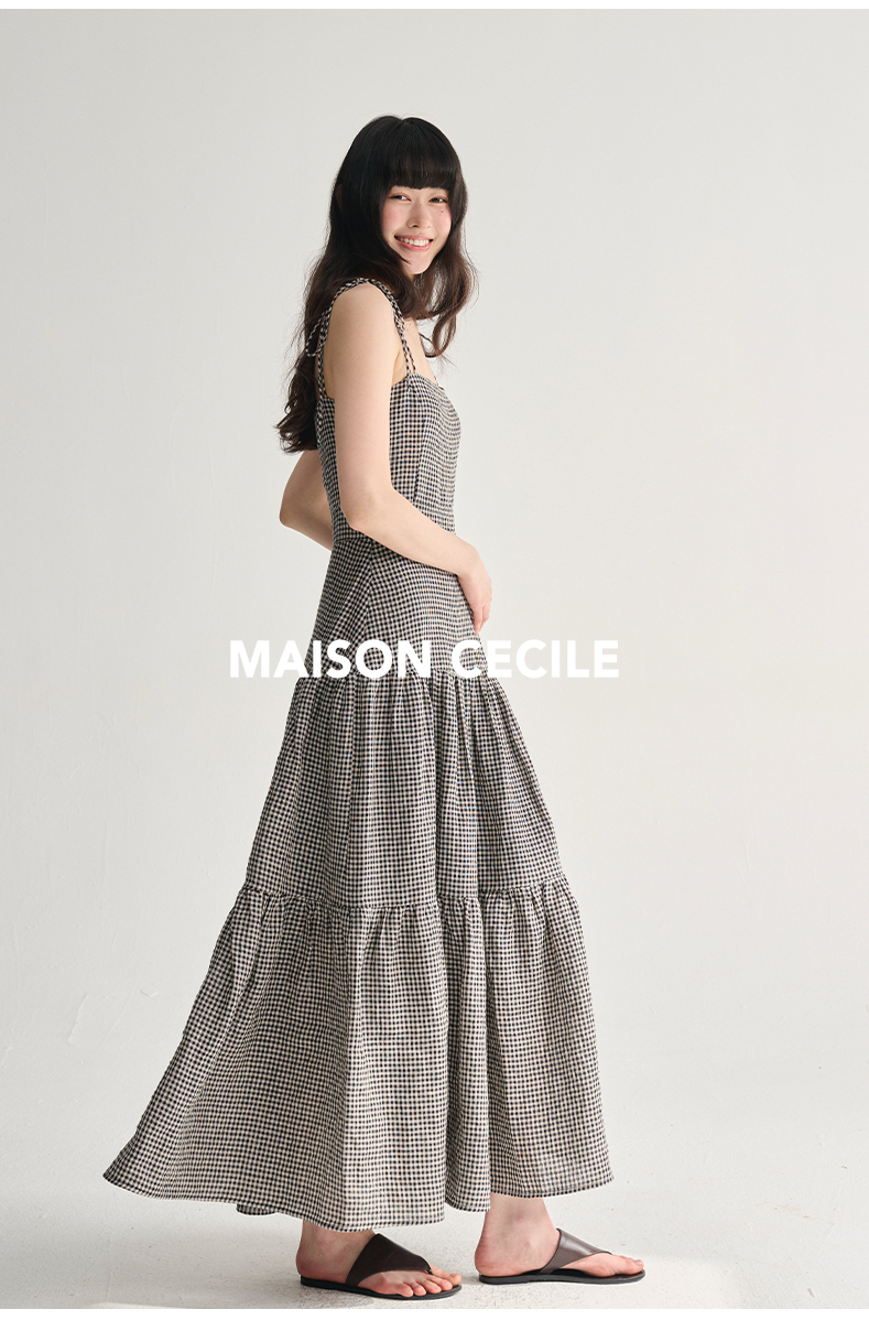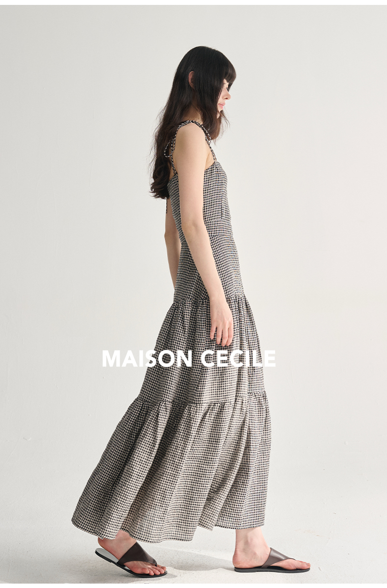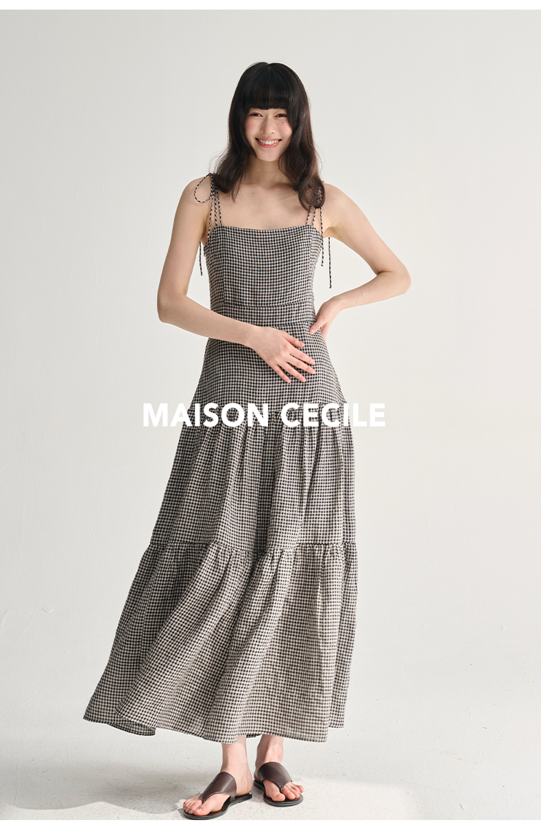 MAISON CECILE复古法式随性格纹/白色收腰显瘦A字吊带连衣裙