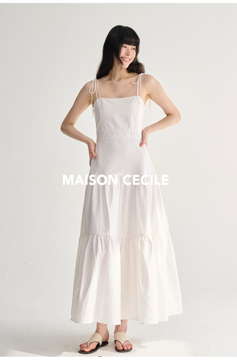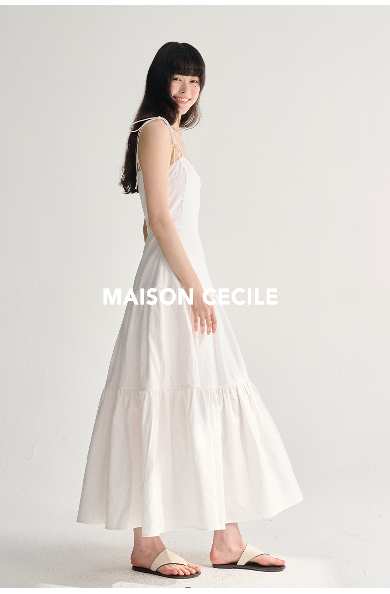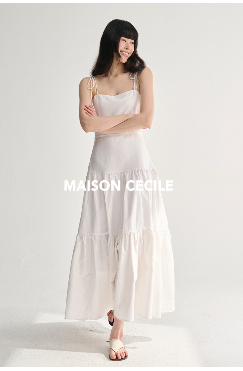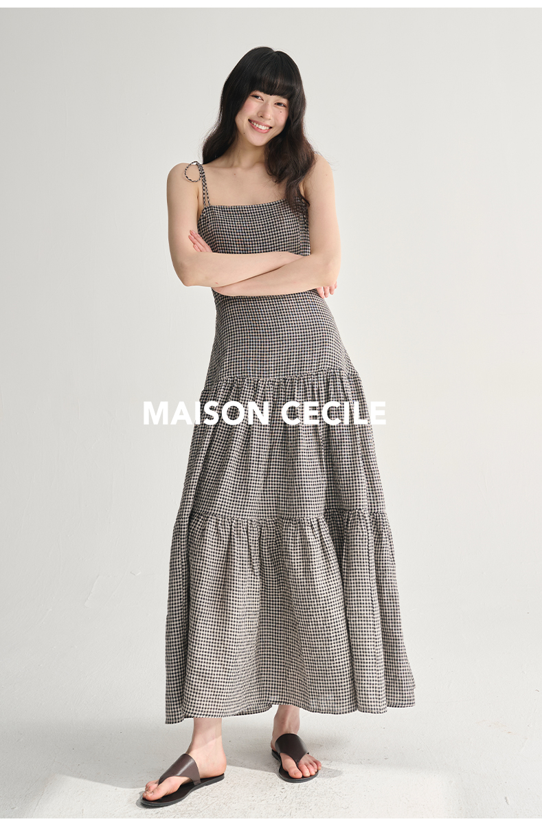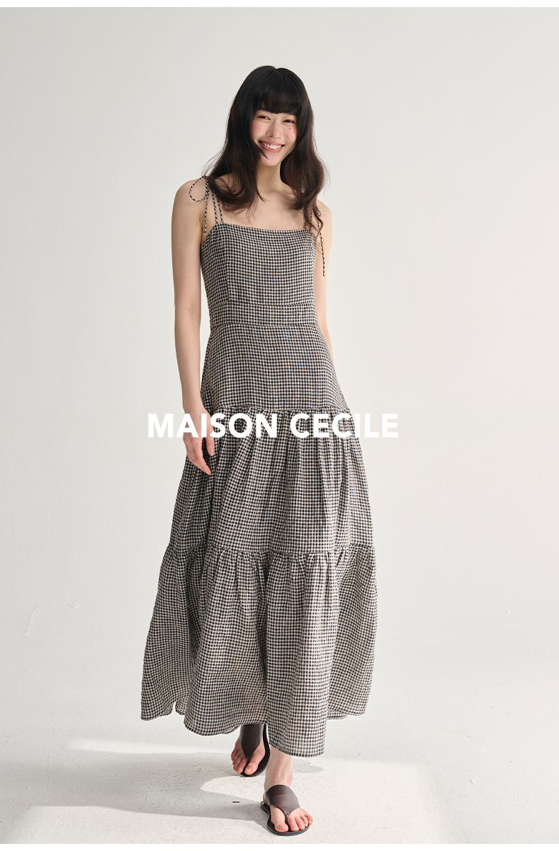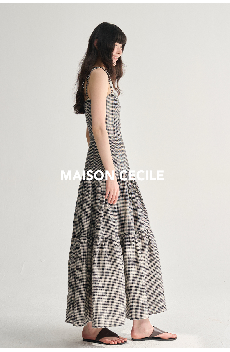 MAISON CECILE复古法式随性格纹/白色收腰显瘦A字吊带连衣裙