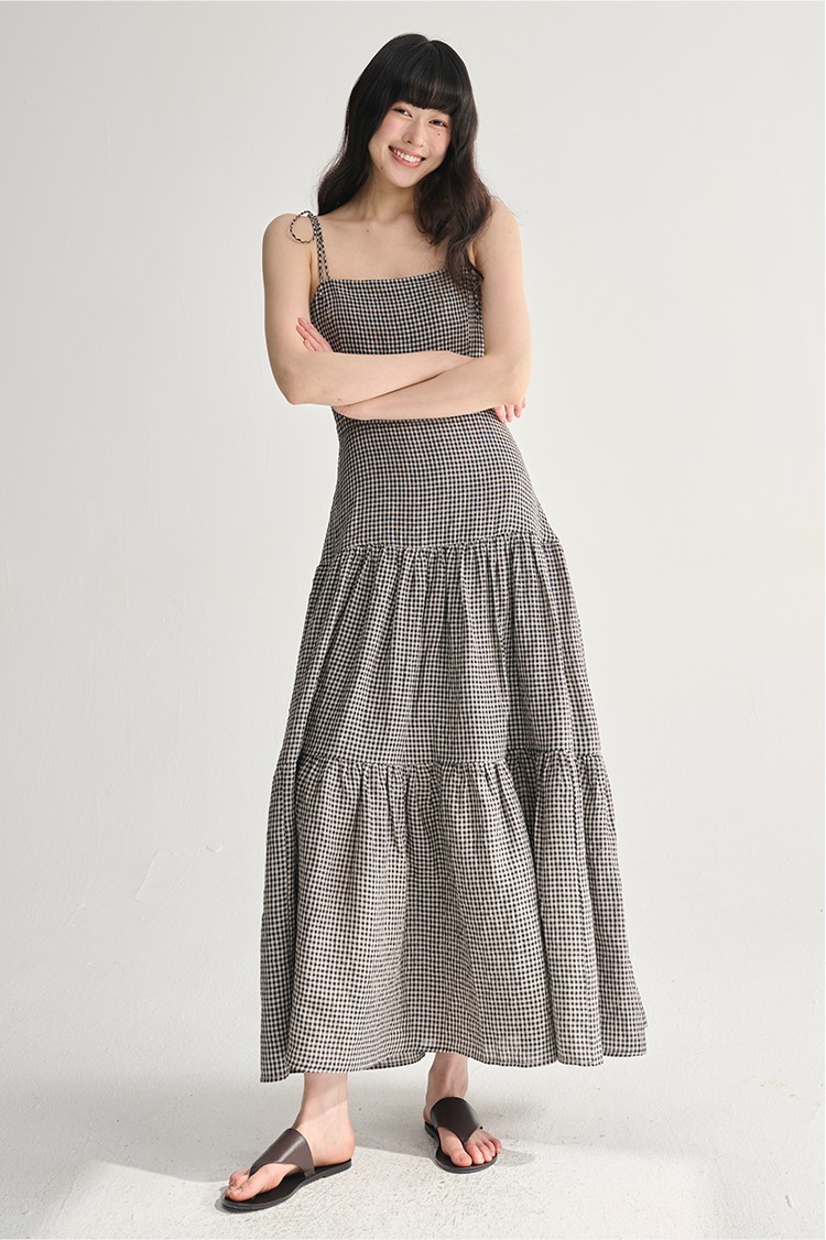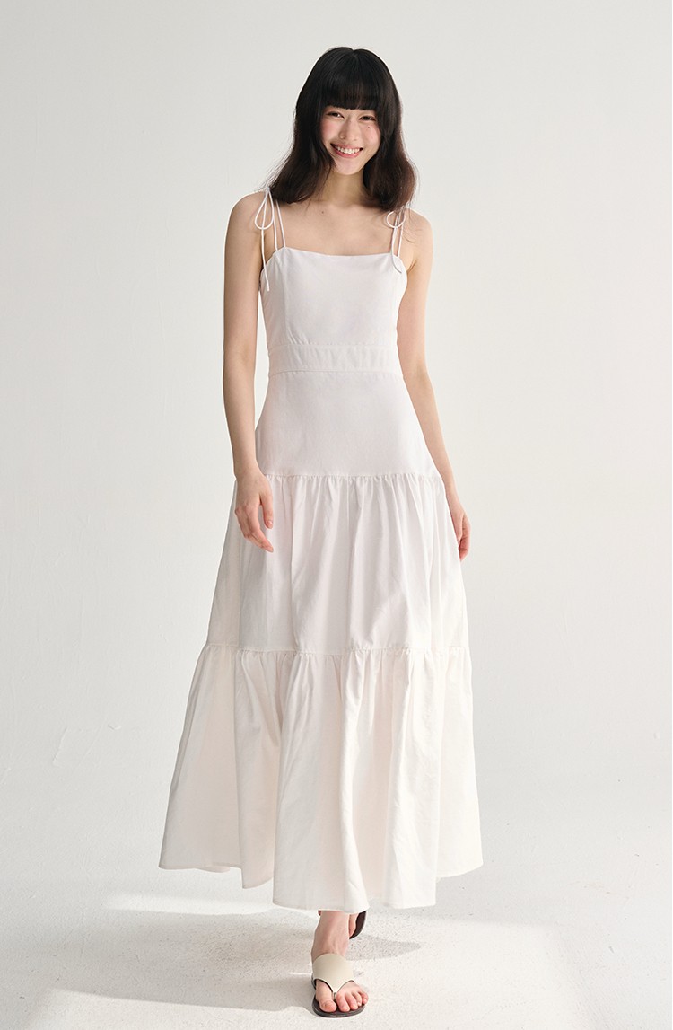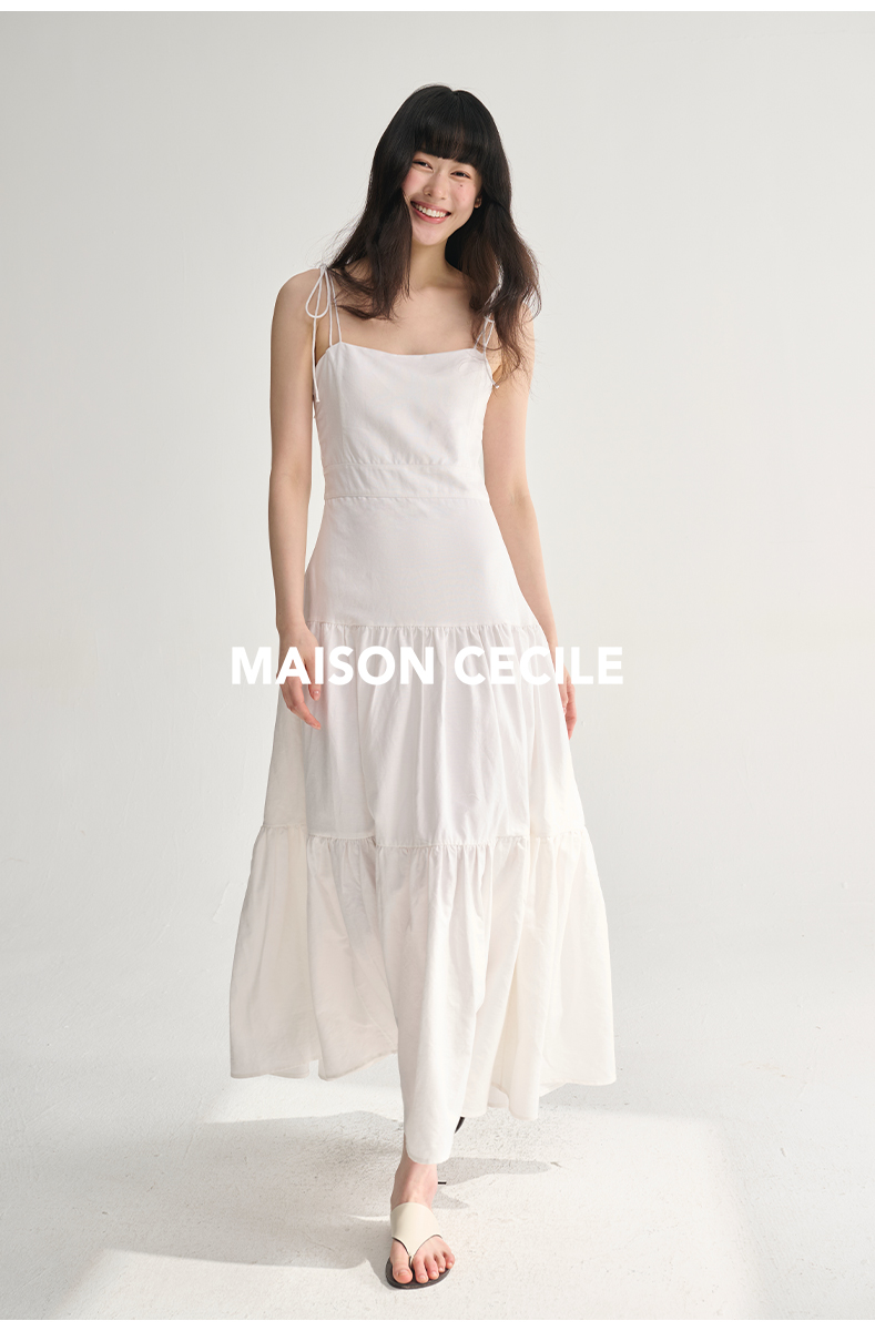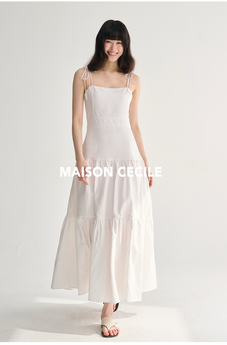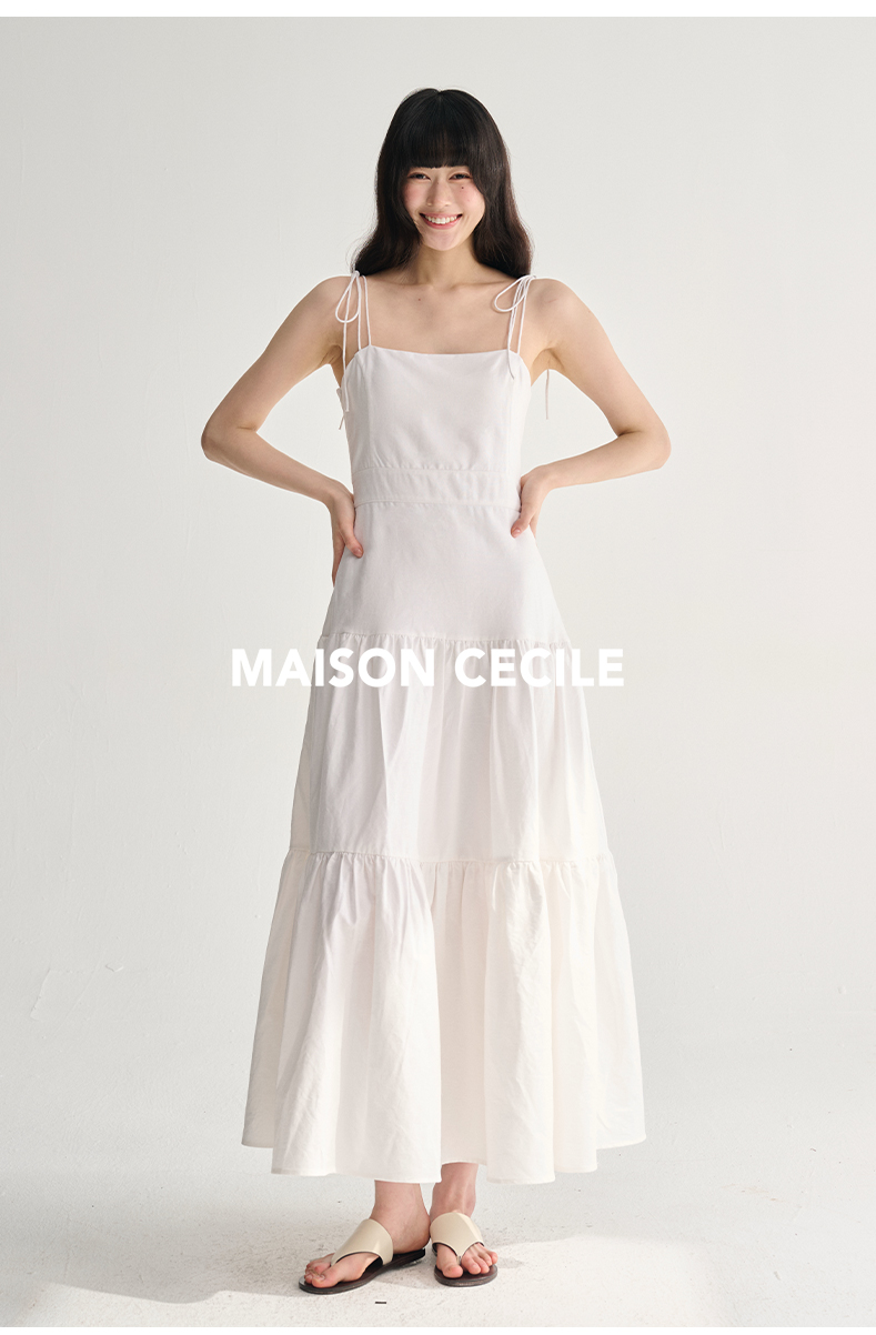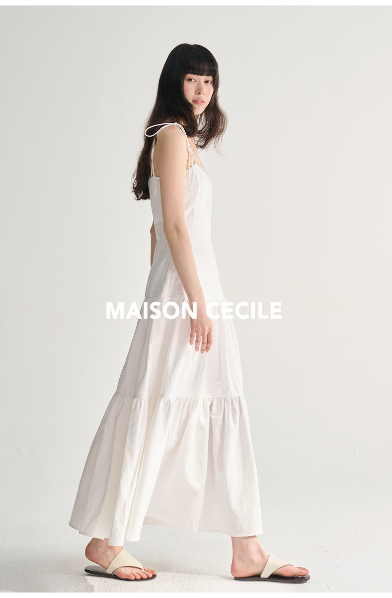 MAISON CECILE复古法式随性格纹/白色收腰显瘦A字吊带连衣裙