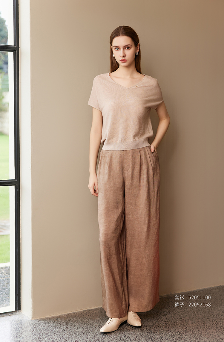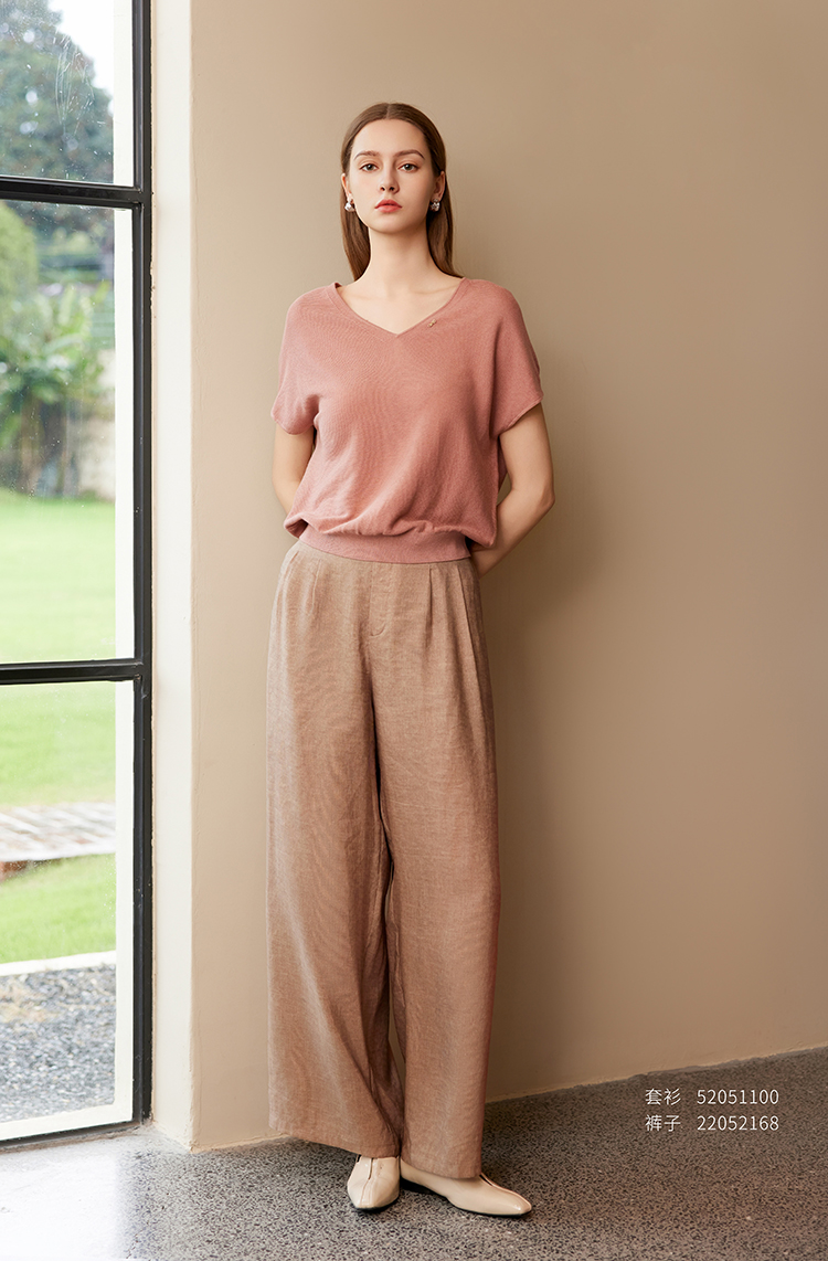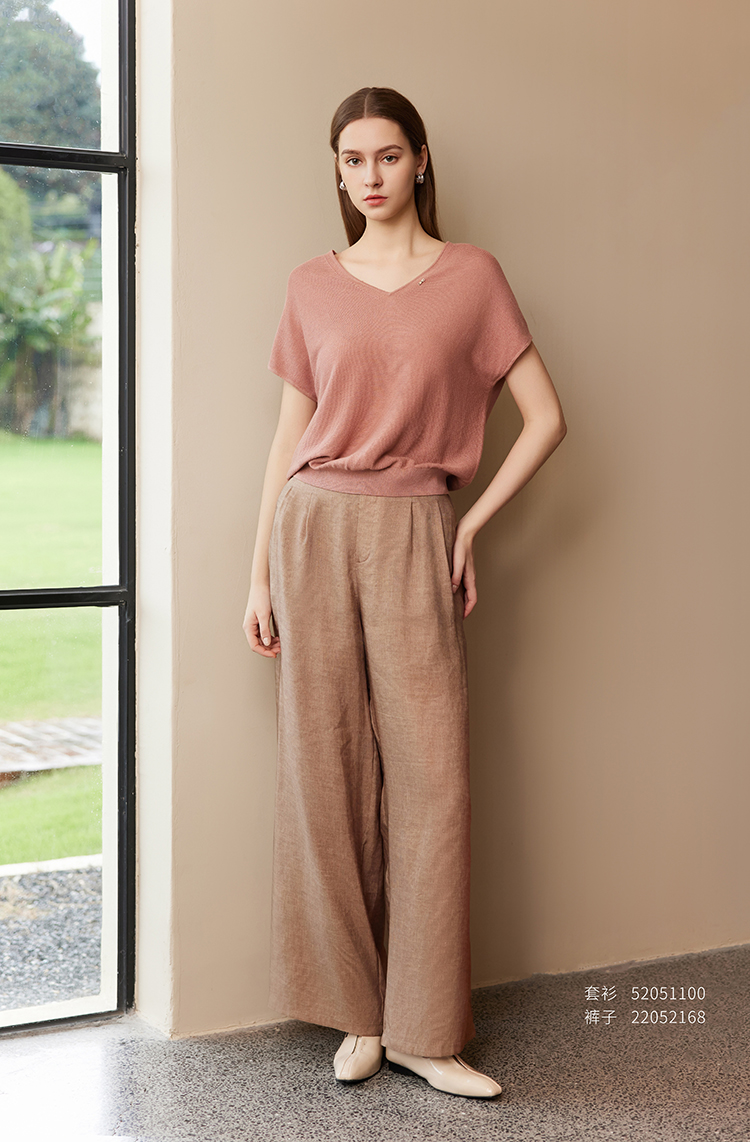 【棉丝麻混纺针织上衣】25年夏季新品女士V领短袖上衣薄款舒适毛衣