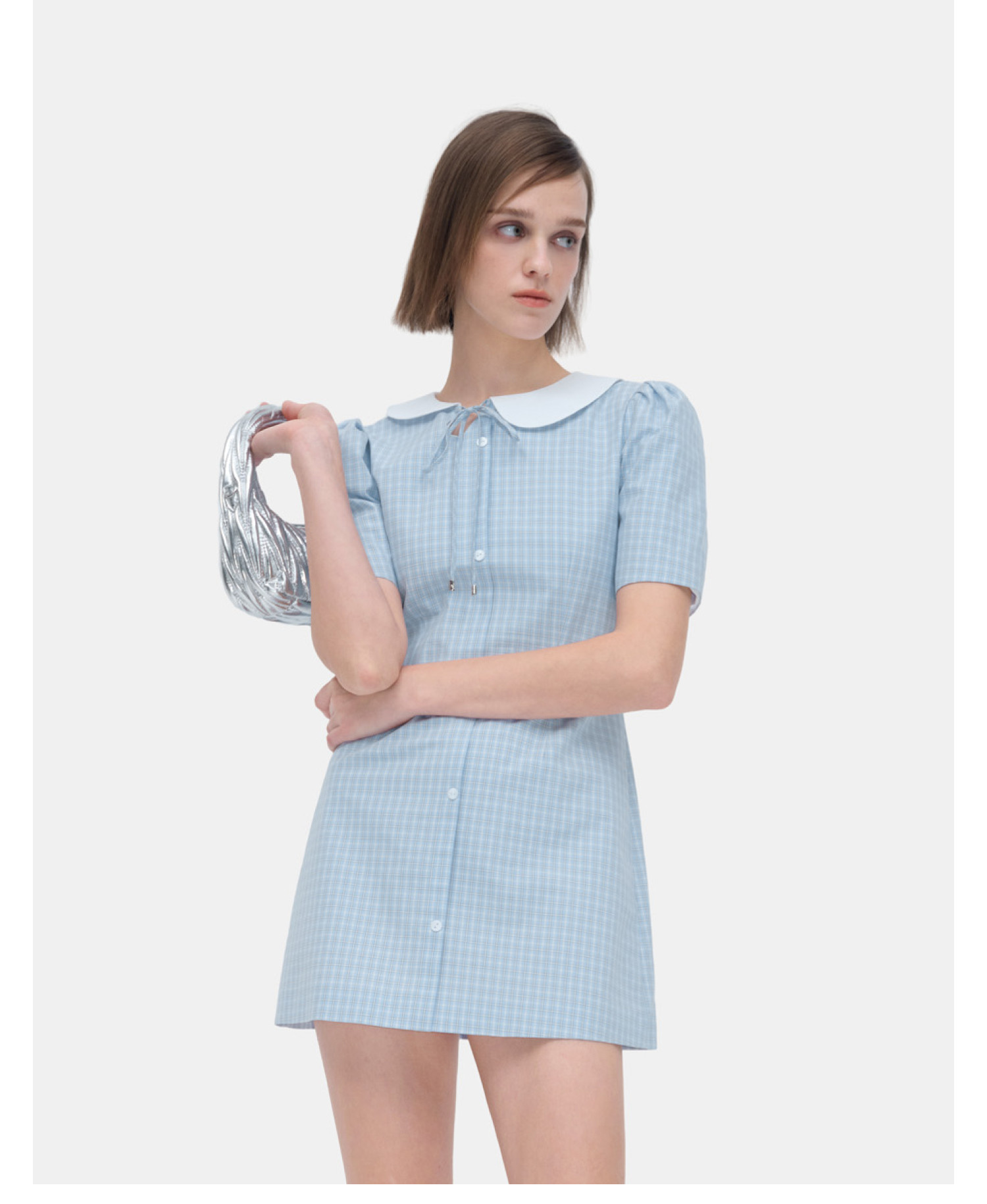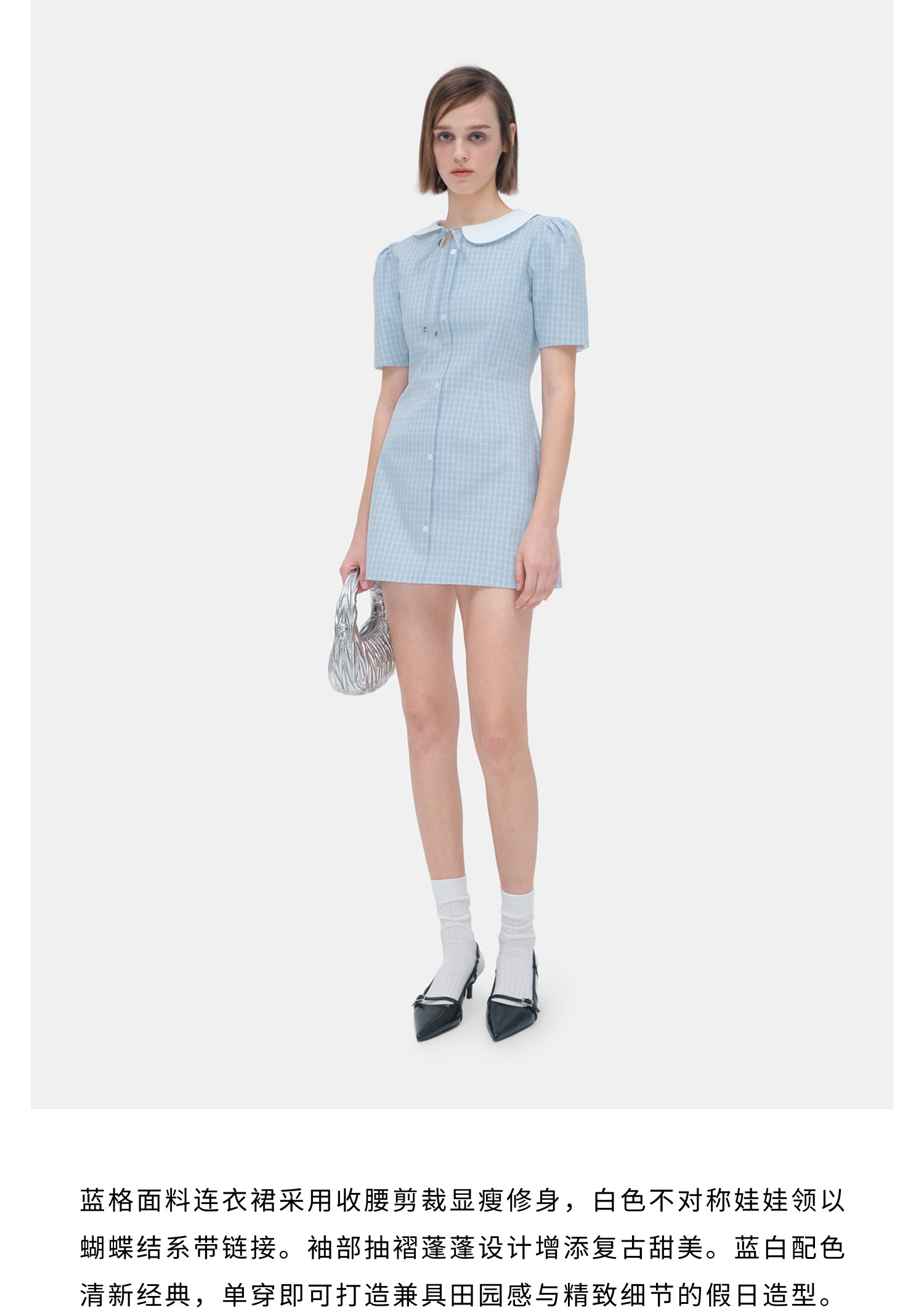 HERLIAN 2026年春夏新品不规则娃娃领蓝格修身收腰裙女连衣裙