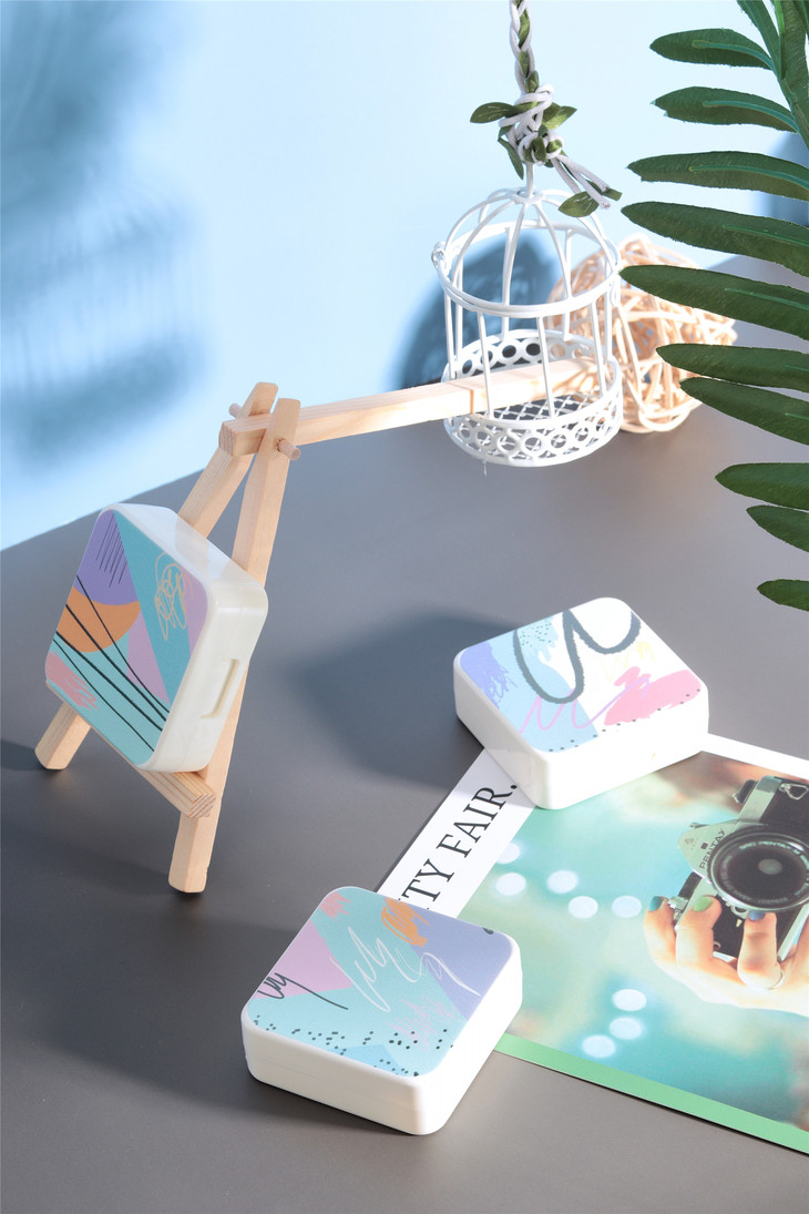 2、双联盒注入七成保存液后、装存镜片(注意镜片放入盒内,请勿放在双联盒边缘)拧紧盒盖。