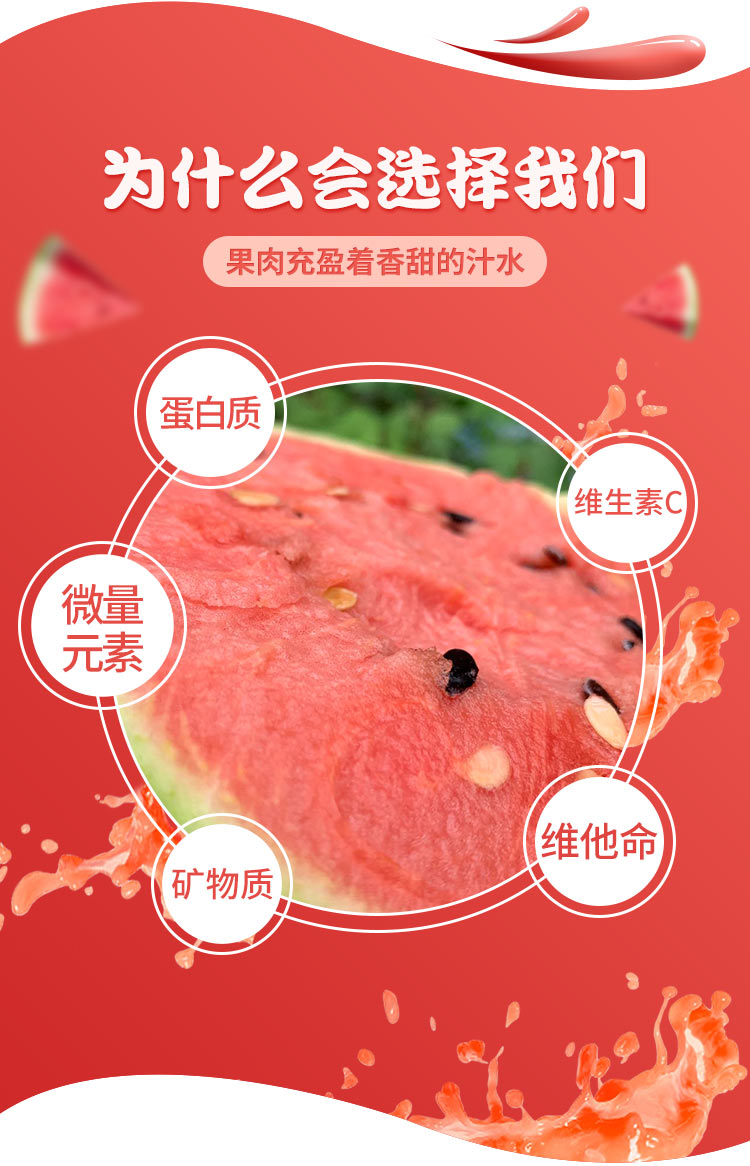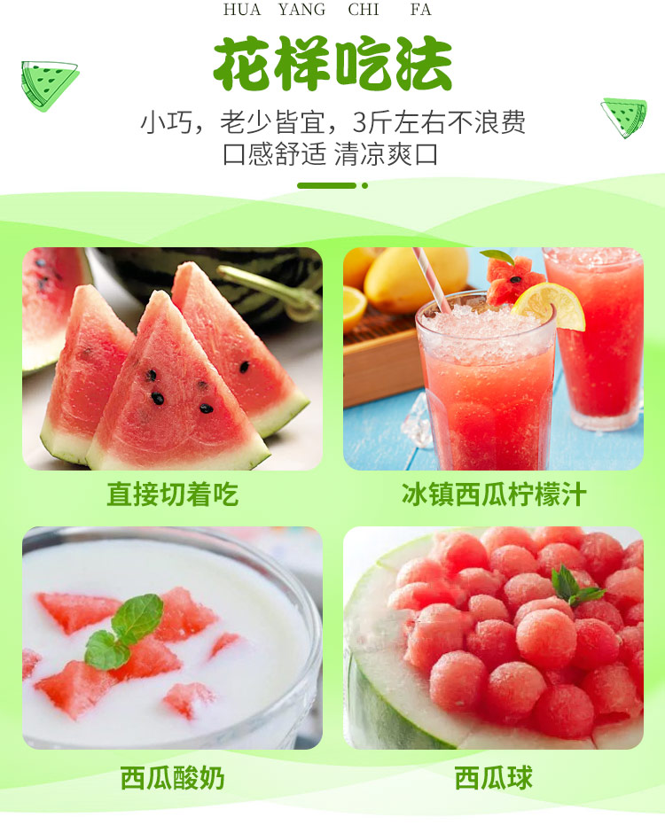 清爽解渴,味道甘味多汁,是盛夏佳果,含有大量葡萄糖、苹果酸、果糖、蛋白氨基酸、番茄素及丰富的维生素C等物质,常吃西瓜可以防暑降温,消夏祛暑,还能刺激肠蠕动、促进大便通畅。