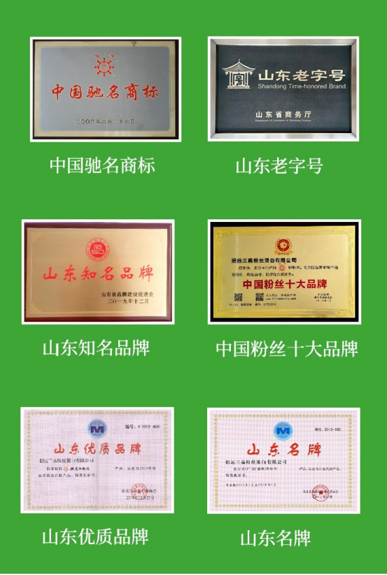 🌟【品牌介绍】 【冠珠】被评定为,中国驰名商标、山东老字号、山东知名品牌、山东名牌、山东优质品牌等多个品牌荣誉。 【冠珠】通过了质量管理体系认证、美国FDA、英国BRC 全球食品安全认证、国际标准IFS等等国际标准产品安全认证 【烟台三嘉粉丝有限公司】更是被认定为山东省农业产业化重点龙头企业、荣获“食安山东”食品生产加工示范企业、新六产示范企业的称号。