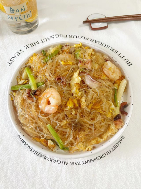 🍤南北菜系均可接纳的海鲜炒粉~ 根据我的做法,美味又上头 食材:虾仁,章鱼足,鸡蛋,龙口粉丝,葱,蒜 做法: 1.虾仁,章鱼足,龙口粉丝等食材焯水煮熟 2.大火热油,下入鸡蛋划散,加入葱蒜和食材翻炒30秒 3.加入调料(一勺耗油、三勺生抽、一勺鸡精、1/3勺盐、),翻炒1分钟即可出锅