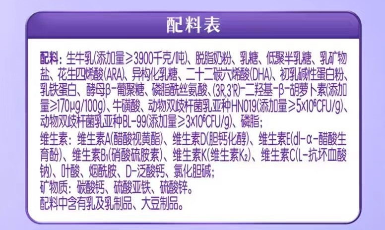 1.第一原料为优质“生牛乳”,“脱脂乳粉”位于配料表第2位,非全生牛乳原料制造;
