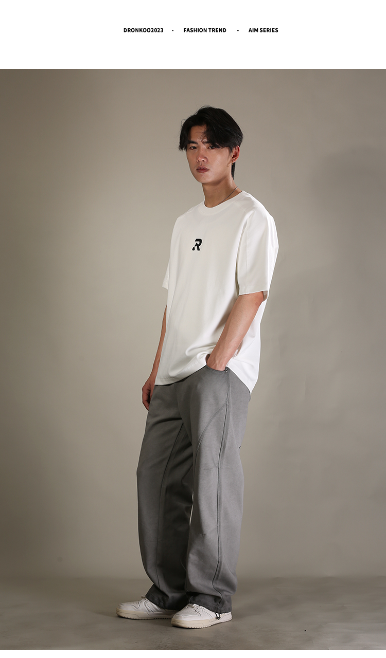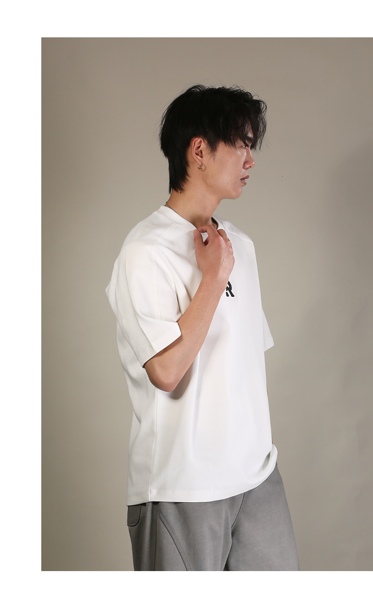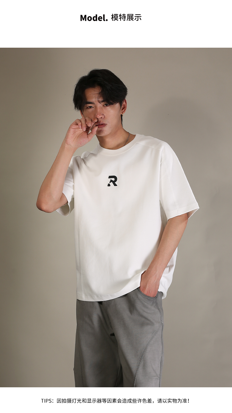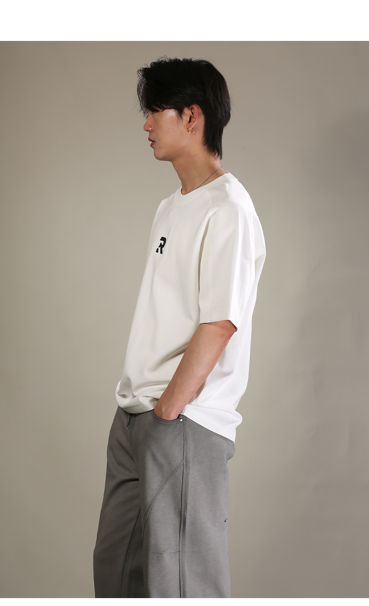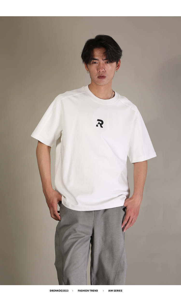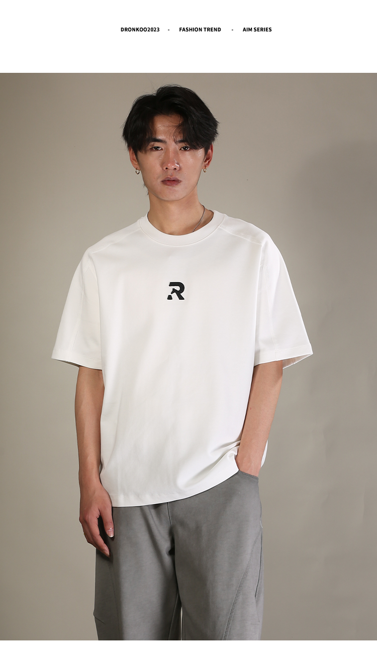 DRONKOO 2026 圆领前R刺绣肩毛边短袖T恤