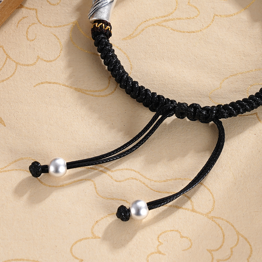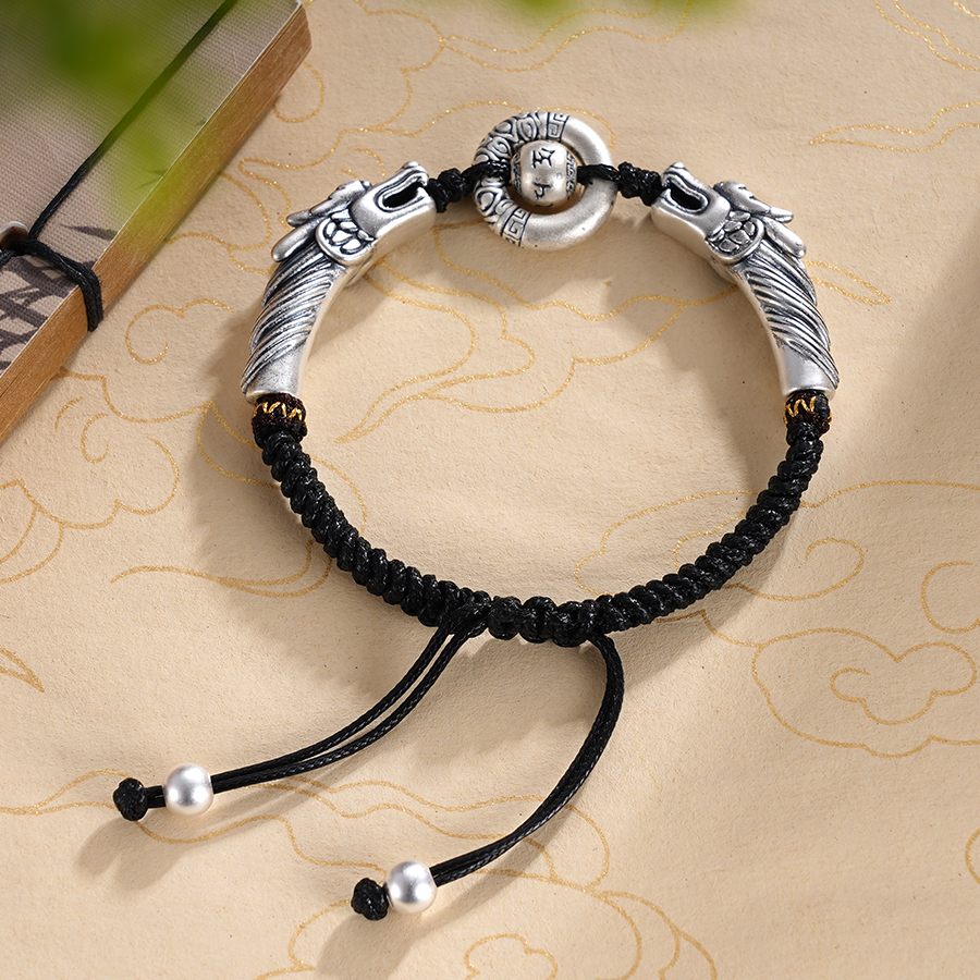 【寓意】:作品灵感源自“双龙戏珠”,两条银龙呈对称姿态,守护平安扣圆珠,象征着如意吉祥与财源滚滚。通过编织绳糅合搭配,古韵延绵、神韵生动。