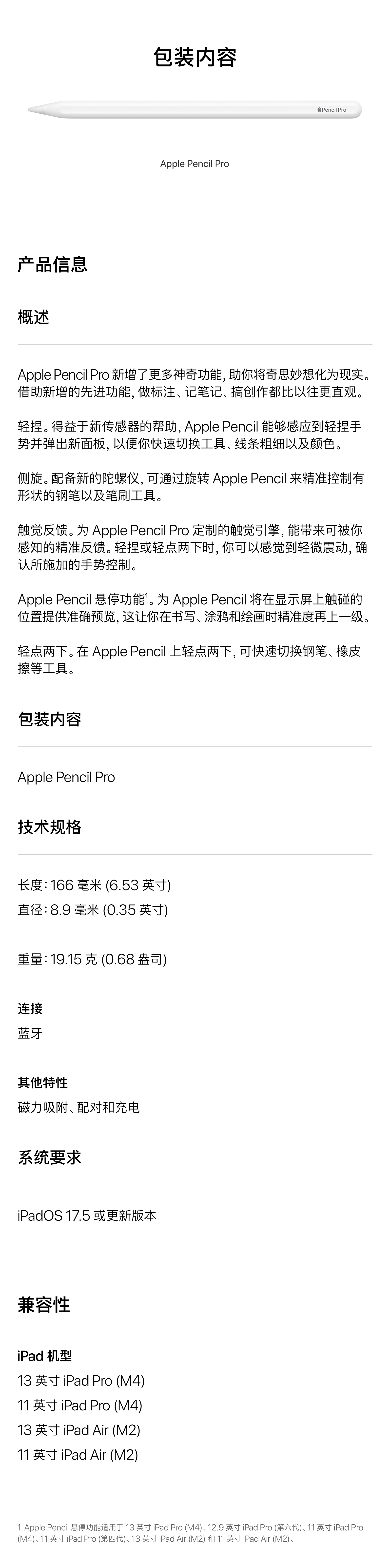 Apple/苹果 Pencil Pro 适用于 2024年新款 11英寸和13英寸iPad Pro (M4)/iPad Air (M2)