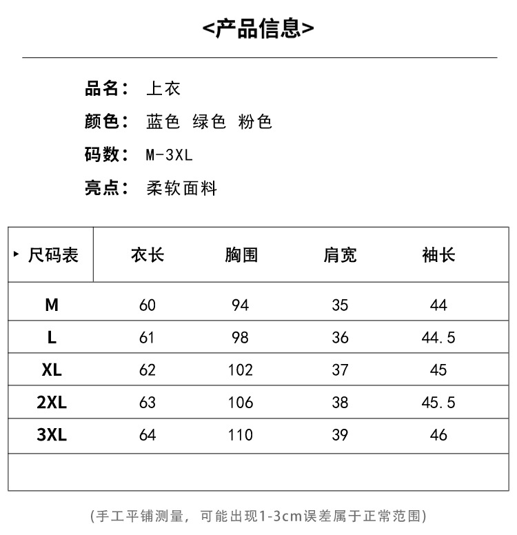 因裁剪工艺和丈量手法不同,可能存在1~3CM 左右误差,尺码仅供参考,以实物为准