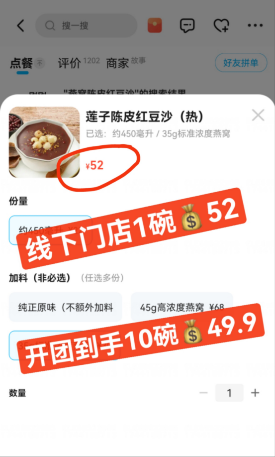在糖水店,点燕窝陈皮绿豆沙/陈皮红豆沙 一碗都要💰52元 团购价10碗💰49.9秒杀❗ 甄选印尼燕窝➕️新会陈皮➕️建宁莲子 折算下来每碗不到5元 比咱们平时点的下午茶外卖还便宜!