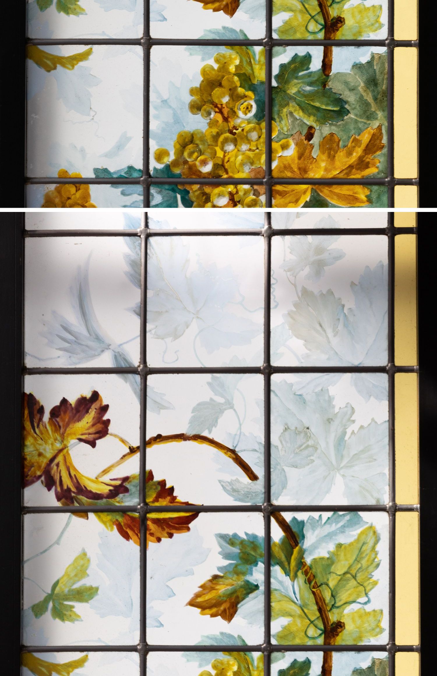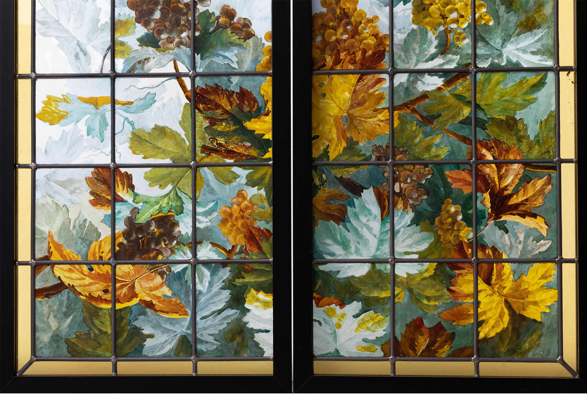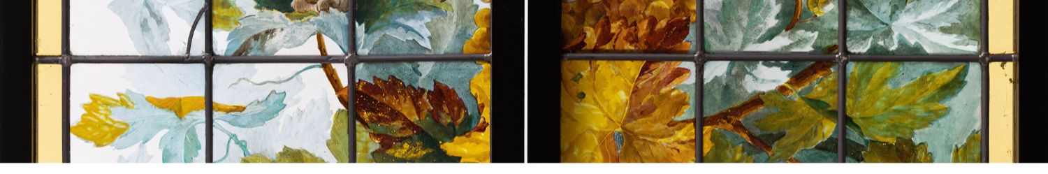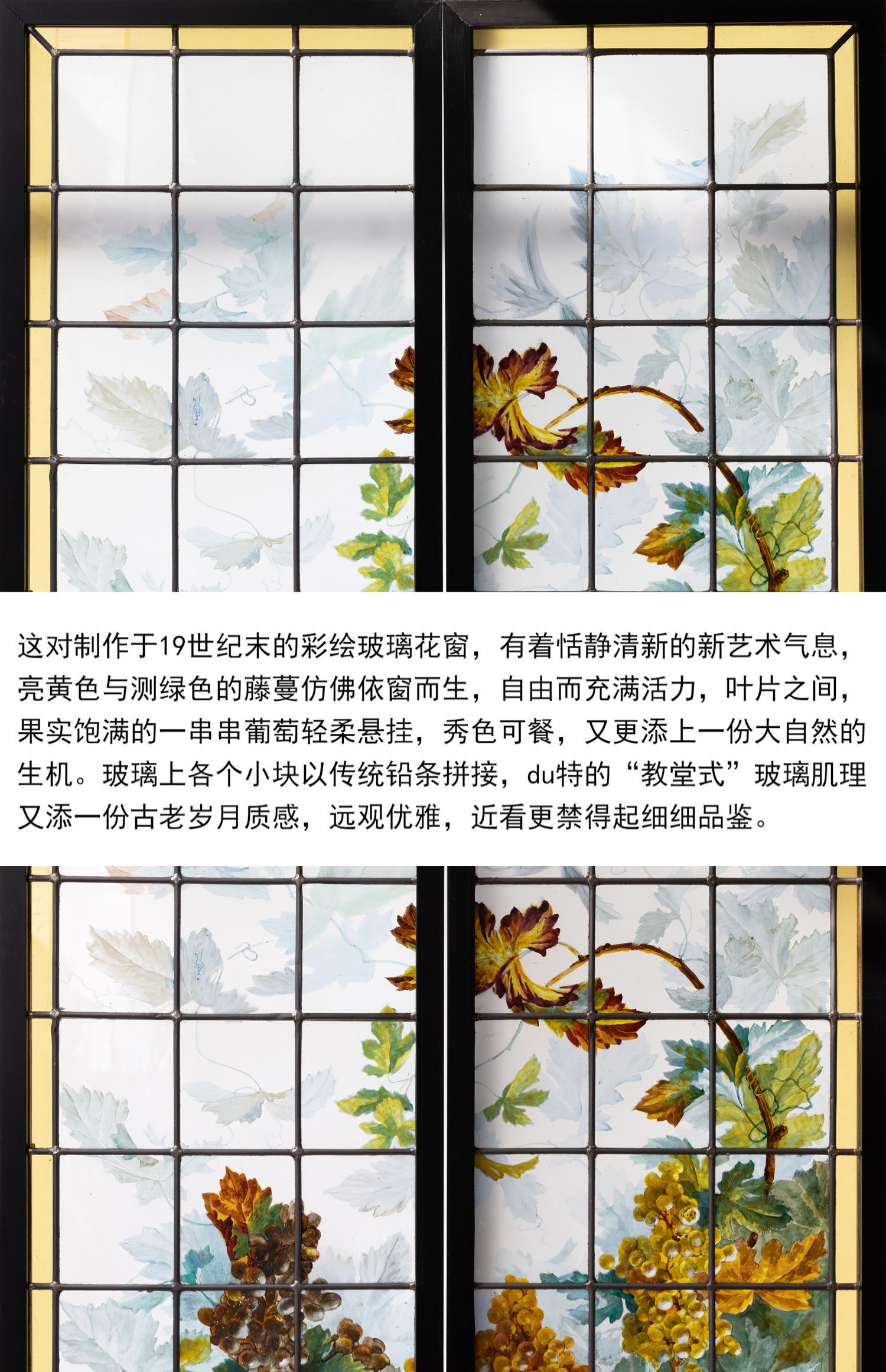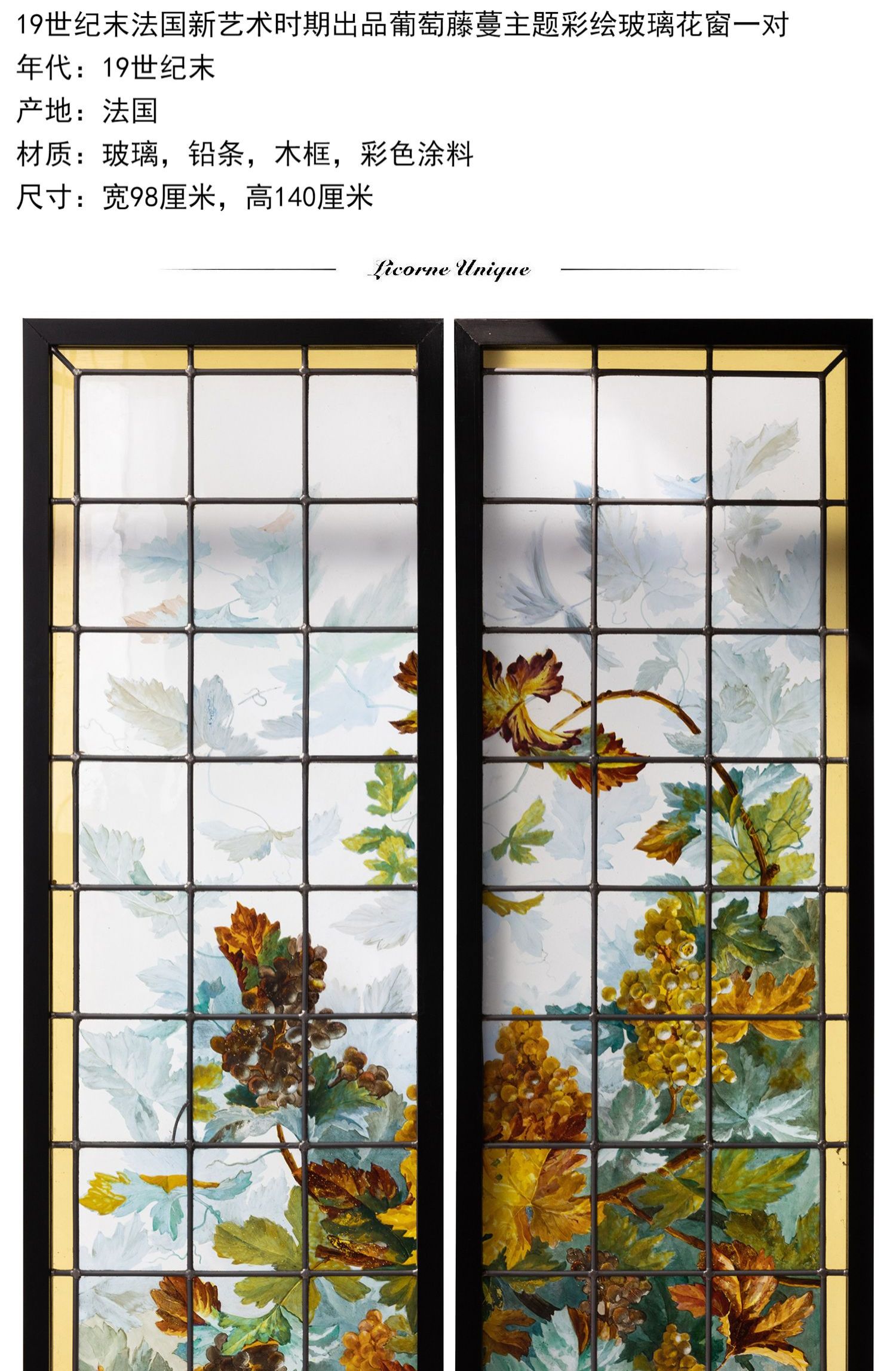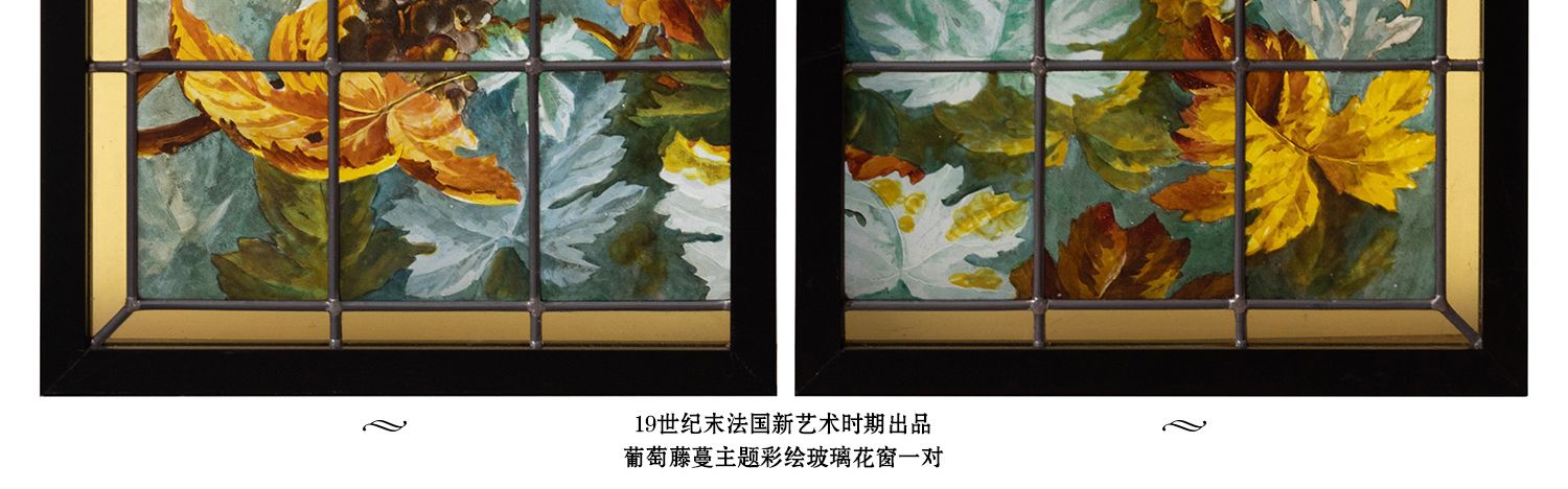 独角鹿西洋古董法国新艺术时期出品葡萄藤蔓主题彩绘玻璃花窗一对
