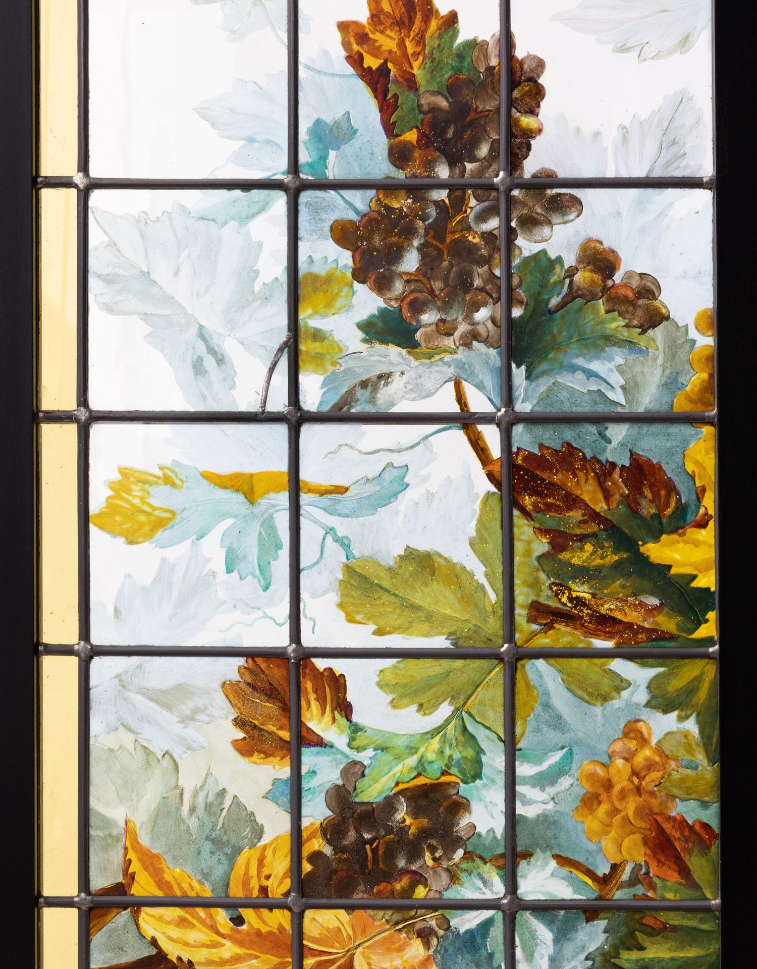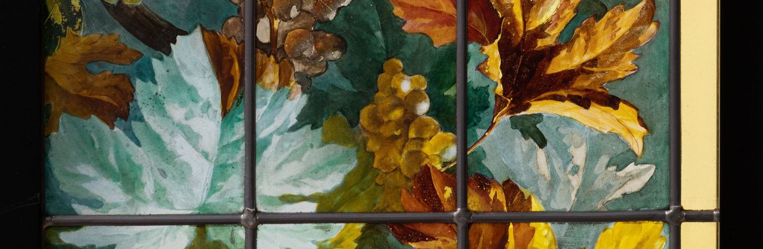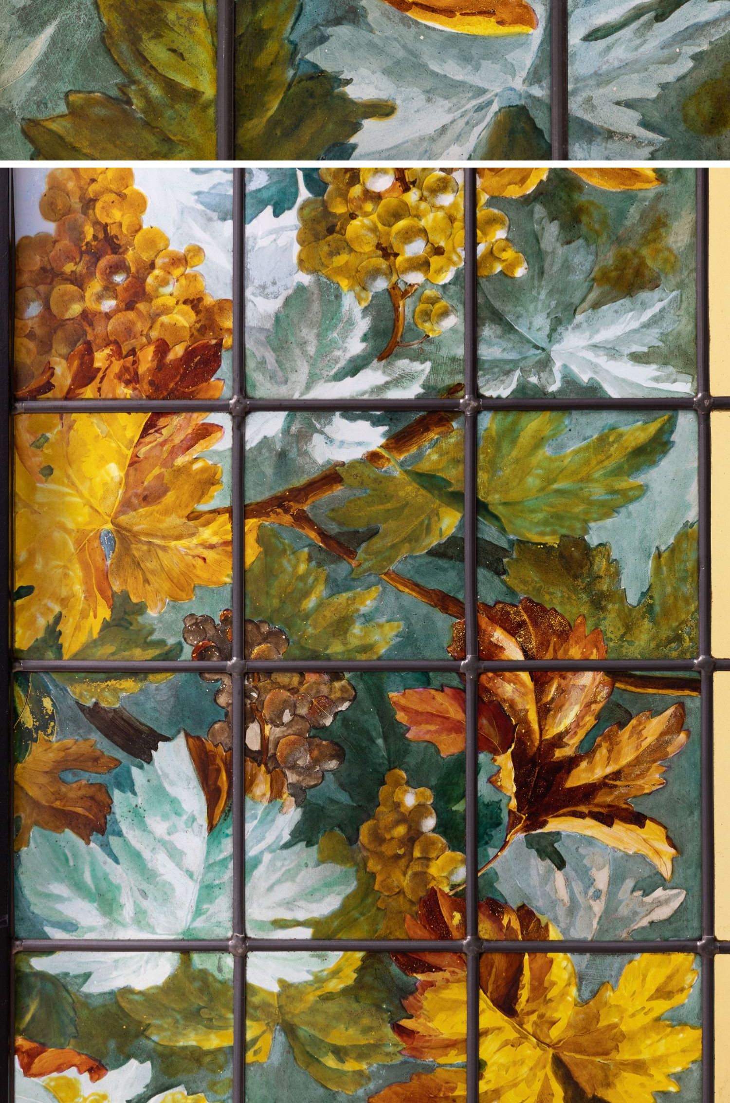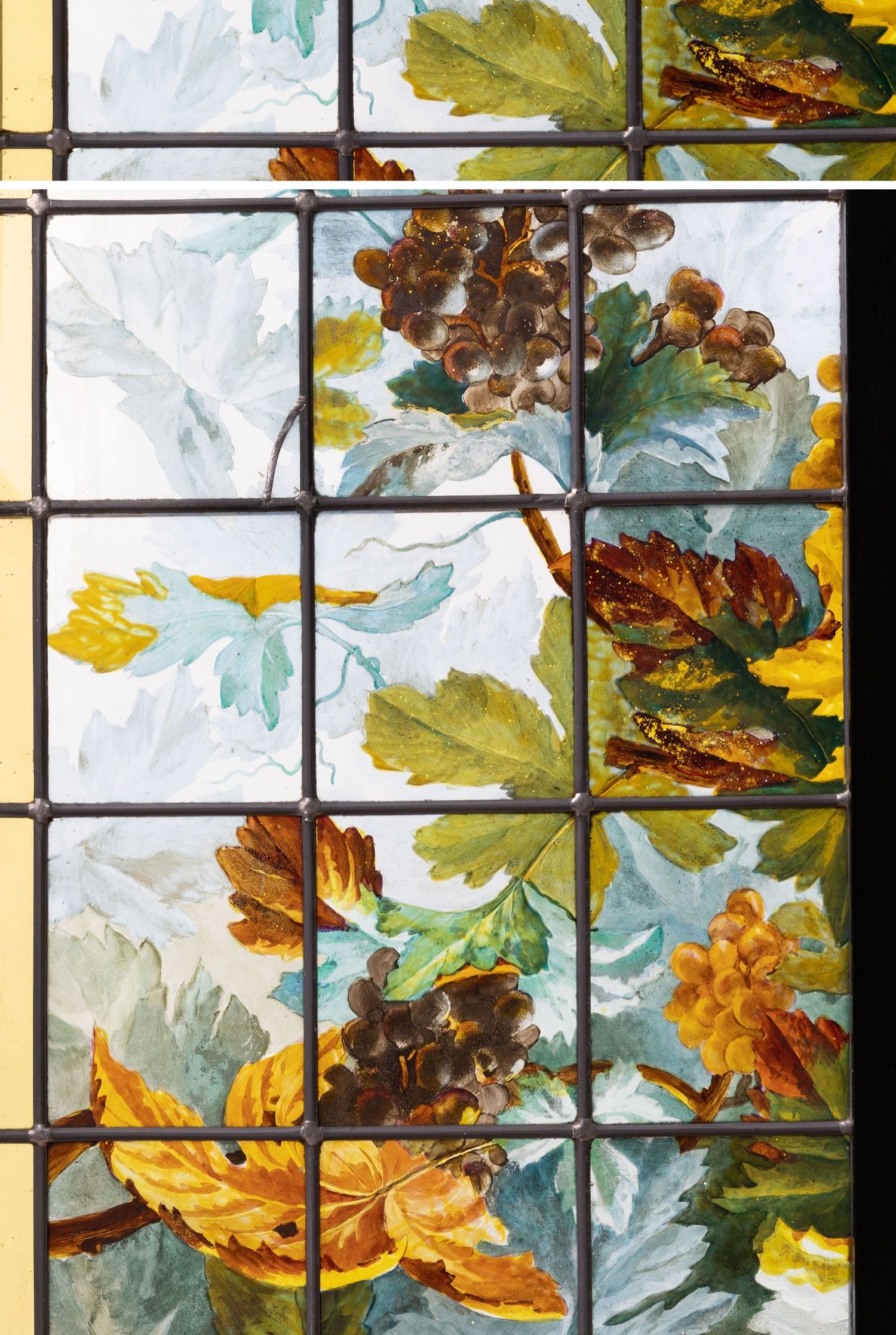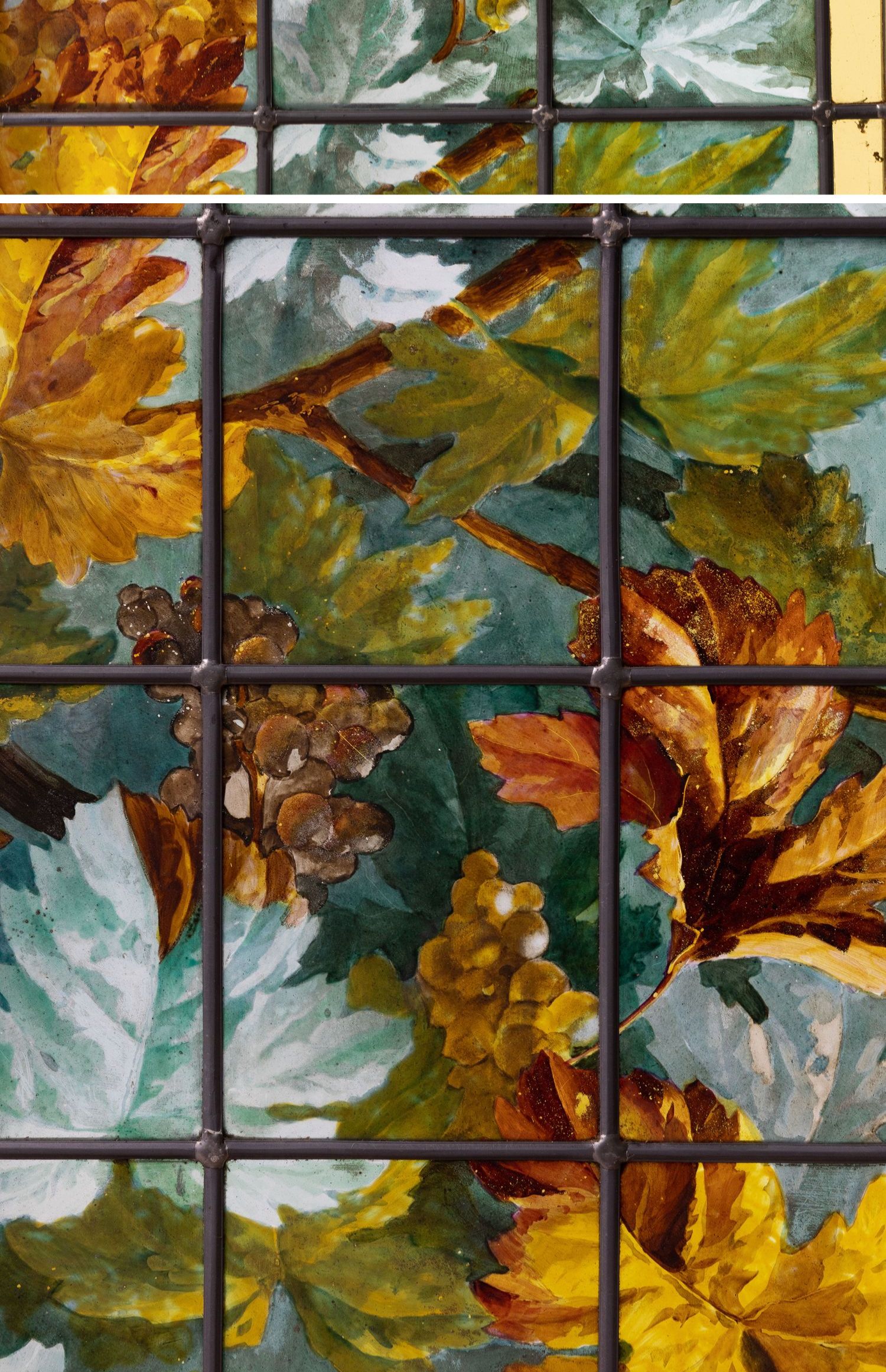 独角鹿西洋古董法国新艺术时期出品葡萄藤蔓主题彩绘玻璃花窗一对