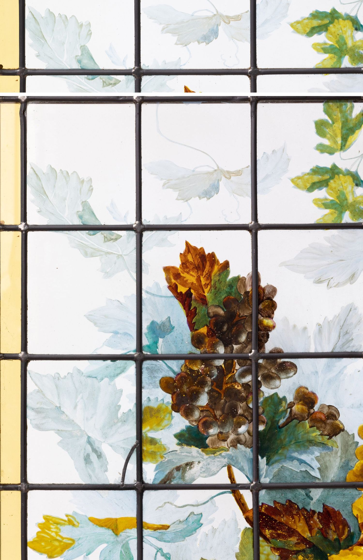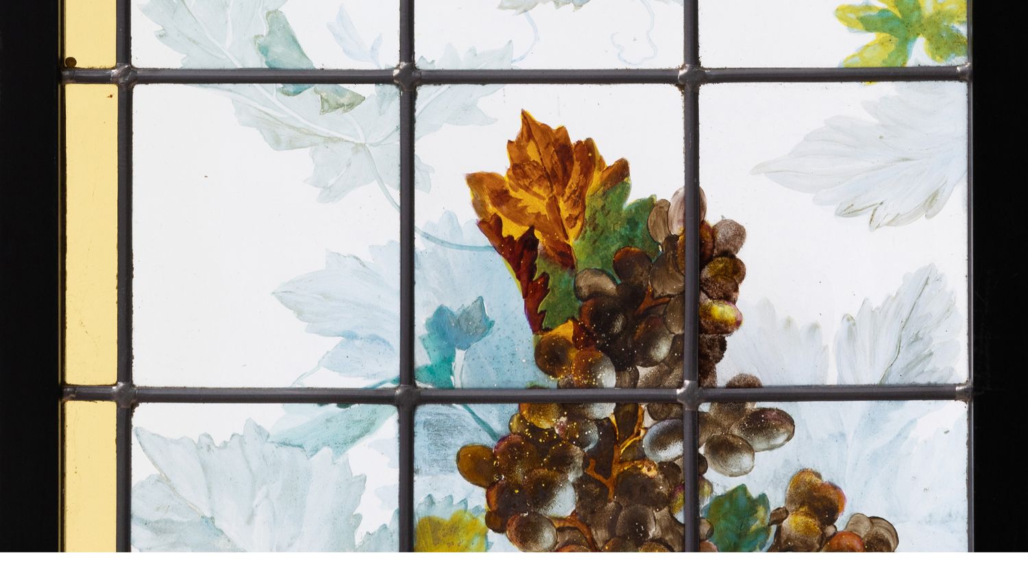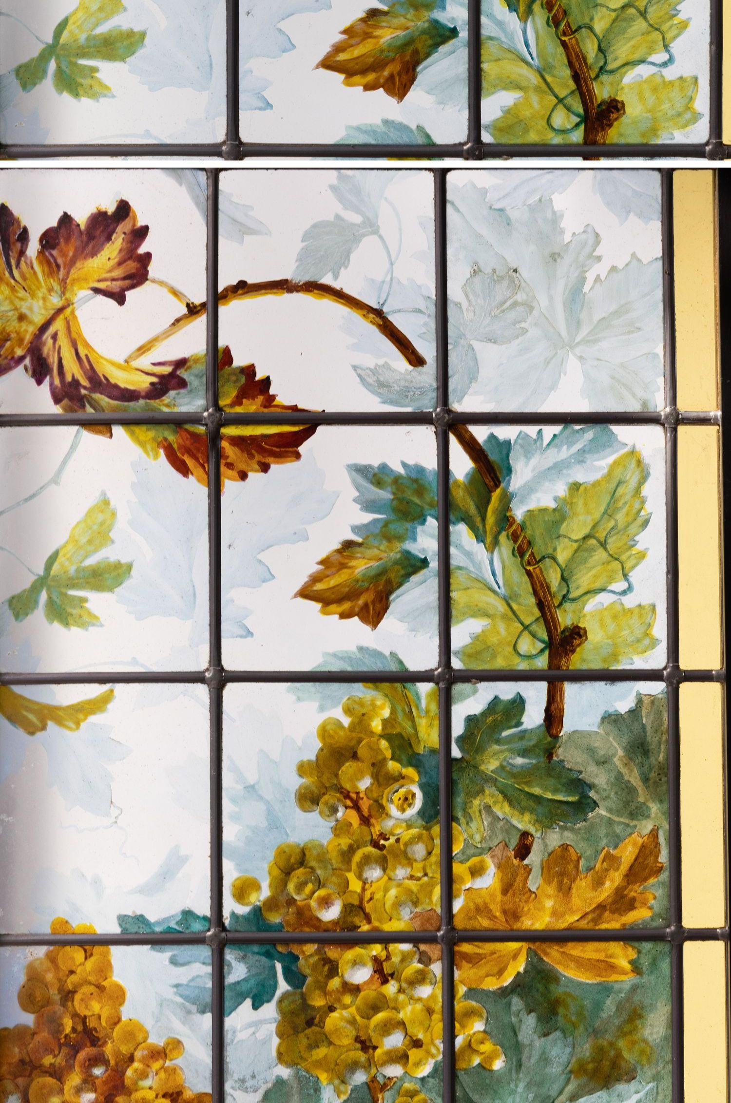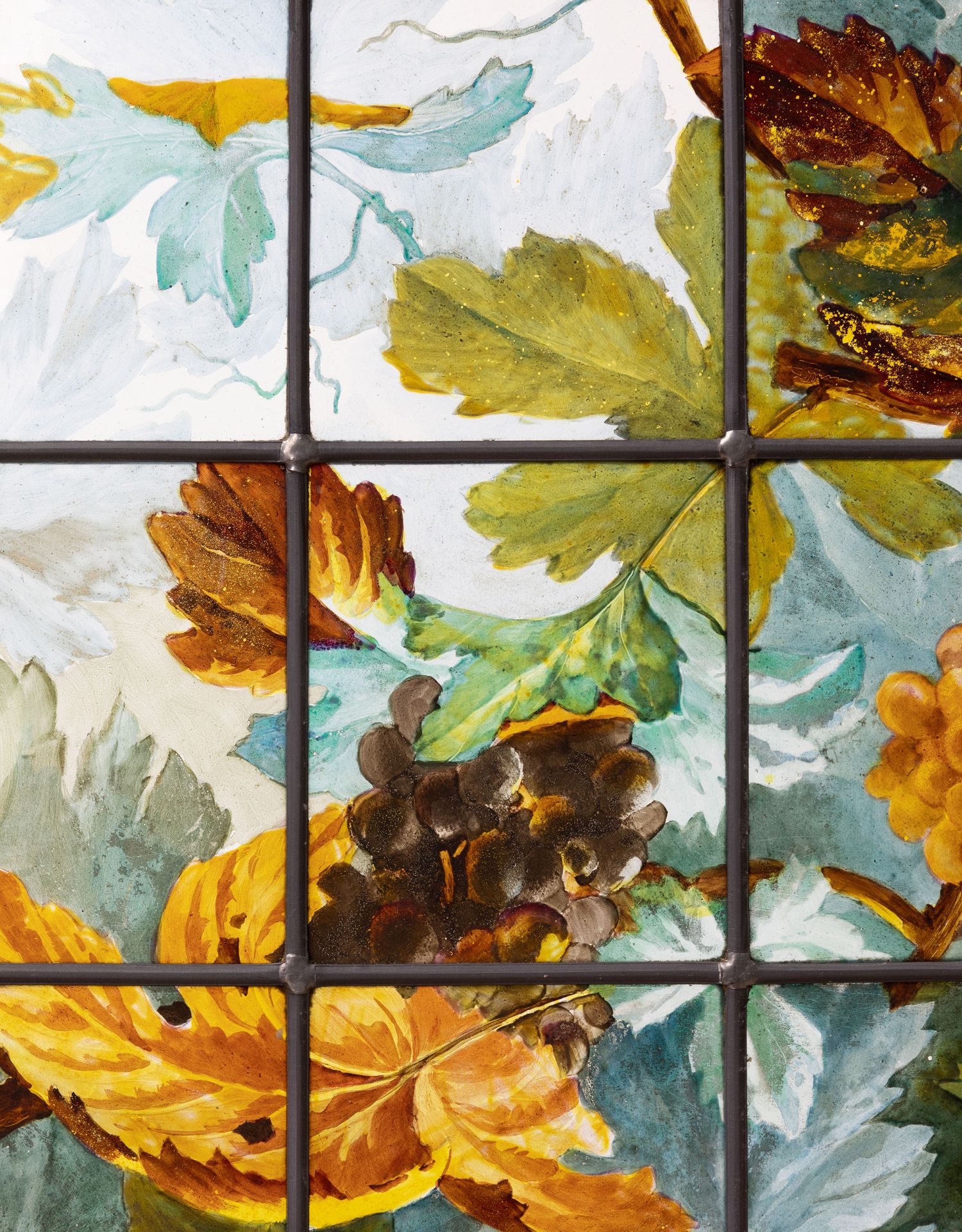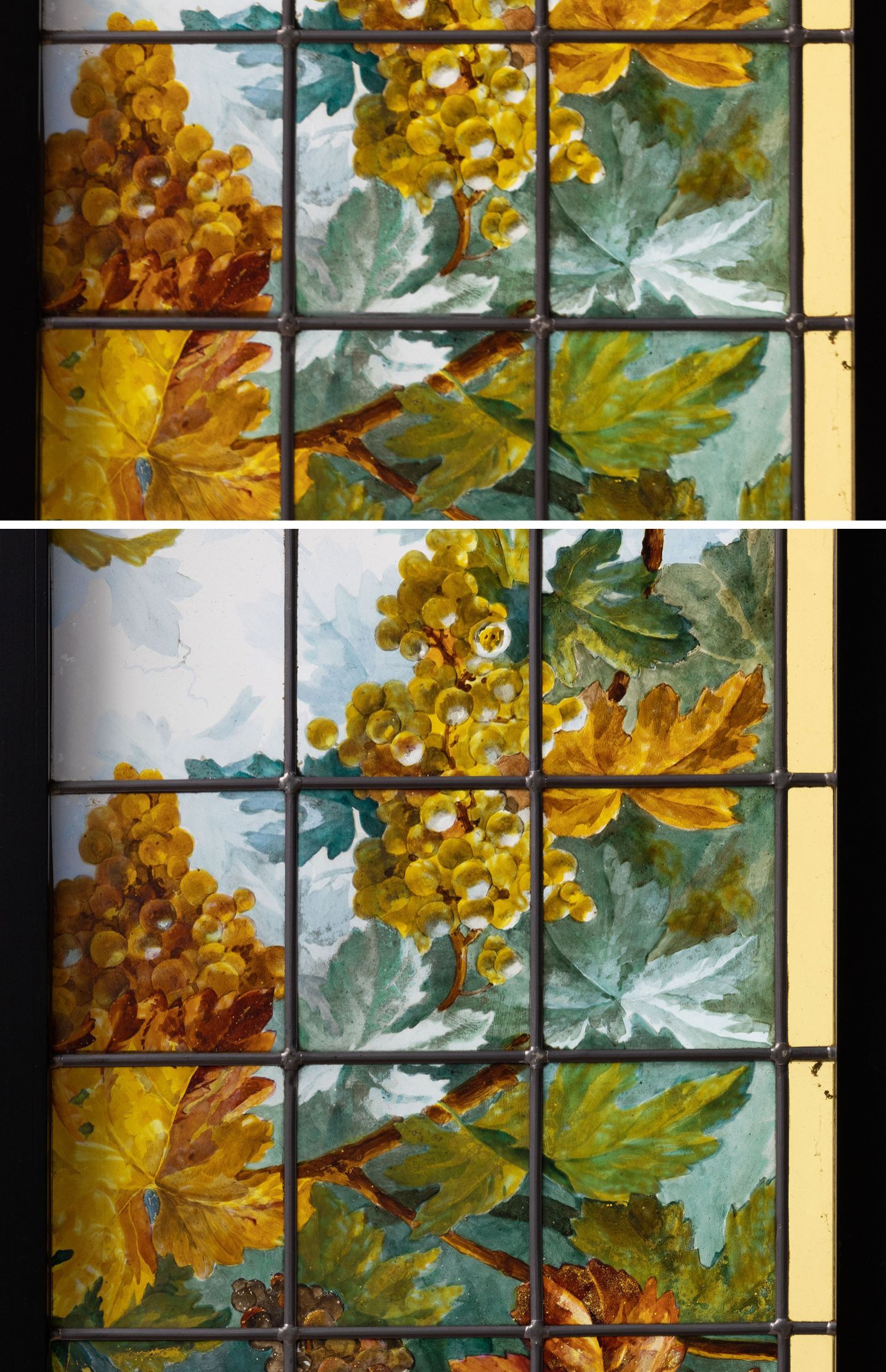 独角鹿西洋古董法国新艺术时期出品葡萄藤蔓主题彩绘玻璃花窗一对