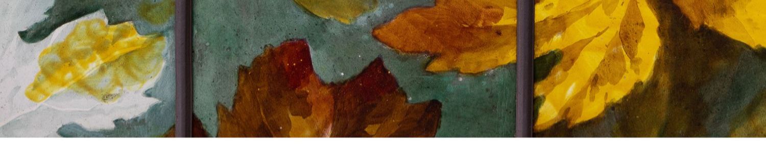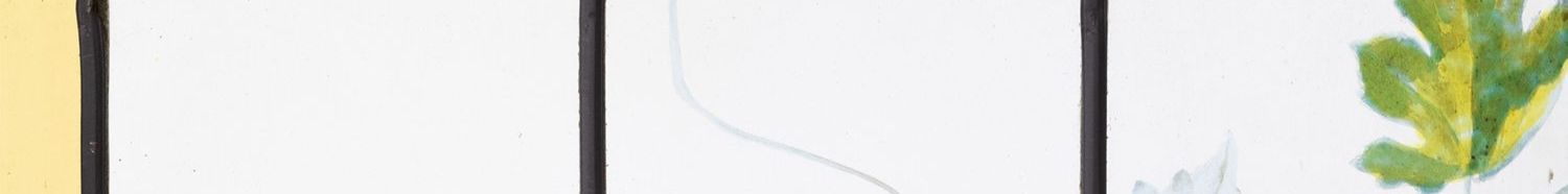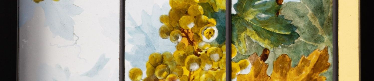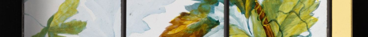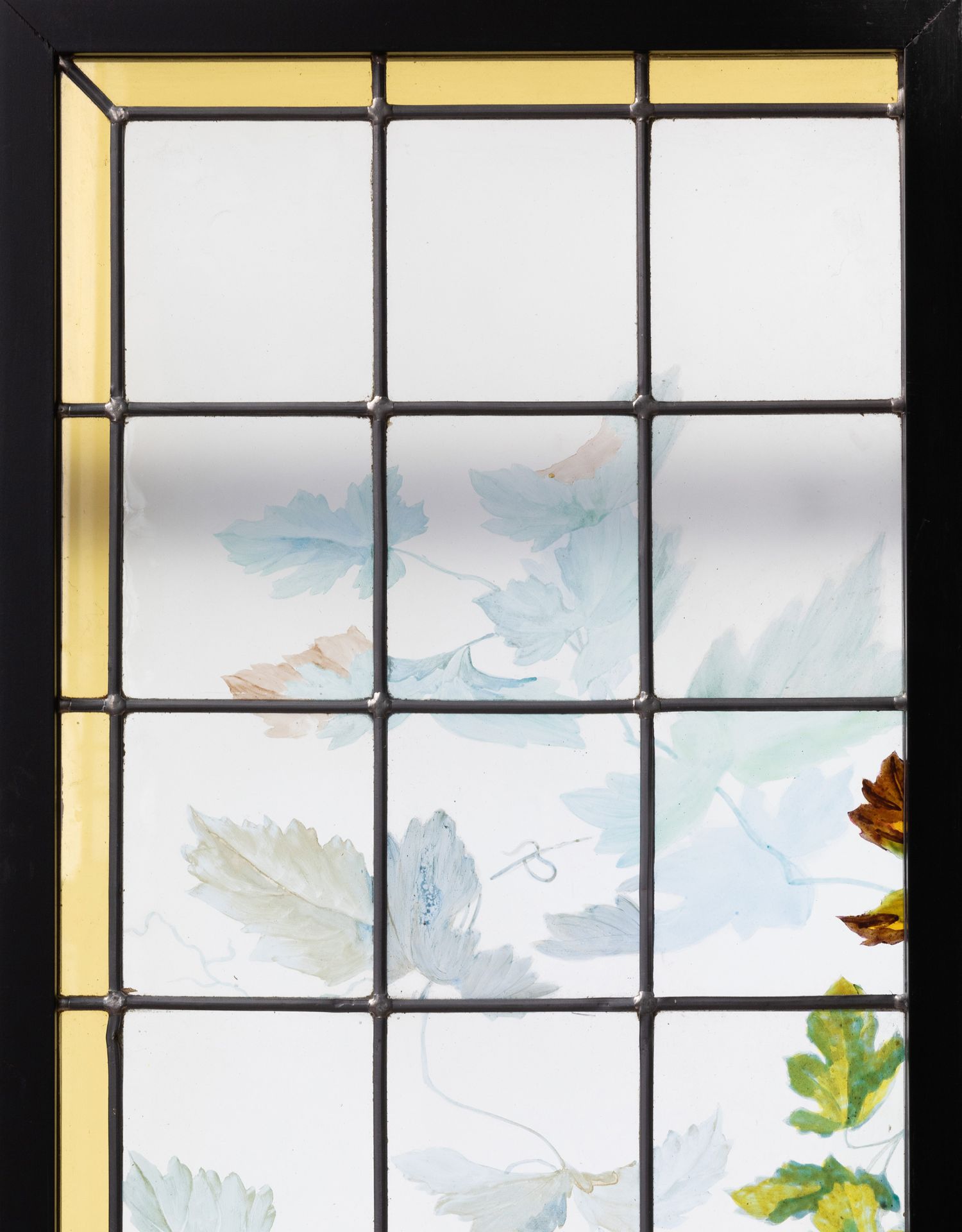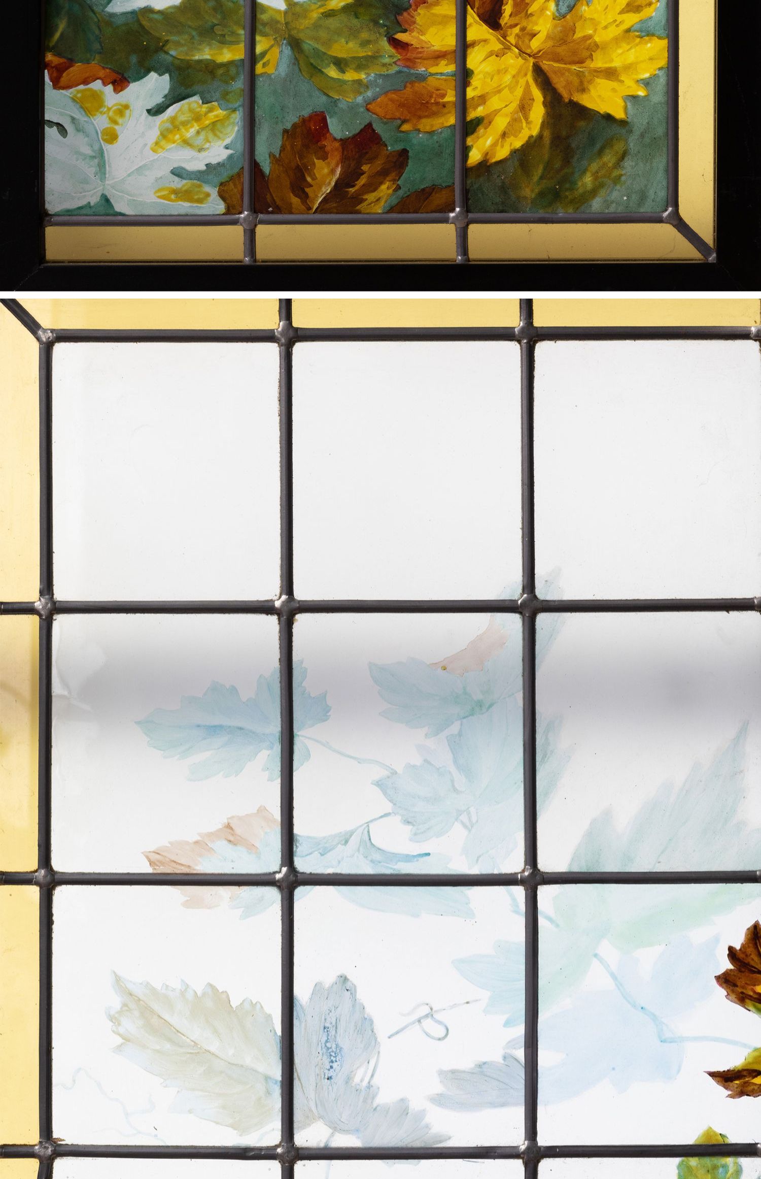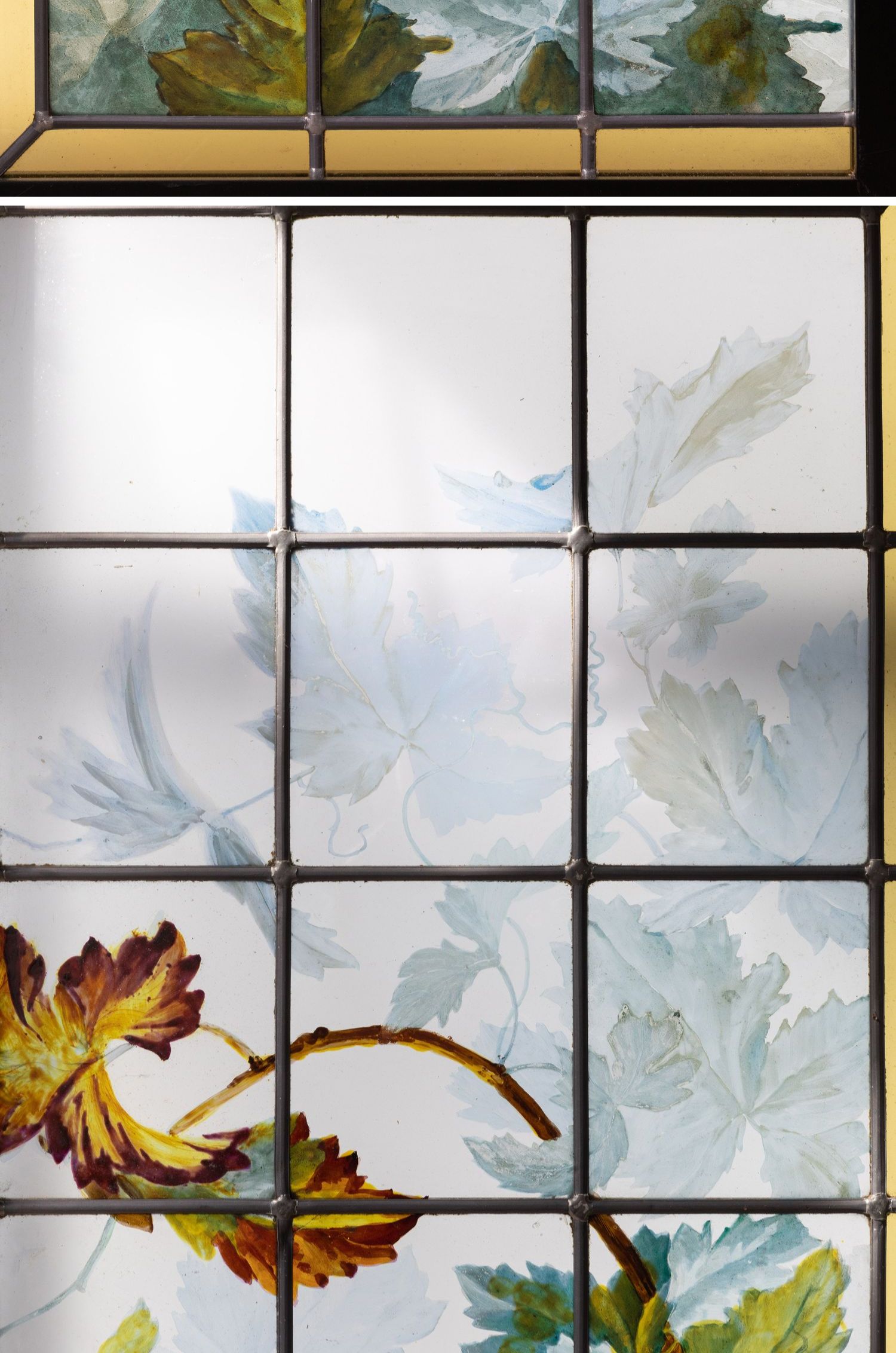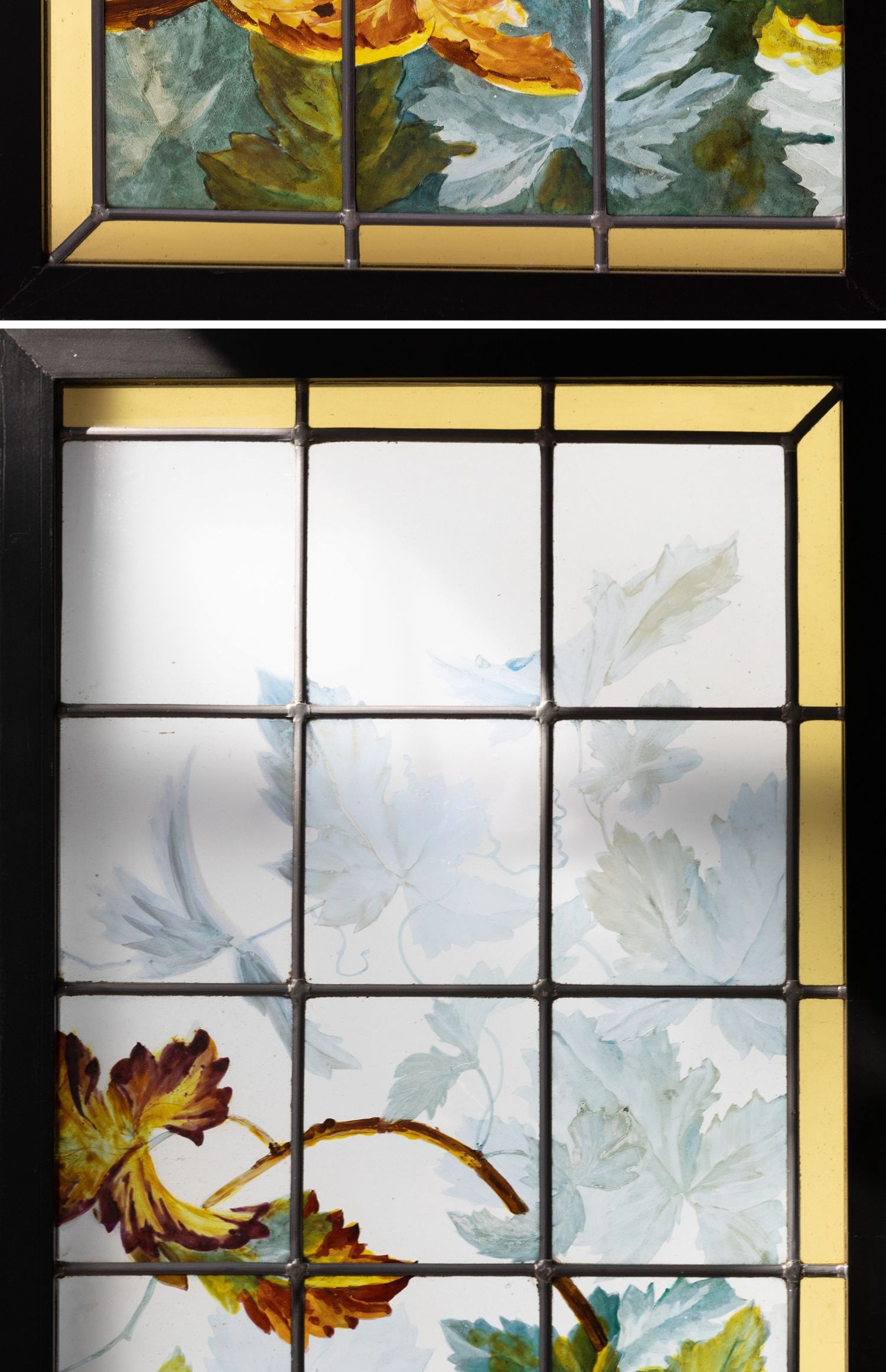 独角鹿西洋古董法国新艺术时期出品葡萄藤蔓主题彩绘玻璃花窗一对