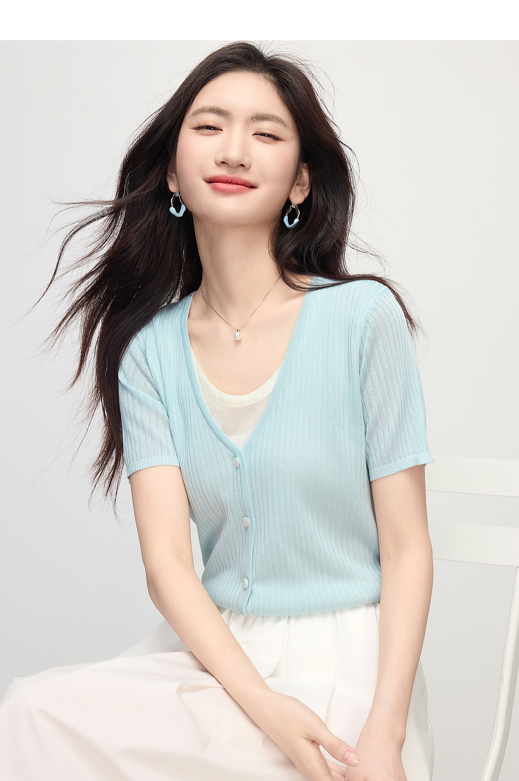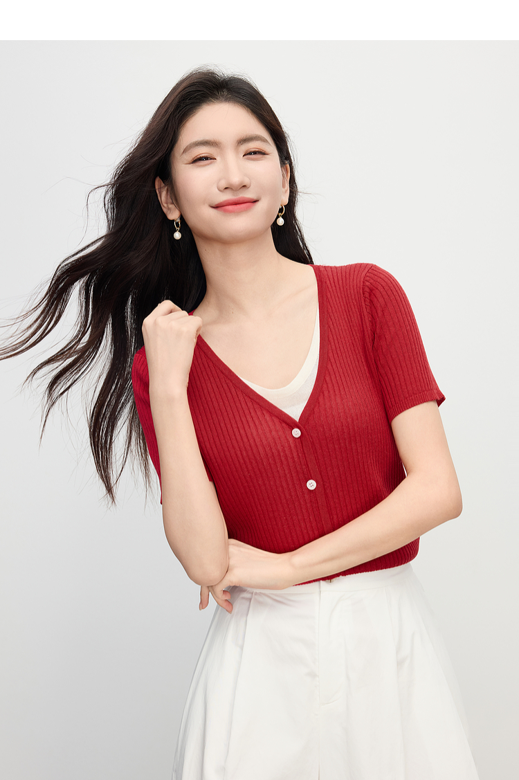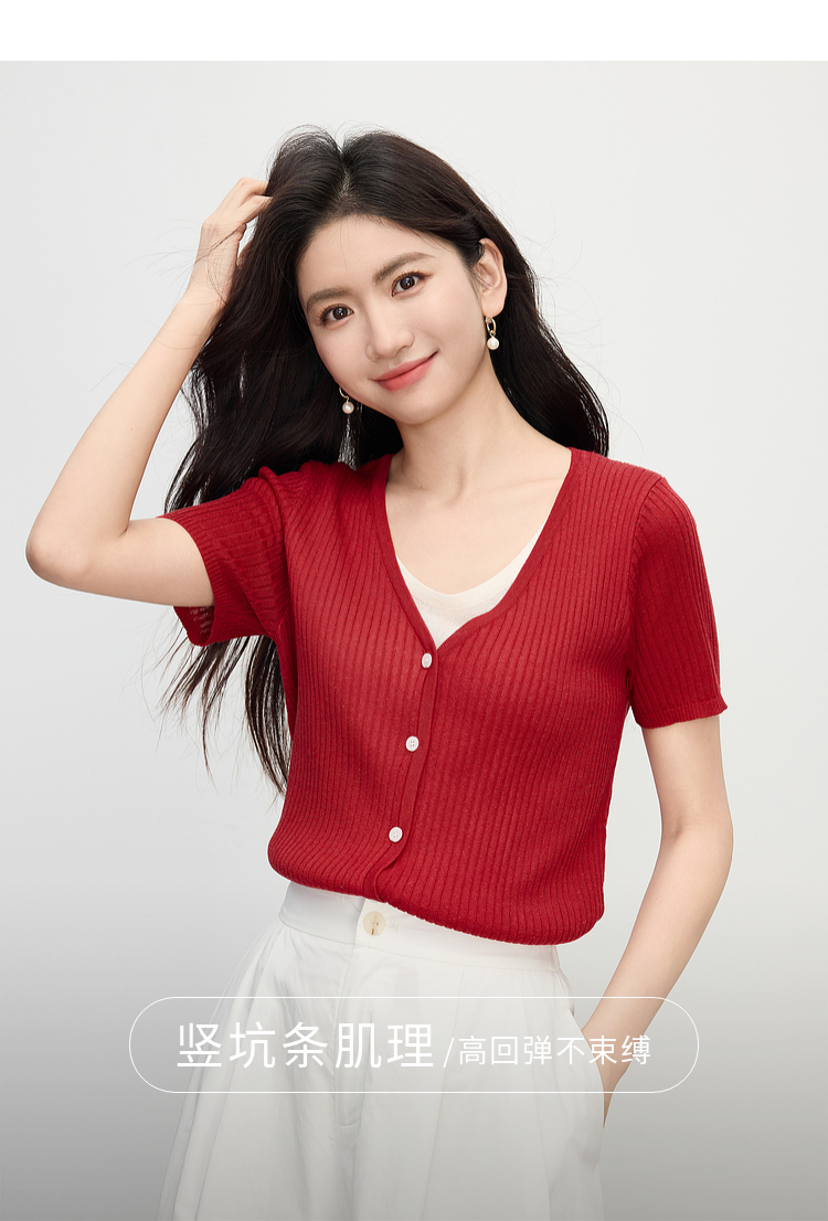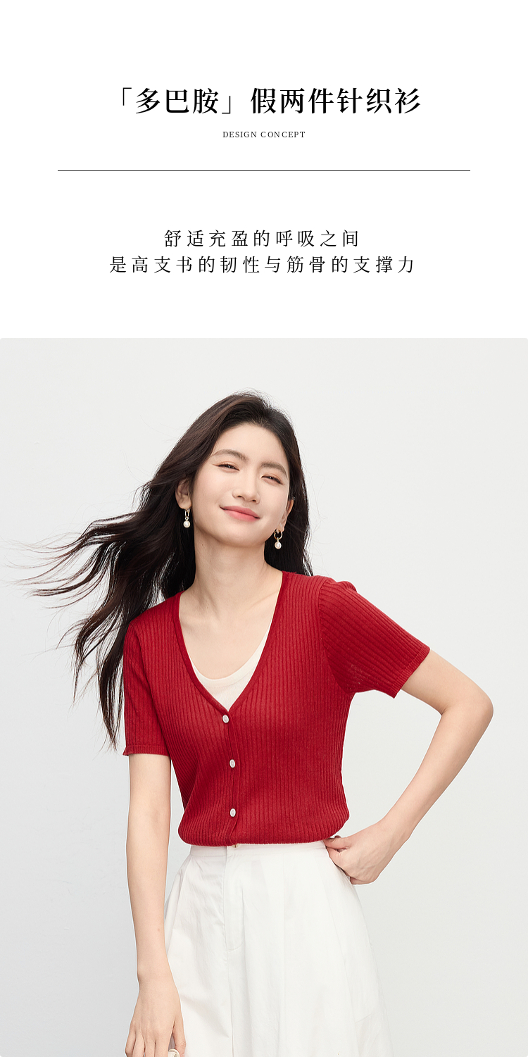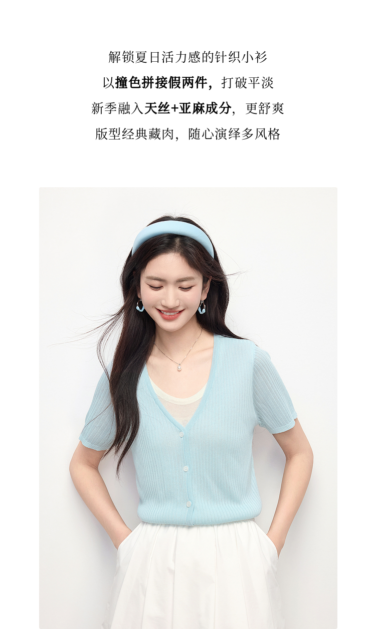 【专属特价】熙世界天丝亚麻薄款针织衫女夏日2025新款撞色圆领短袖假两件上衣