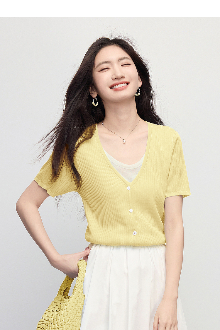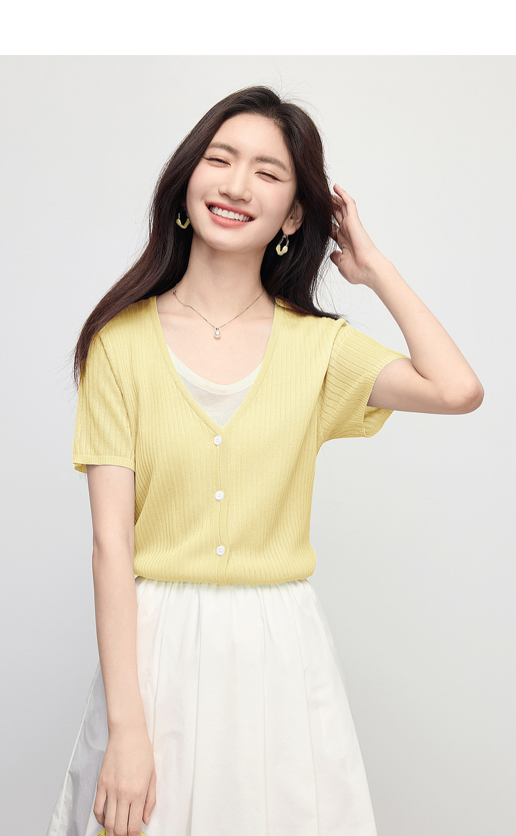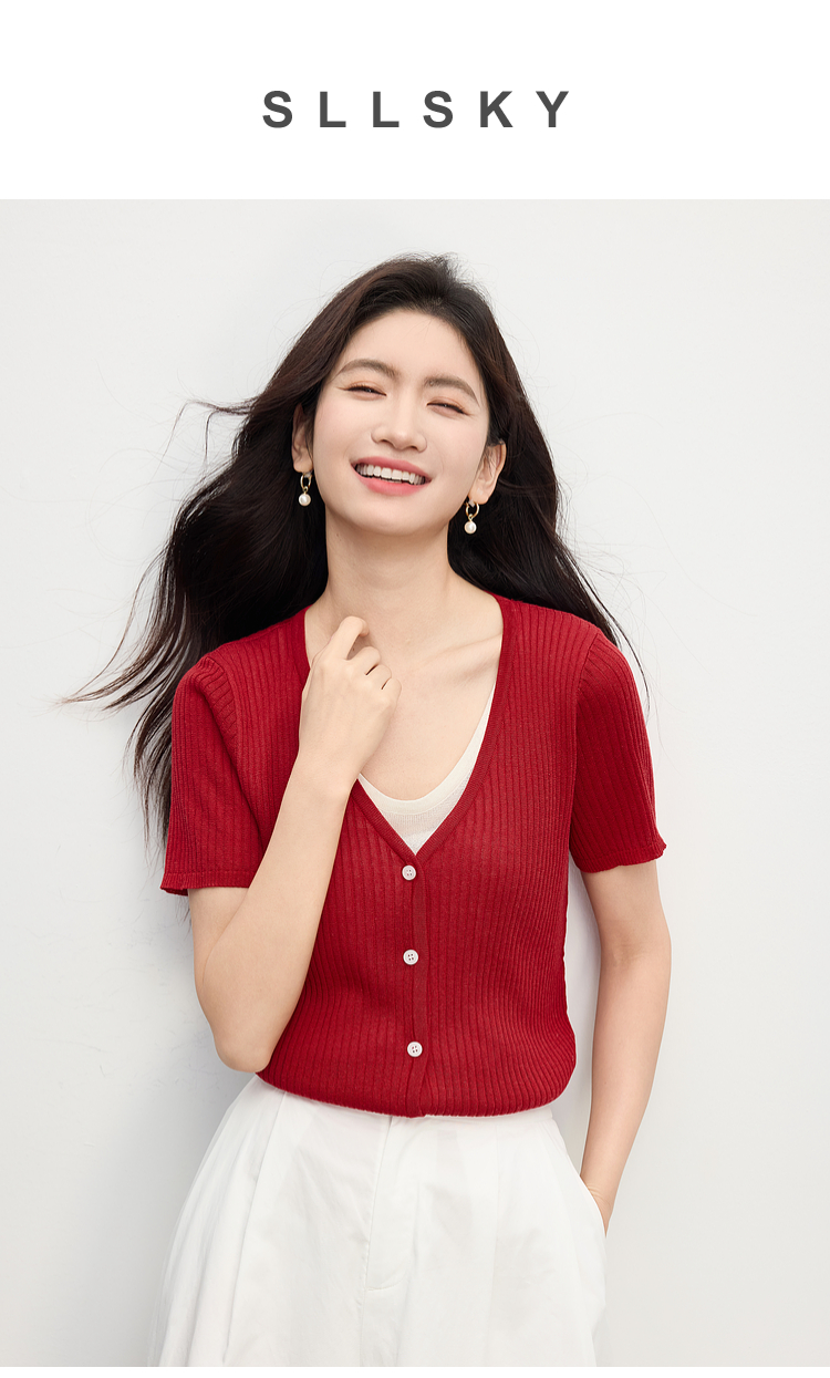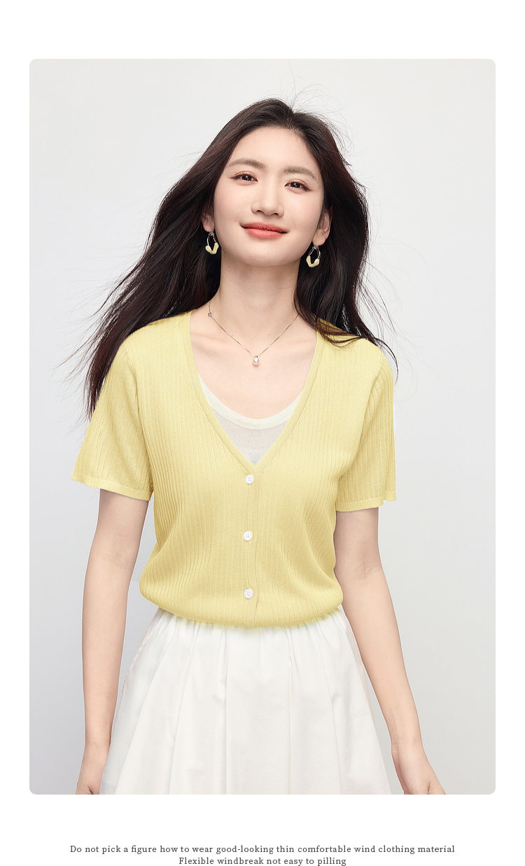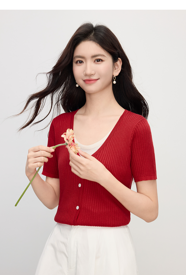 【专属特价】熙世界天丝亚麻薄款针织衫女夏日2025新款撞色圆领短袖假两件上衣