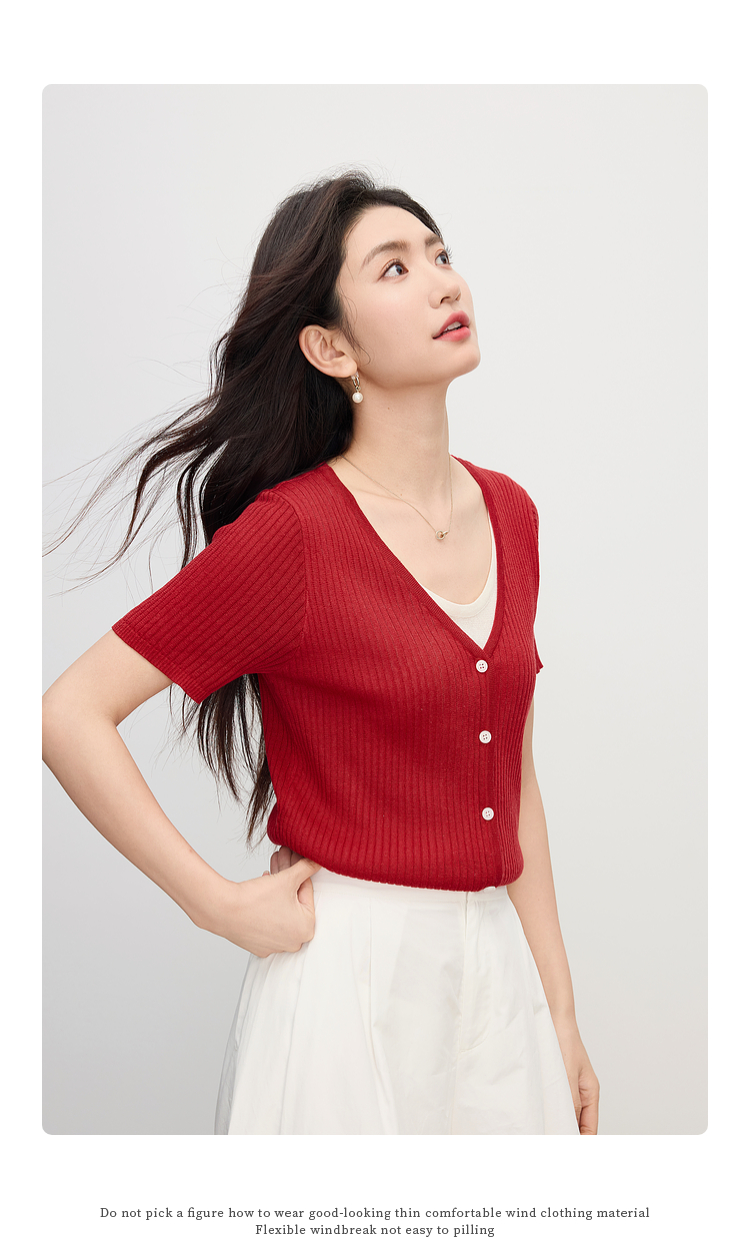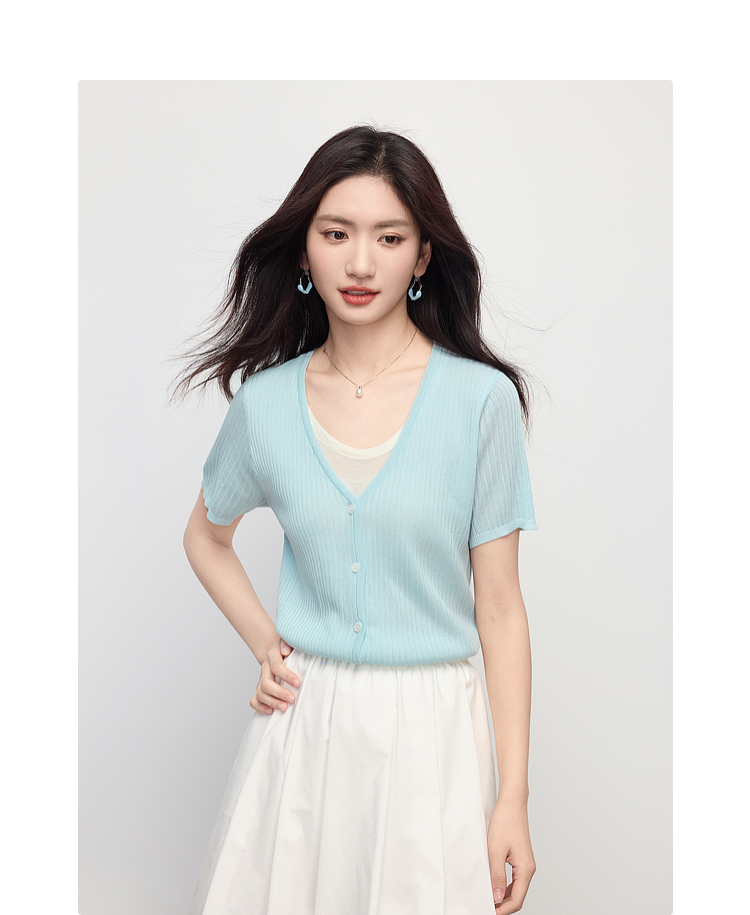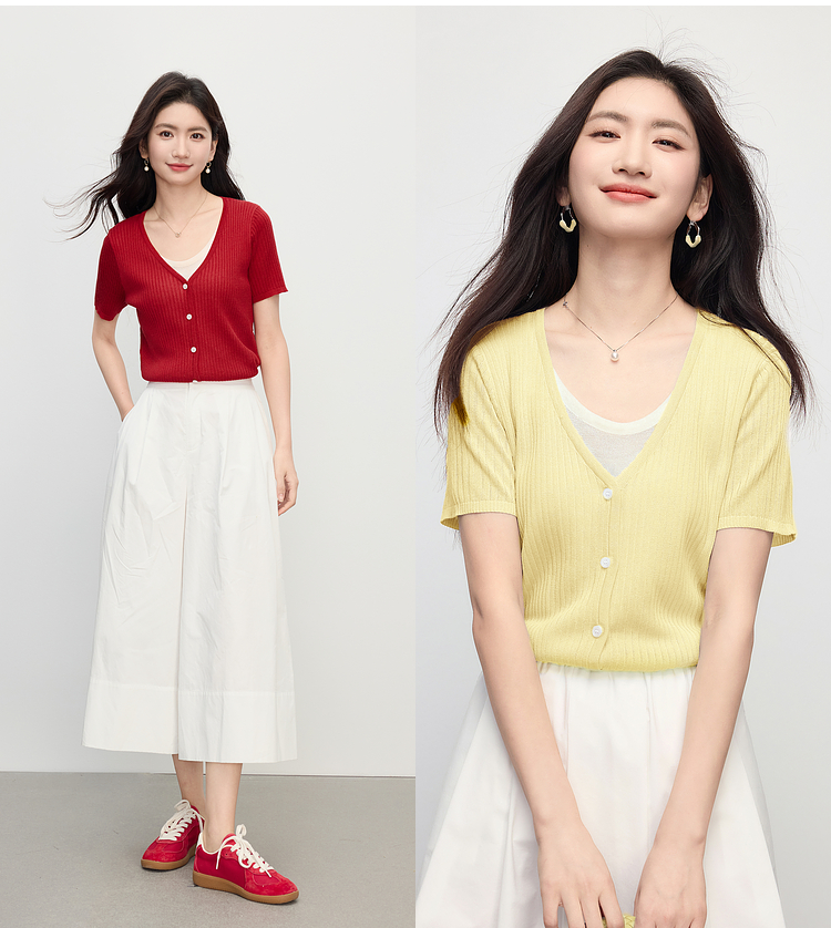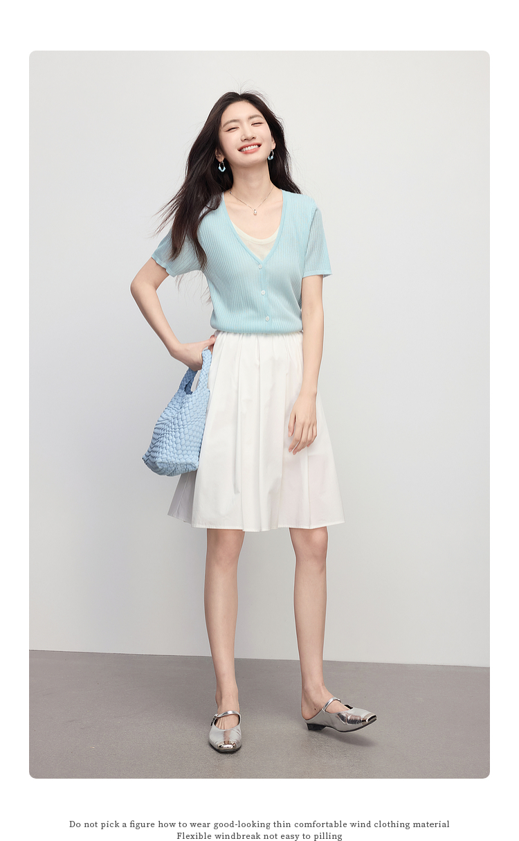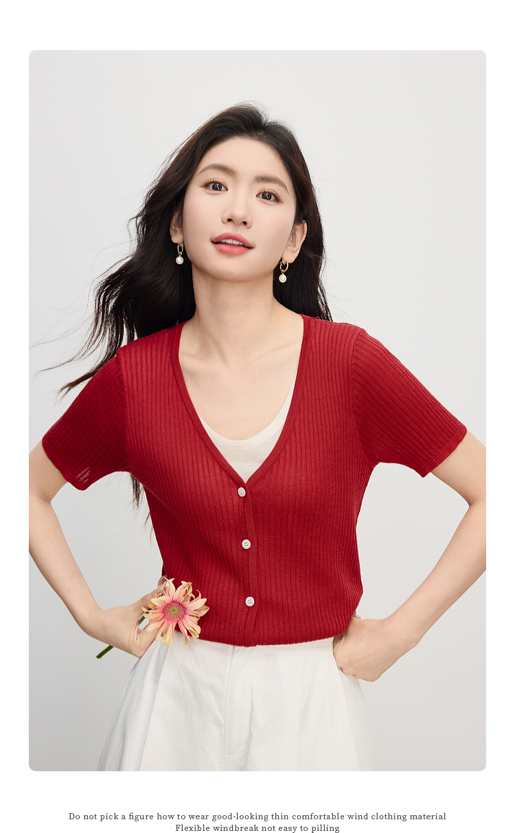 【专属特价】熙世界天丝亚麻薄款针织衫女夏日2025新款撞色圆领短袖假两件上衣