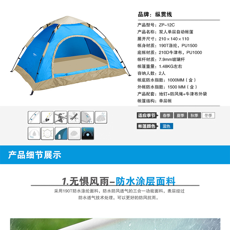 纵贯线双人单层自动帐篷ZP-12C