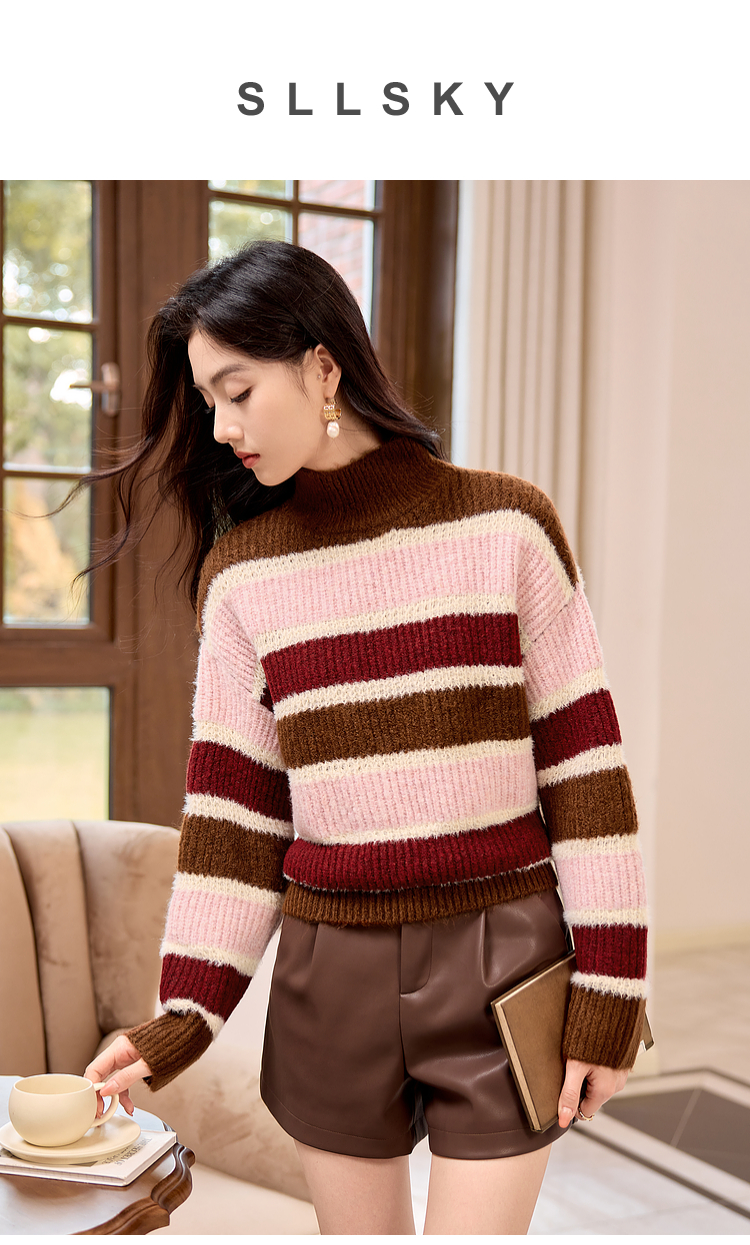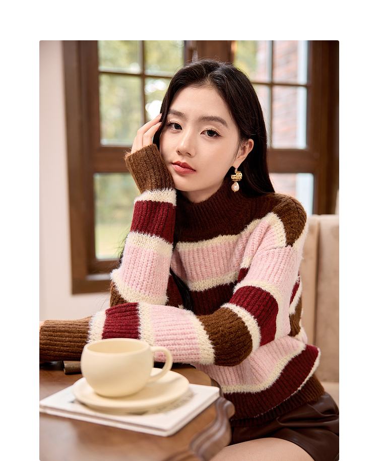 【年终特卖】熙世界复古撞色条纹毛衣冬季新款设计感加厚套头仿水貂毛针织衫