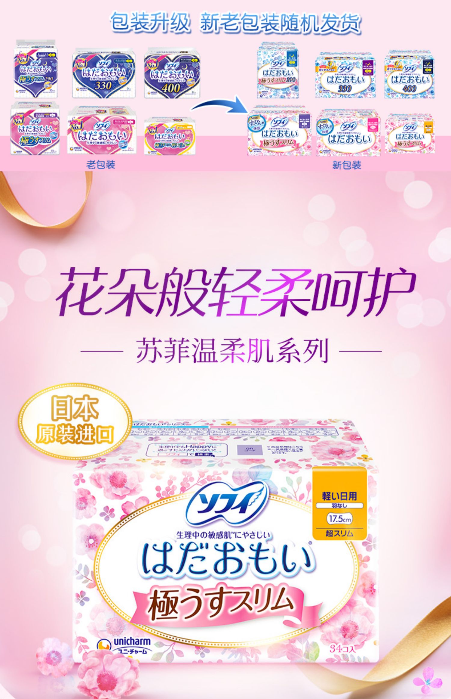 尤妮佳苏菲卫生巾17.5cmx34片/118110 不带护翼轻柔触感温和呵护