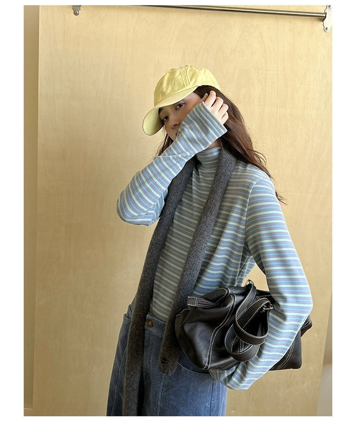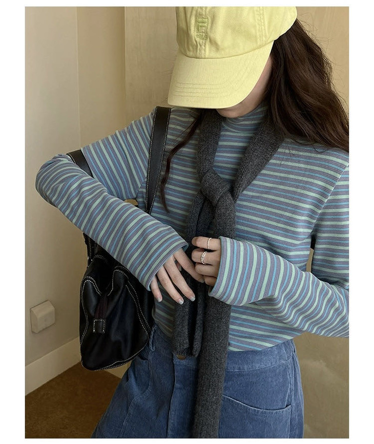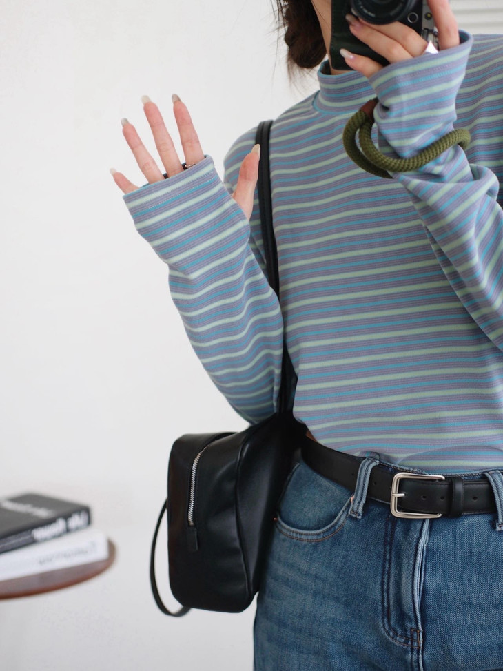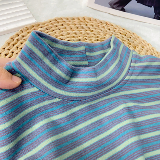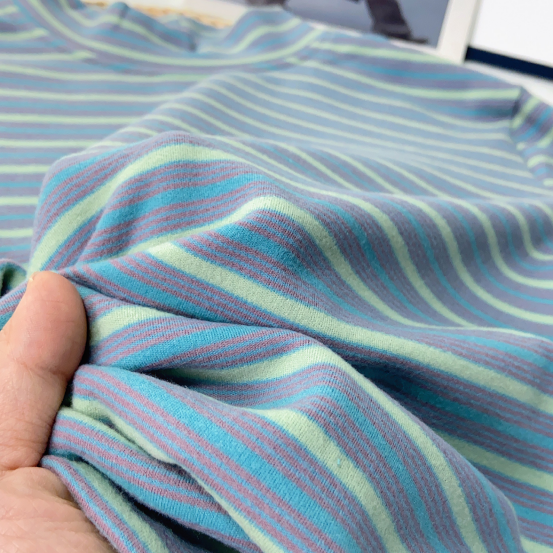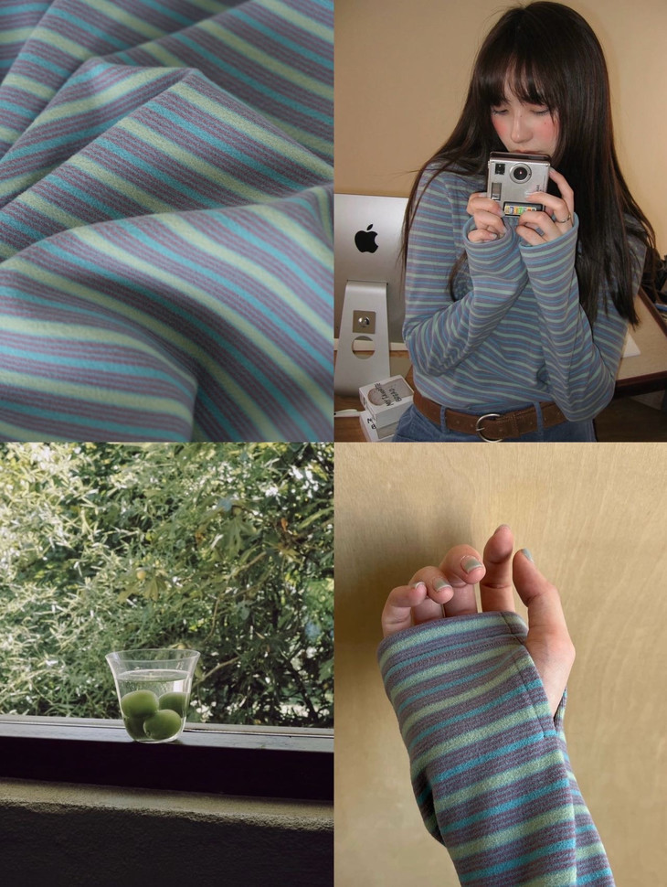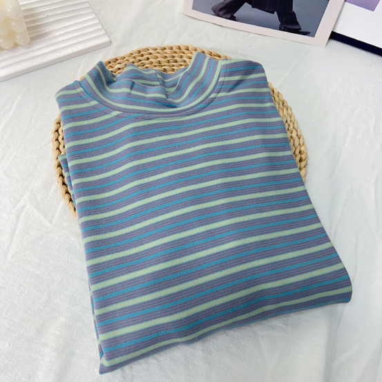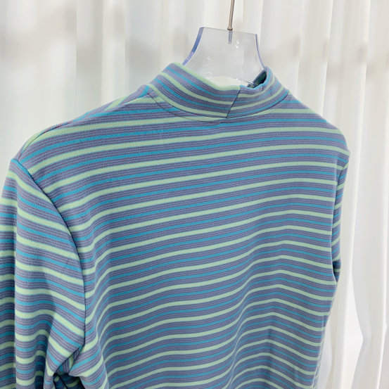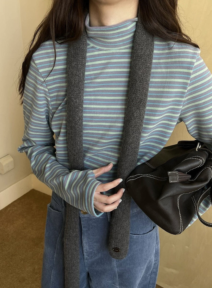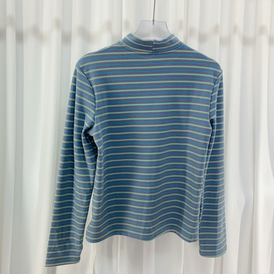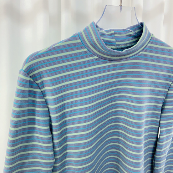 一件为冬日而生的蓝绿条纹火山岩双面德绒打底衫✨ 双面加厚设计无惧寒冬,穿过整季仍保持软糯质感 正肩半高领版型➕显白配色,素颜穿气色也在线🥳 高领边缘做了细腻包边,不磨脖子也不易变形卷边 细条纹排列整齐,衣身无多余线头🧵细节满满 百搭衣柜里所有毛衣和外套,省去额外搭配时间