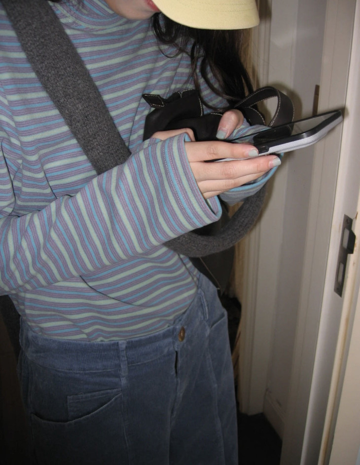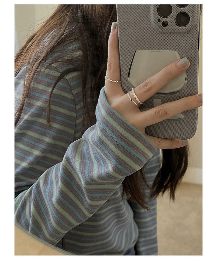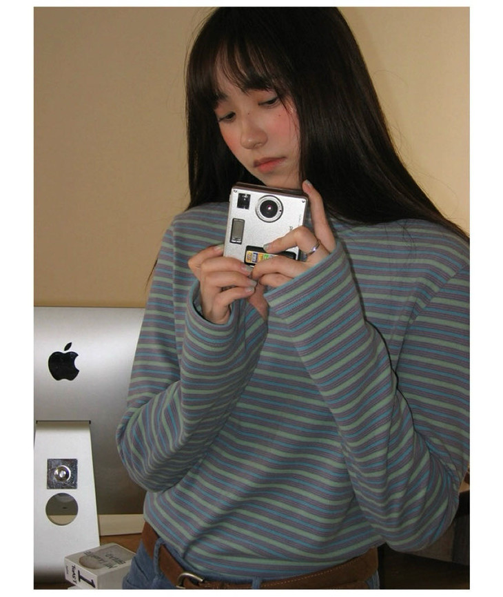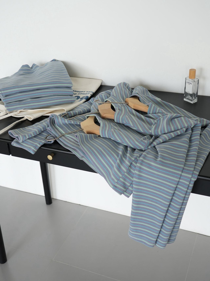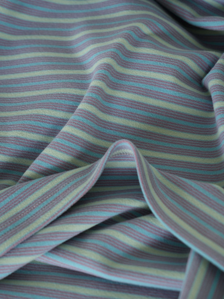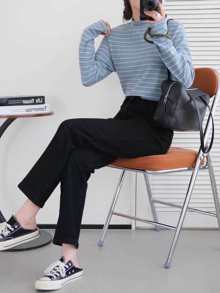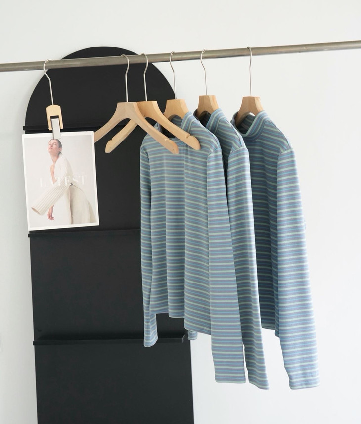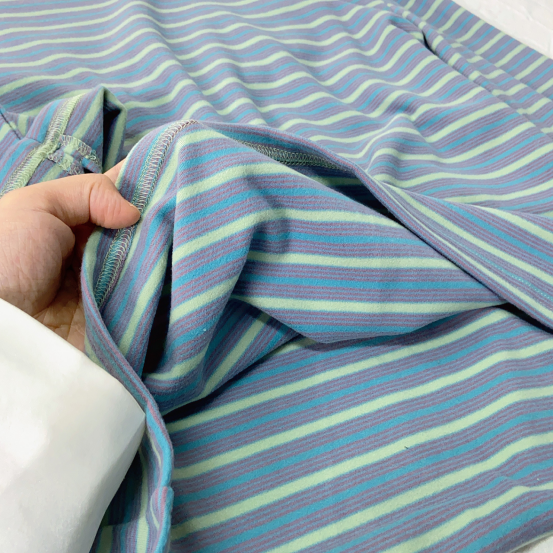 一件为冬日而生的蓝绿条纹火山岩双面德绒打底衫✨ 双面加厚设计无惧寒冬,穿过整季仍保持软糯质感 正肩半高领版型➕显白配色,素颜穿气色也在线🥳 高领边缘做了细腻包边,不磨脖子也不易变形卷边 细条纹排列整齐,衣身无多余线头🧵细节满满 百搭衣柜里所有毛衣和外套,省去额外搭配时间