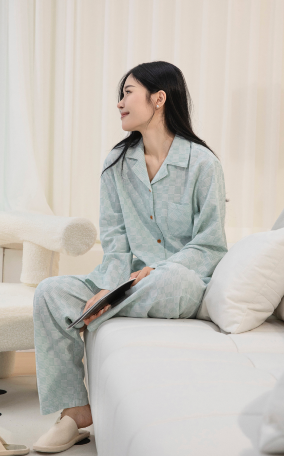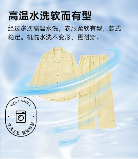 织出的纱线比普通棉更平滑、更密实、触感更柔软,摸起来软软糯糯的。 不仅穿在身上就像躺进一片软绵绵的云朵里,好舒服~ 也相对更不易起球,更耐穿。 针对此双层纱容易破损的问题,宜色家今年升级采用全球质量排名前5%的韧柔纺纱线。 随便洗随便造都不易变形、不易破~ 这里强烈谴责,市面上那些经过软油柔软剂处理的家居服! 不仅洗一次就不软,而且吸湿透气能力还变差了。 玛万家这款就坚守住初心,只用好纱好工艺,再经过高温水洗。 不仅做到了永久天然柔软,而且即便洗了很多遍,也不怕会缩水,反而越洗越柔,越洗越亲肤!