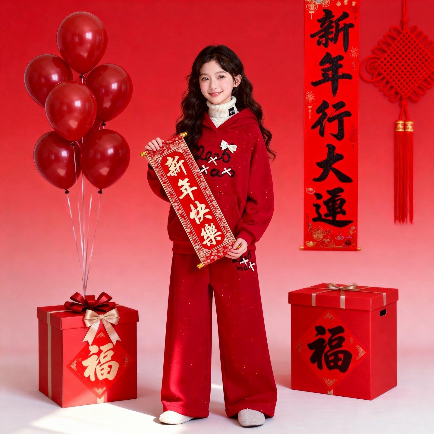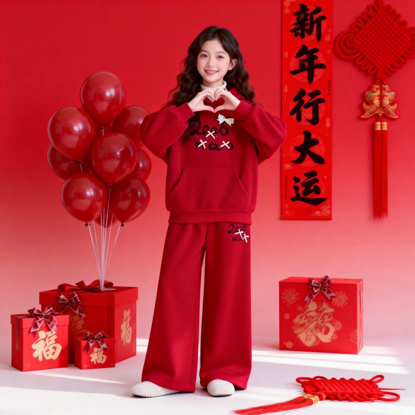 女童秋冬季加绒卫衣套装红色喜庆年服小女孩阔腿裤保暖两件套冬装