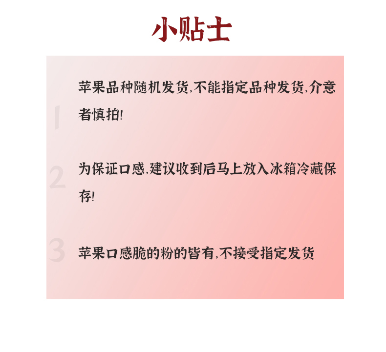 3.苹果品种随机发货,不能指定品种发货,介意者慎拍!