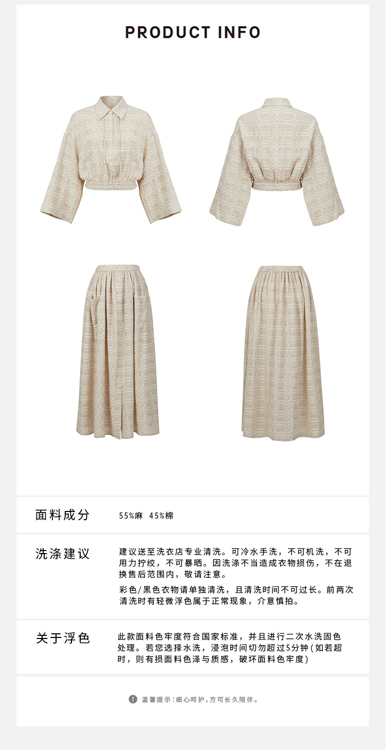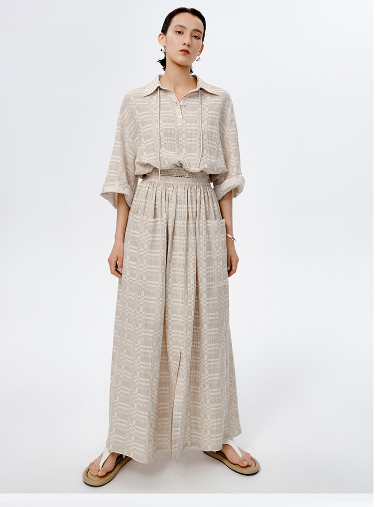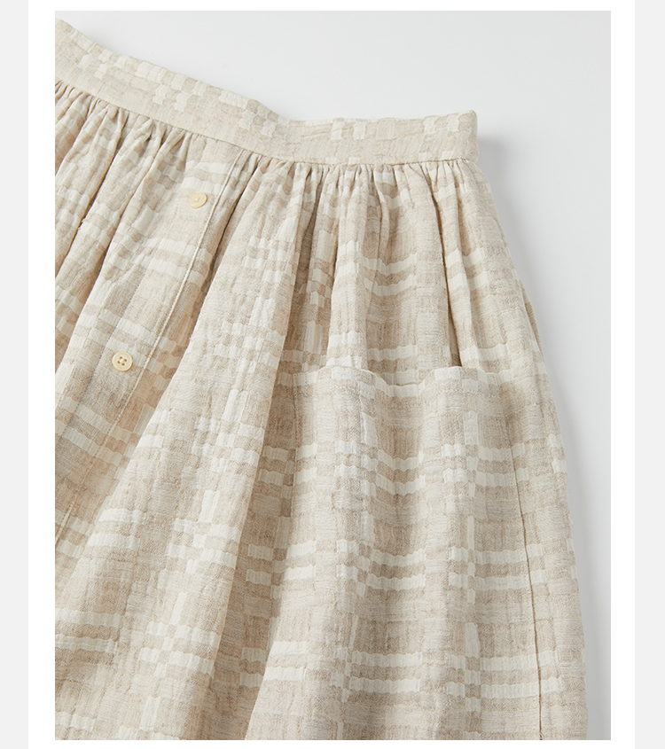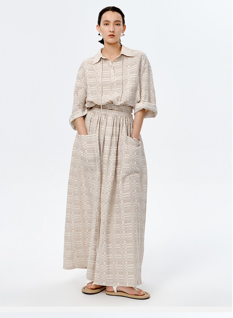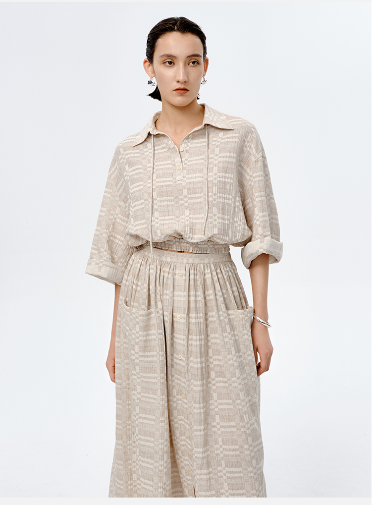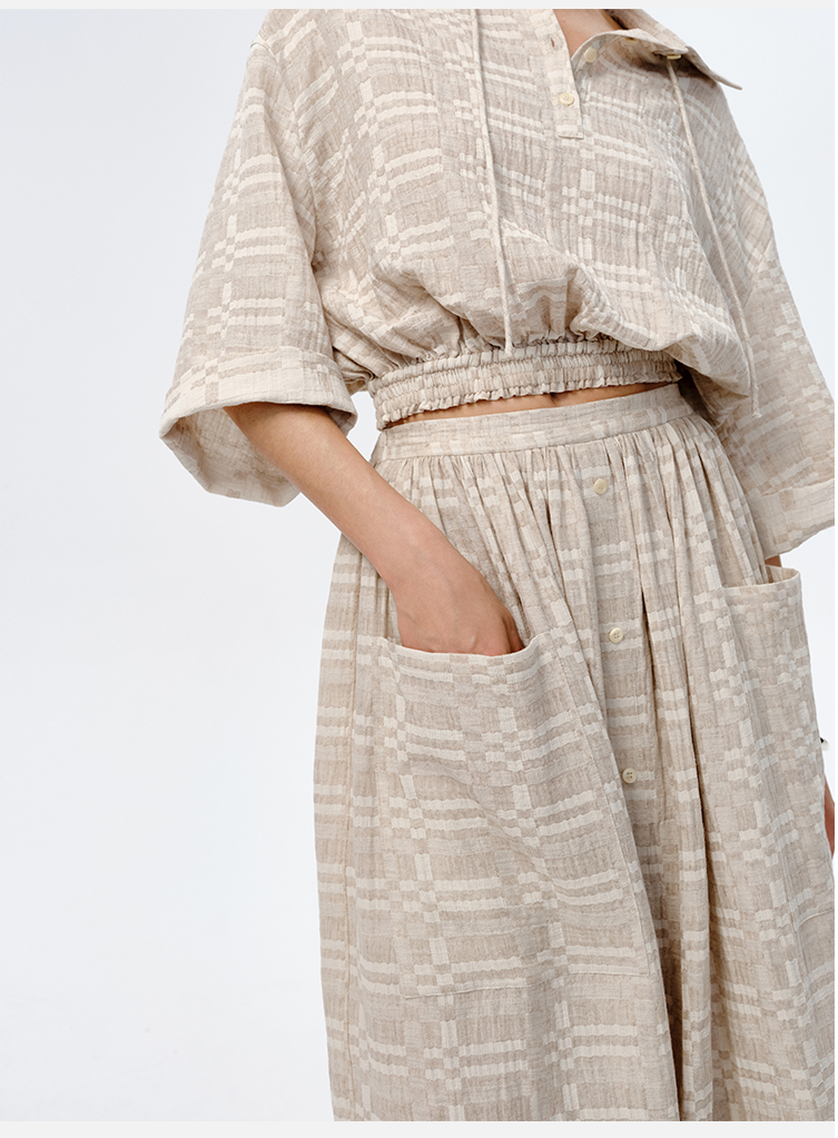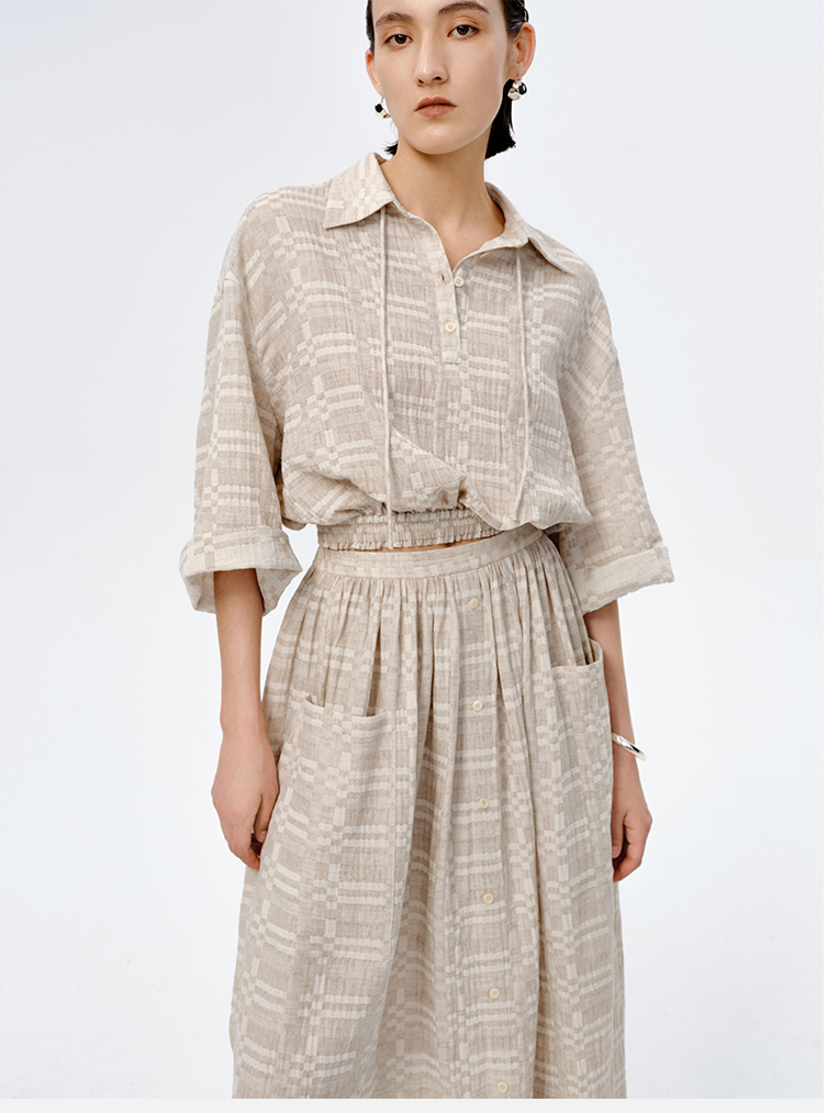 HIDEMI 格纹浮雕色织艺术亚麻套装 衬衫/口袋半裙