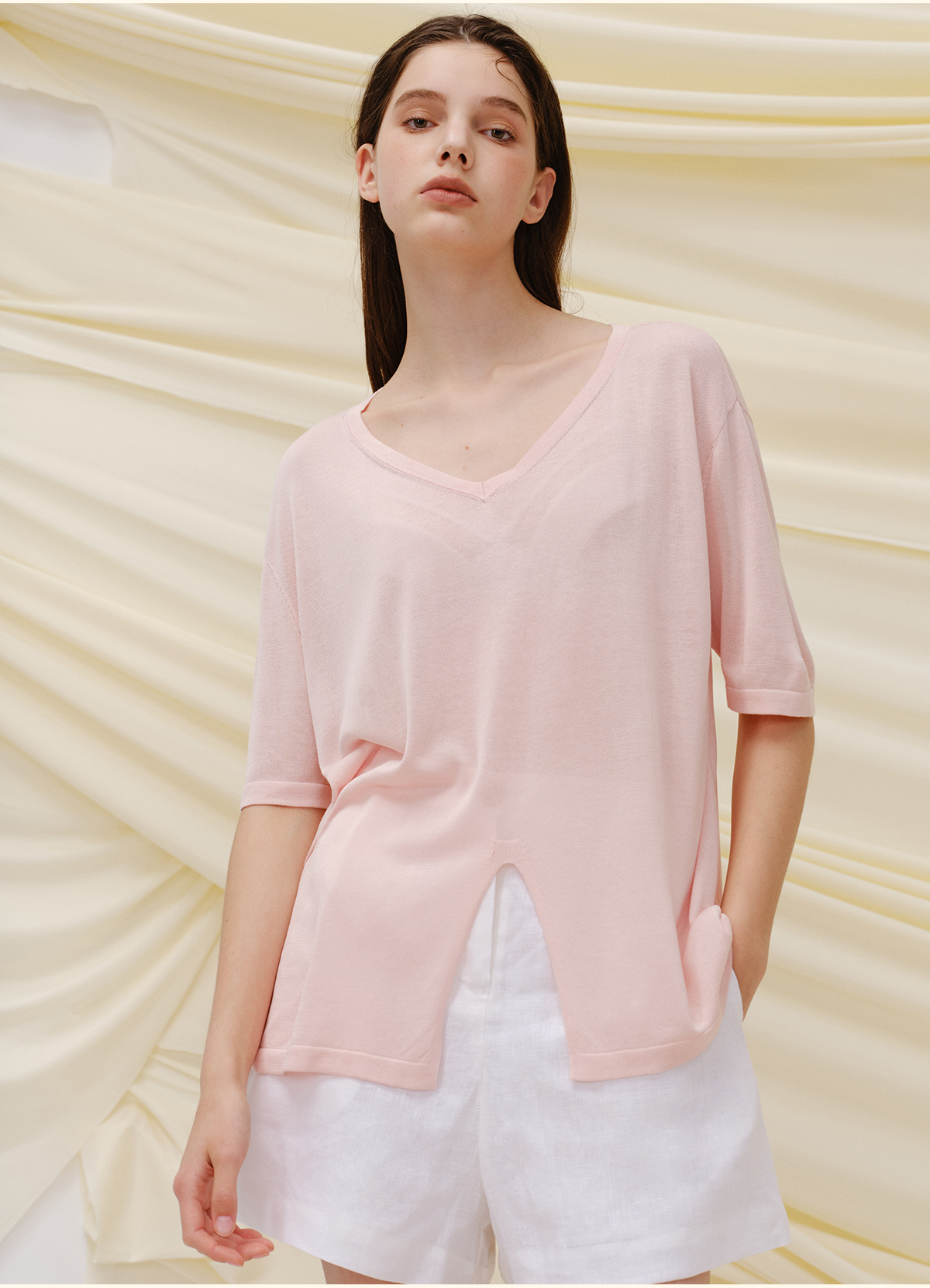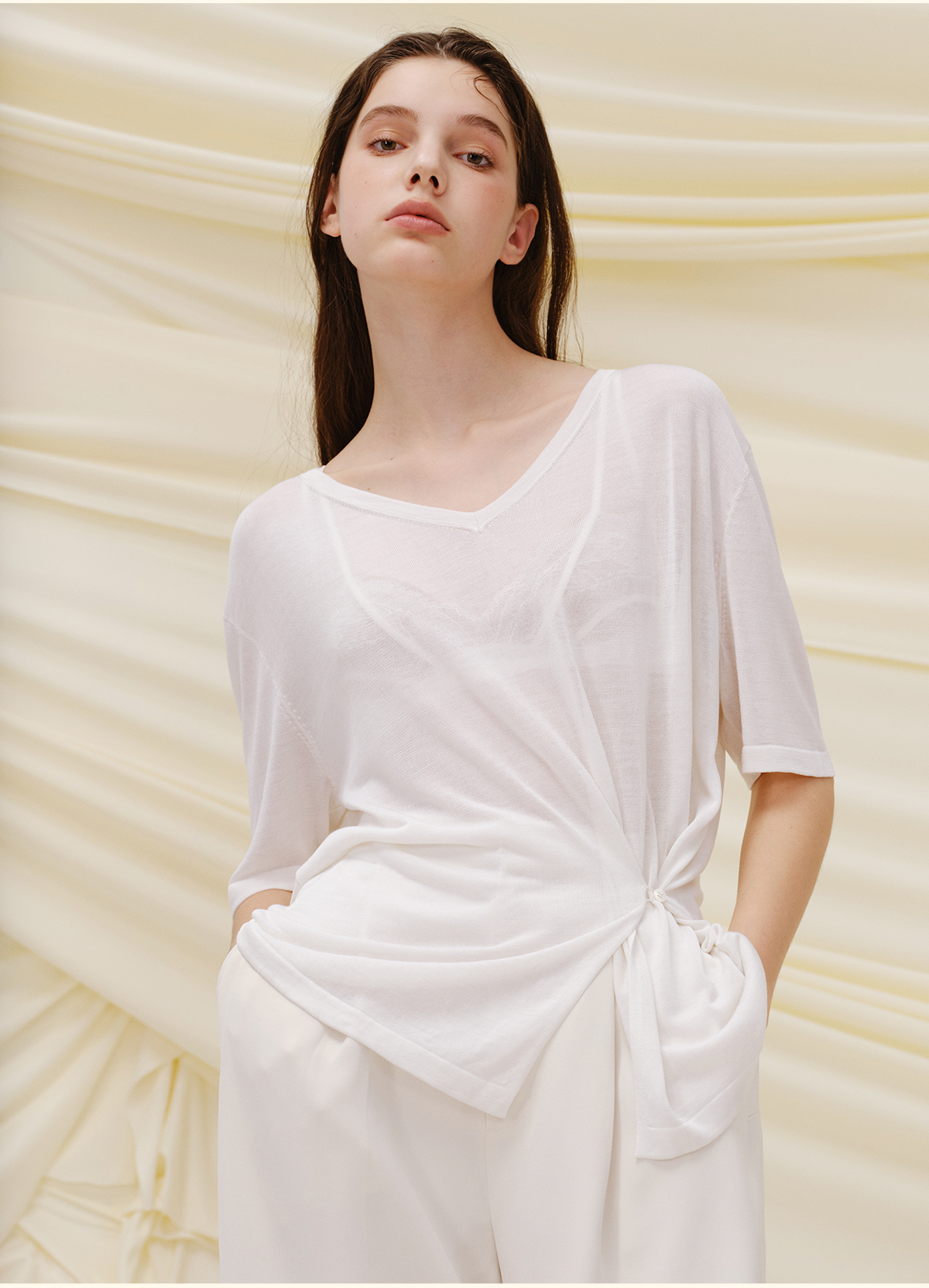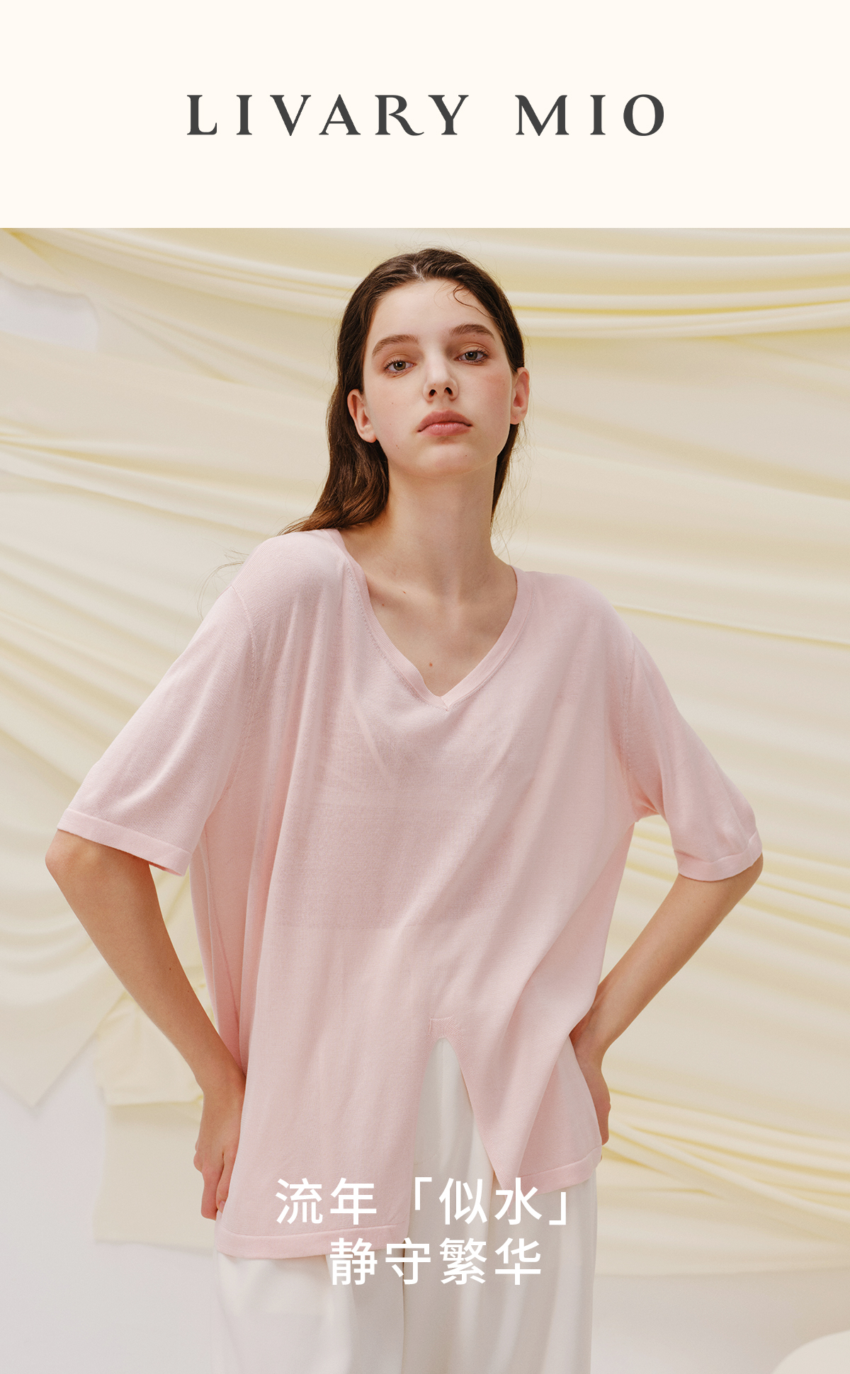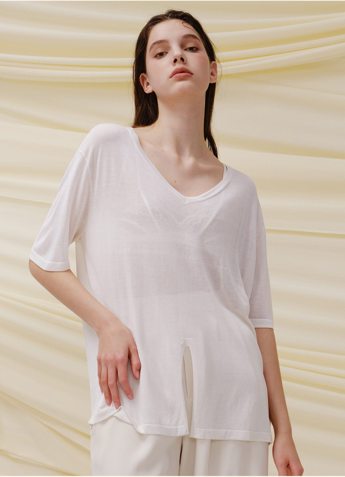 里性 LIVARY MIO 似水-Watery V领半透真丝针织T恤不规则下摆短袖