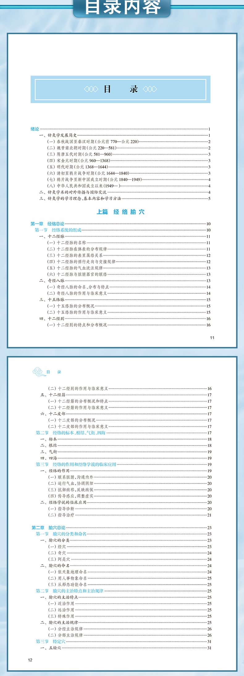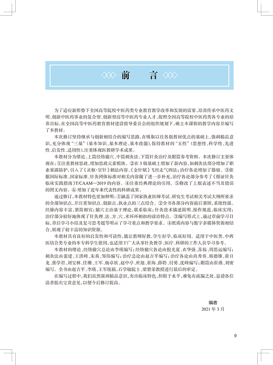 本教材系国家卫生健康委员会 “十四五”规划教材、全国高等中医药教育本科教材之一。本教材分为绪论、上篇经络脸穴、中篇刺灸法、下篇针灸治疗及附篇参考资料。注重教材思政,增加思政元素模块。在 3 版基础上增加了新内容如刺灸法部分,增加了职业暴露防护,引入了《灵枢·官针》刺法内容、《金针赋》飞经走气四法;治疗各论增加了筋瘤。依据国际标准、国家标准、针灸团体标准对相关内容做了进一步补充,治疗各论部分参考了《循证针灸临床实践指南》T/CAAM一2019 的内容。注重经典理论的引用。全书中经脉内容丰富,繁简相宜;胸穴主治基于理论,联系临床;针灸技术描述简明、操作规范,临床实用;治疗部分较好地体现了针灸理、法、方、穴、术环环相扣的诊治特点。此次修订还增加数字资源内容,做到纸数融合、医教协同,学生好用,老师好教,临床好用。本教材供全国各高等学校中医药类专业使用。