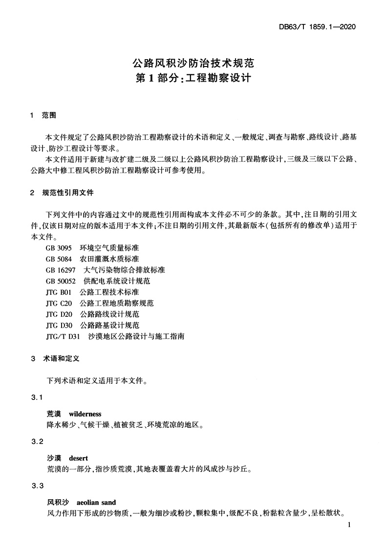 书名:公路风积沙防治技术规范 第1部分:工程勘察设计(DB63/T 1859.1—2020)