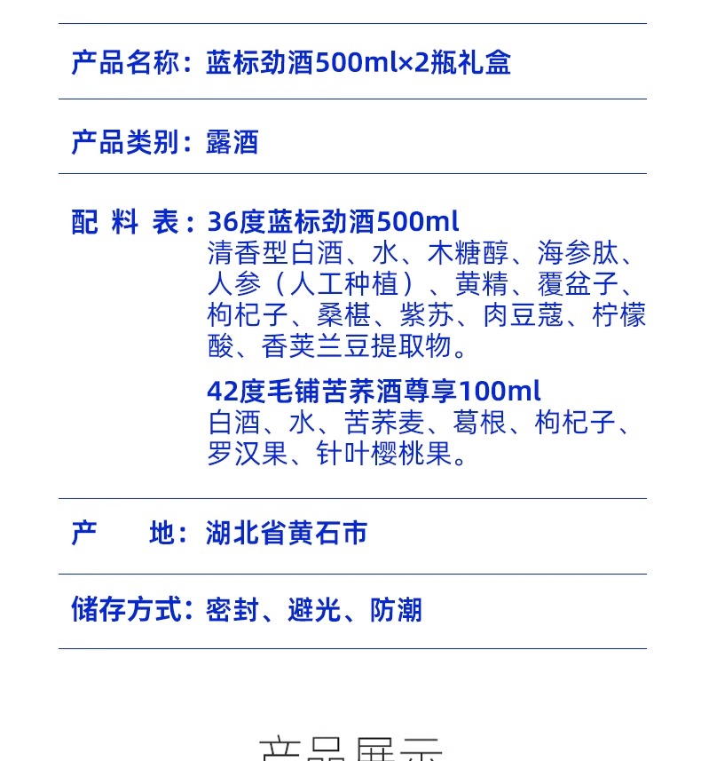 36°蓝标劲酒 500ml*2 礼盒装(赠毛铺尊享100ml*2瓶)